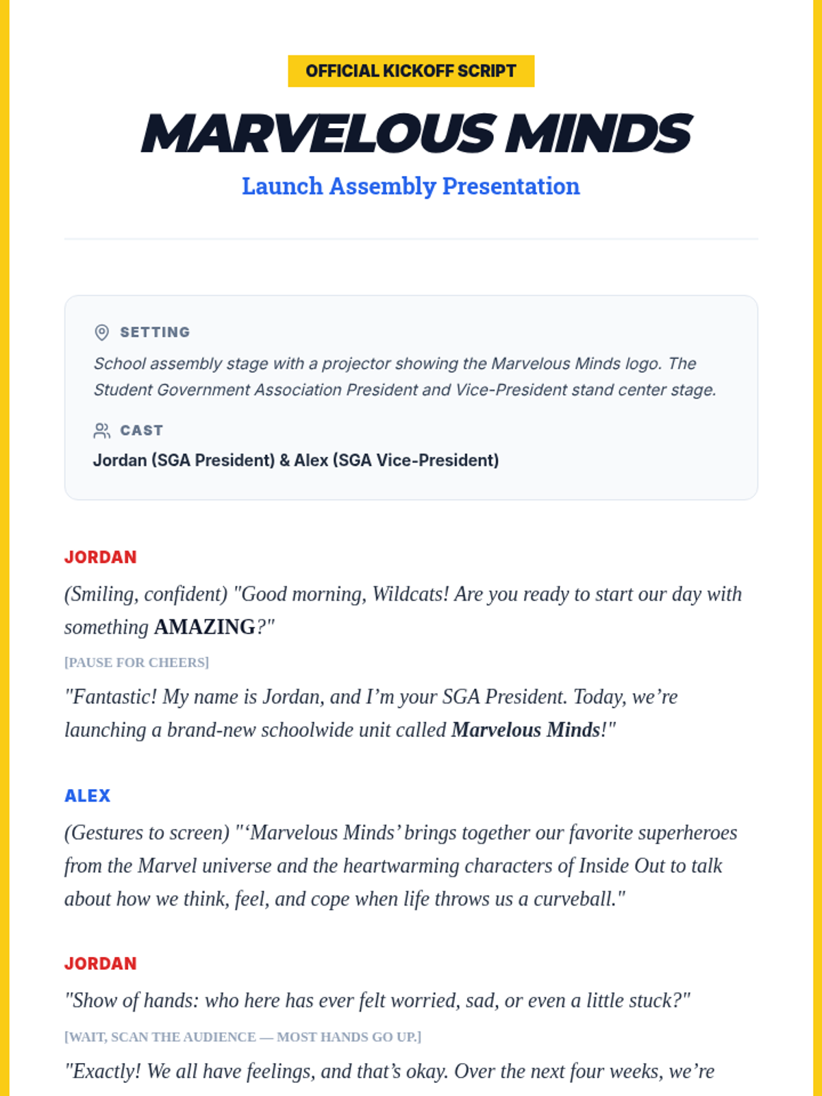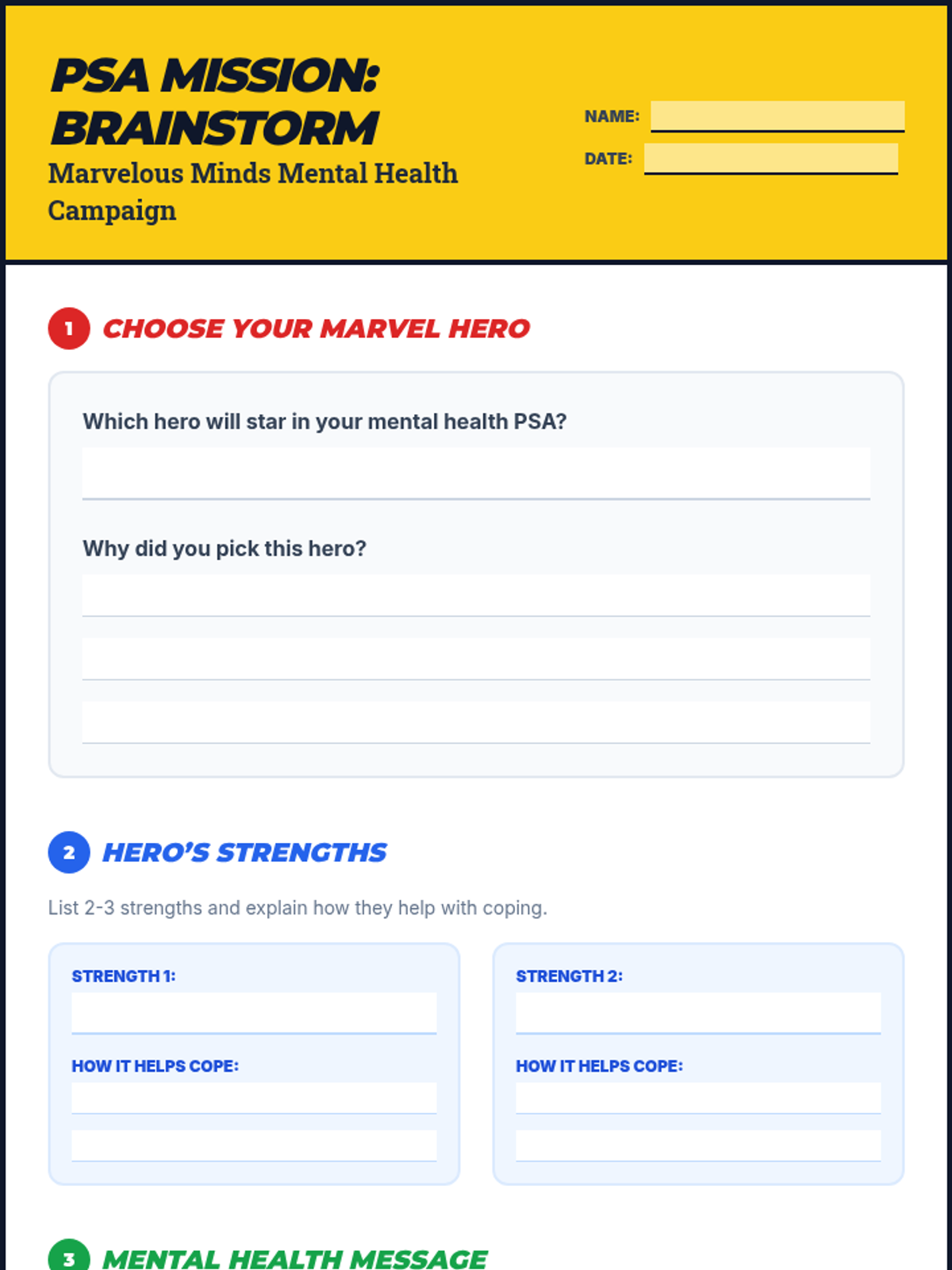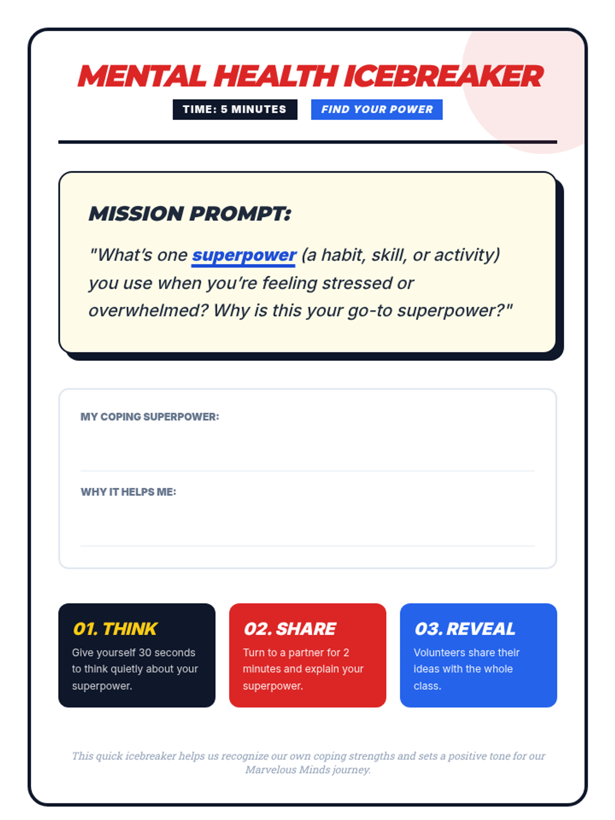 A 4-session mental health unit for 6th graders that uses Marvel heroes and Inside Out to explore emotions, strengths, and coping strategies. The unit culminates in a Black Boy Joy talent showcase during Mental Health Awareness Month.