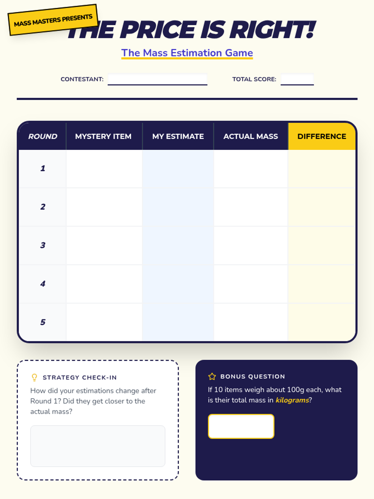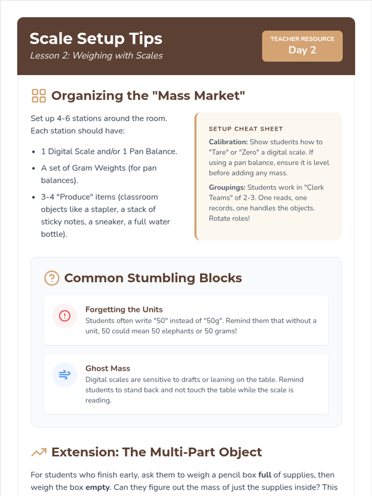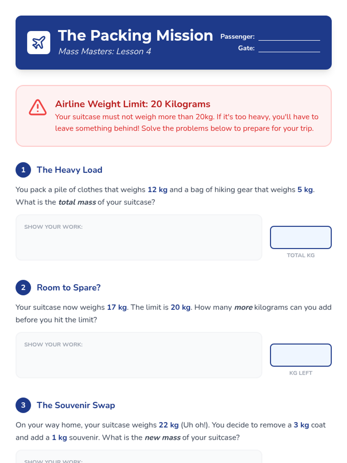 A comprehensive unit for 3rd graders to master the concept of mass. Students progress from distinguishing between grams and kilograms using physical benchmarks to using scales, estimating mass, and solving multi-step word problems involving measurement.