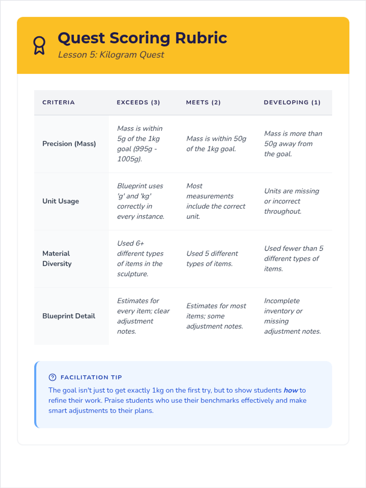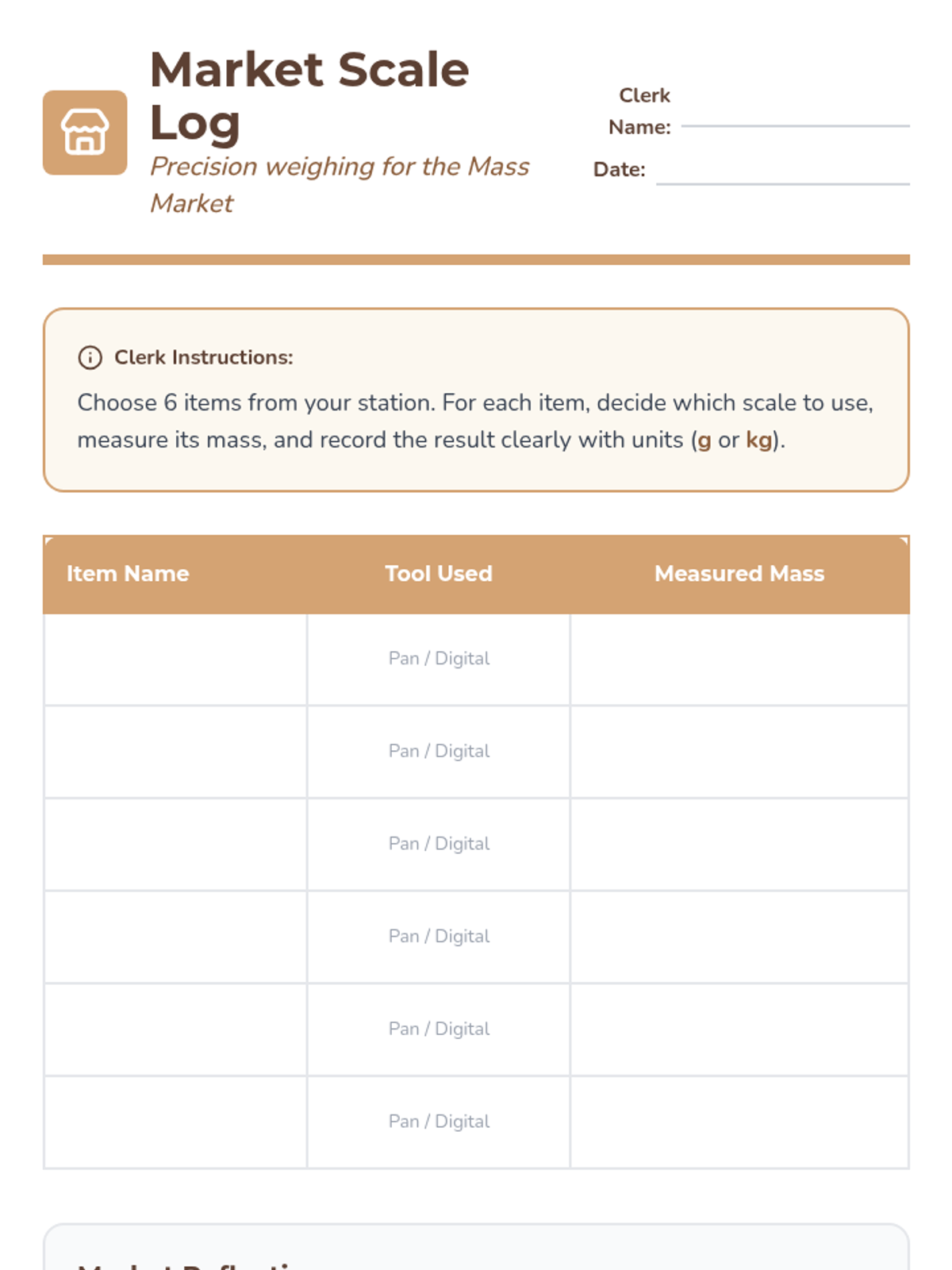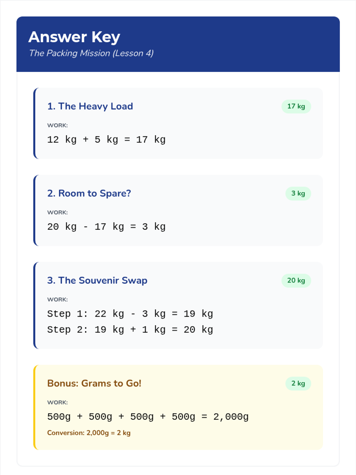 A comprehensive unit for 3rd graders to master the concept of mass. Students progress from distinguishing between grams and kilograms using physical benchmarks to using scales, estimating mass, and solving multi-step word problems involving measurement.