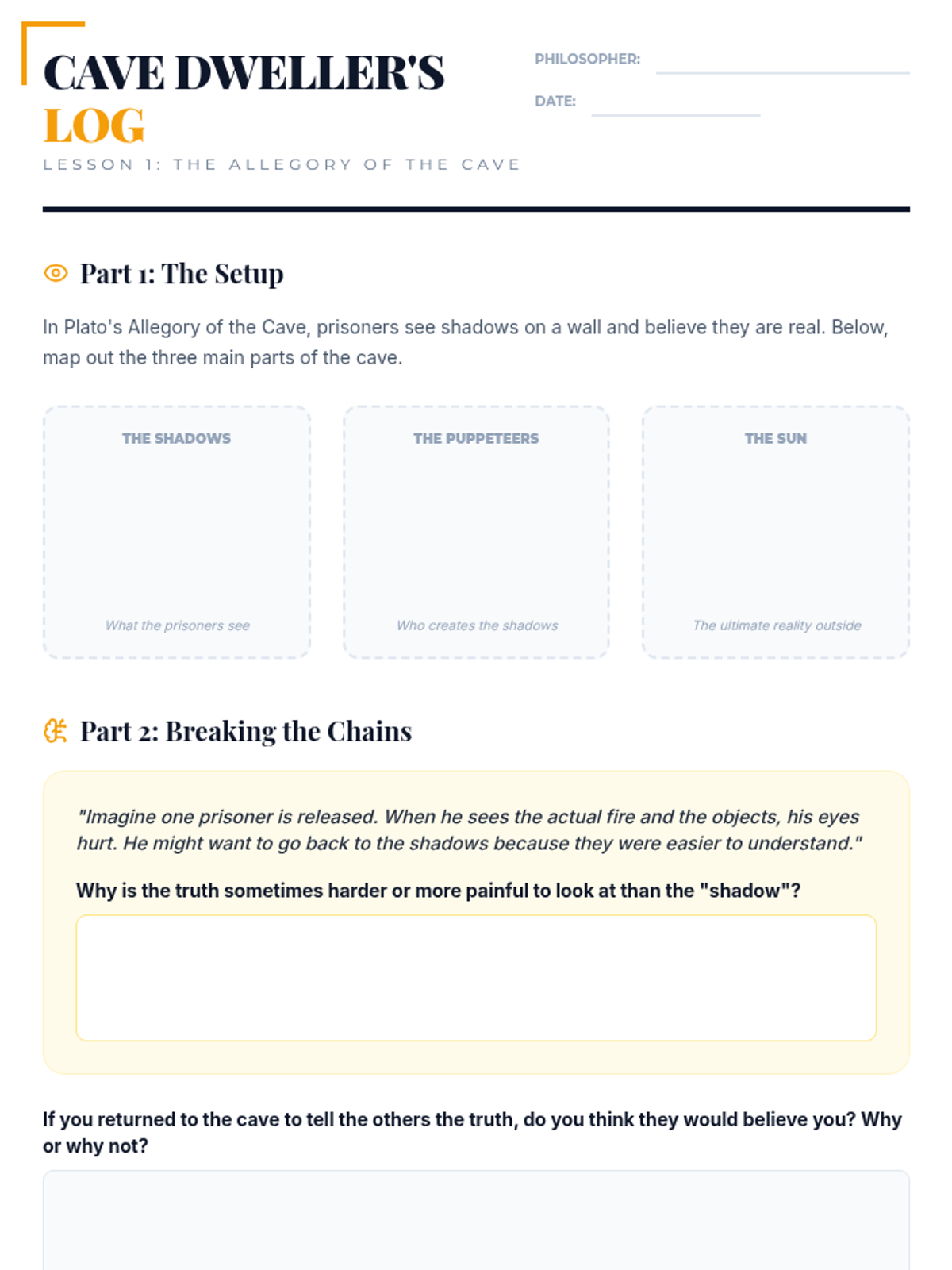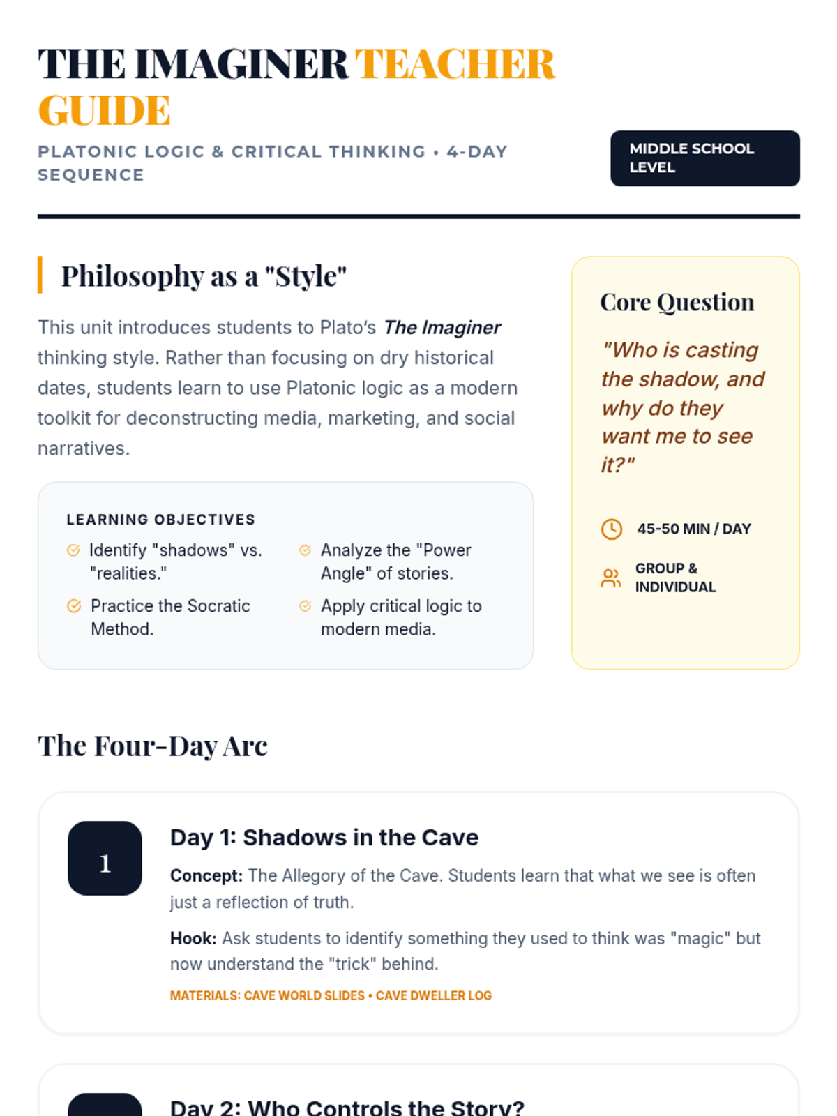 A four-day introductory logic and philosophy sequence for middle schoolers focusing on Plato's 'Thinking Style.' Students explore the Allegory of the Cave, perception vs. reality, and the Socratic Method through the lens of 'The Imaginer,' culminating in a visual analysis game.