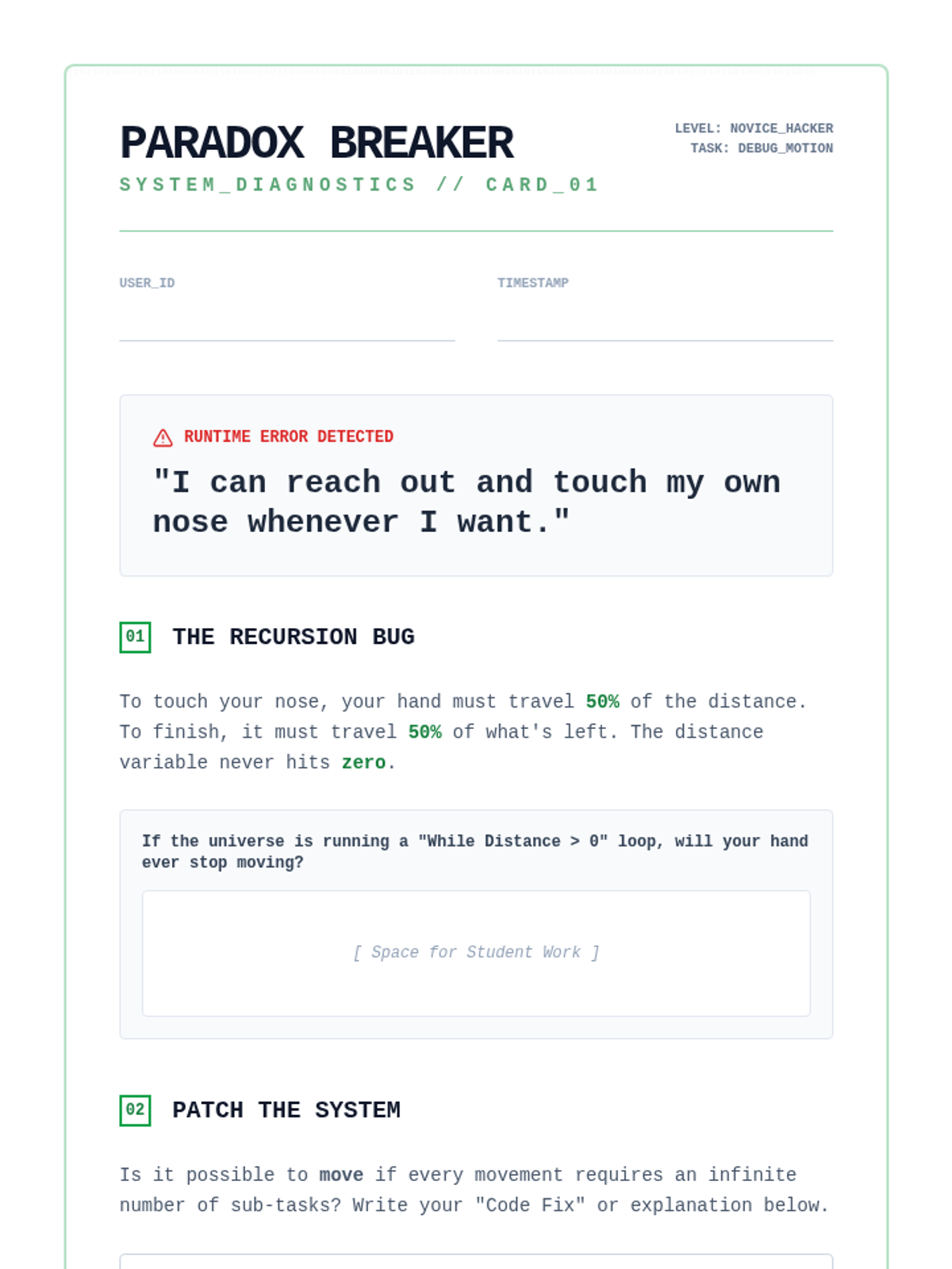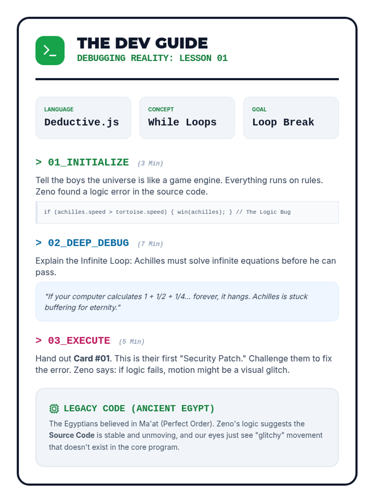A series of four 10-15 minute logic lessons for middle school students, focusing on Zeno's paradoxes and the 'Paradox Player' thinking style. Students will learn to break ideas into tiny steps, push logic to extremes, and identify contradictions through 'Paradox Breaker' activities.