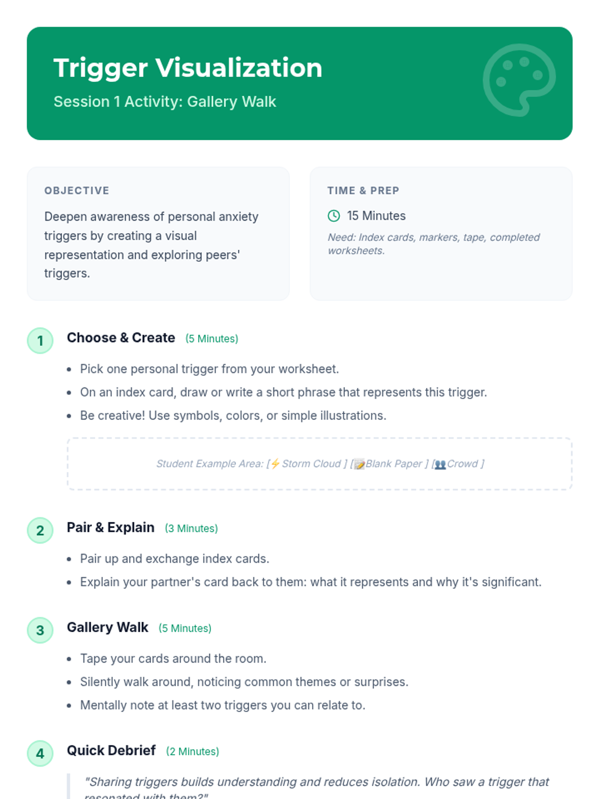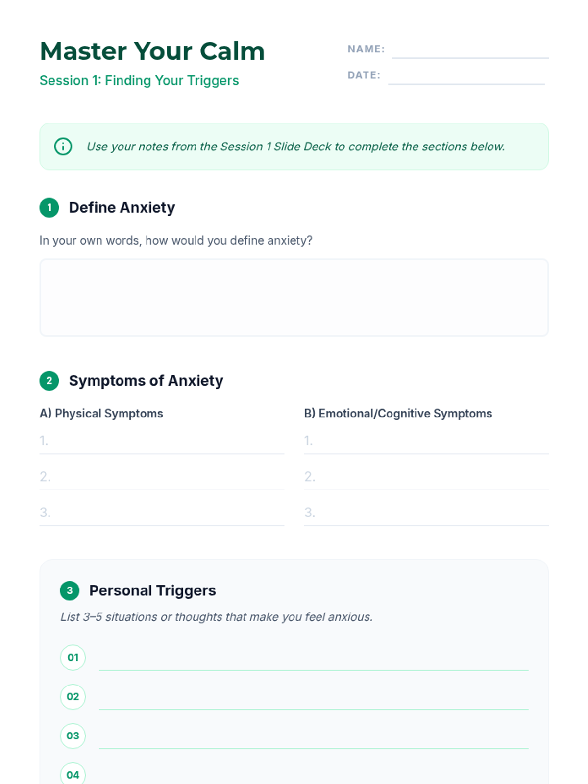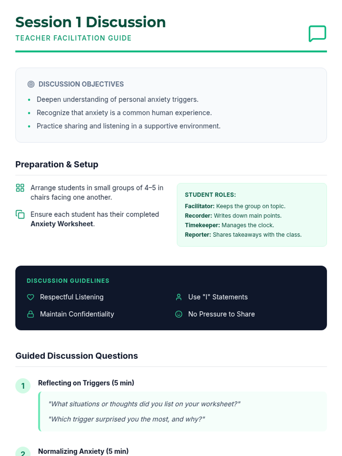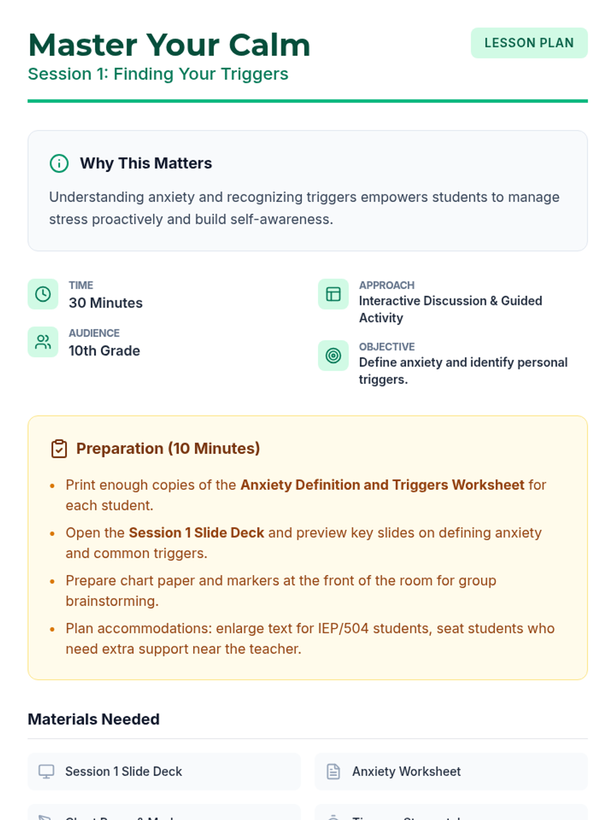 In this 6-session group unit, 10th graders will explore and practice effective coping skills for anxiety through discussion, hands-on activities, and reflective worksheets. Building a toolkit of strategies will empower students to recognize triggers, manage anxious thoughts, and create healthy routines, making a real difference in their daily lives.