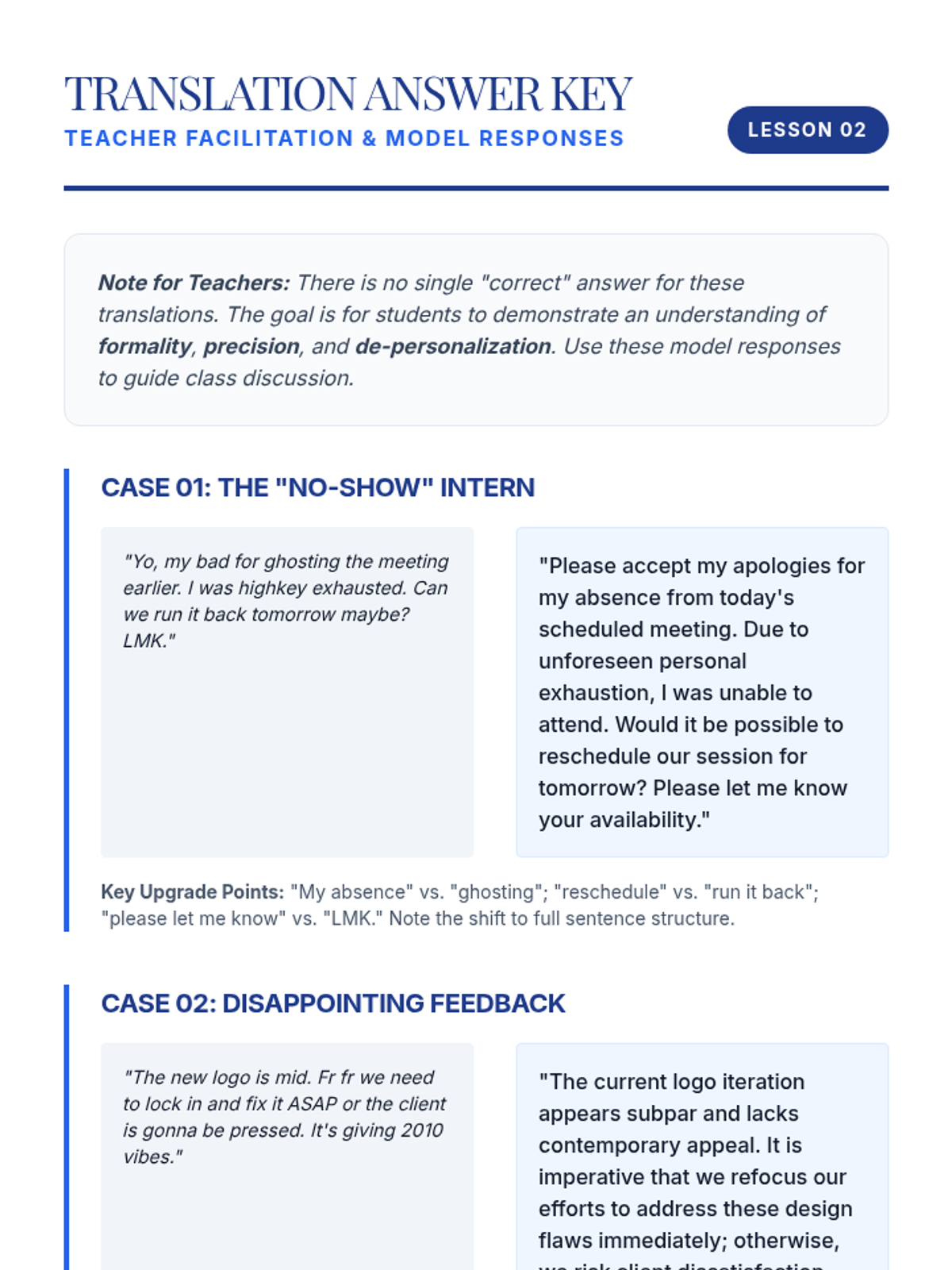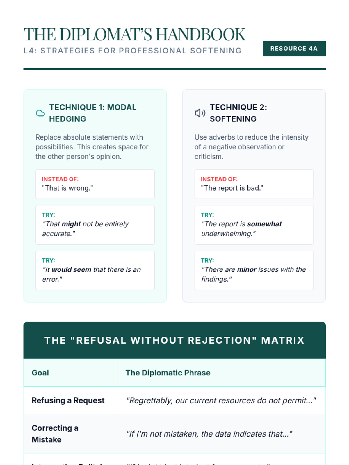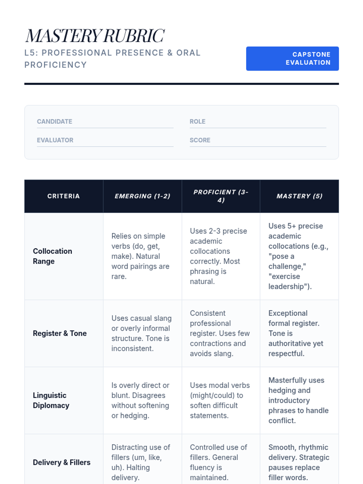 A 5-lesson sequence for 9th Grade Advanced English students focusing on academic collocations, professional register, and diplomatic language to enhance professional credibility and fluency.