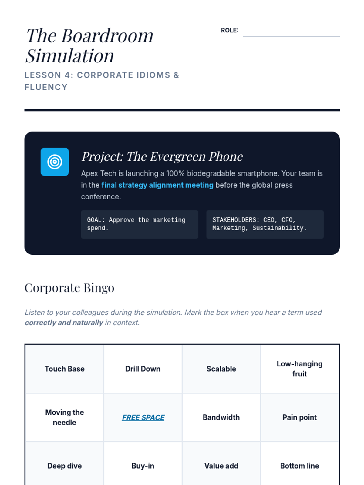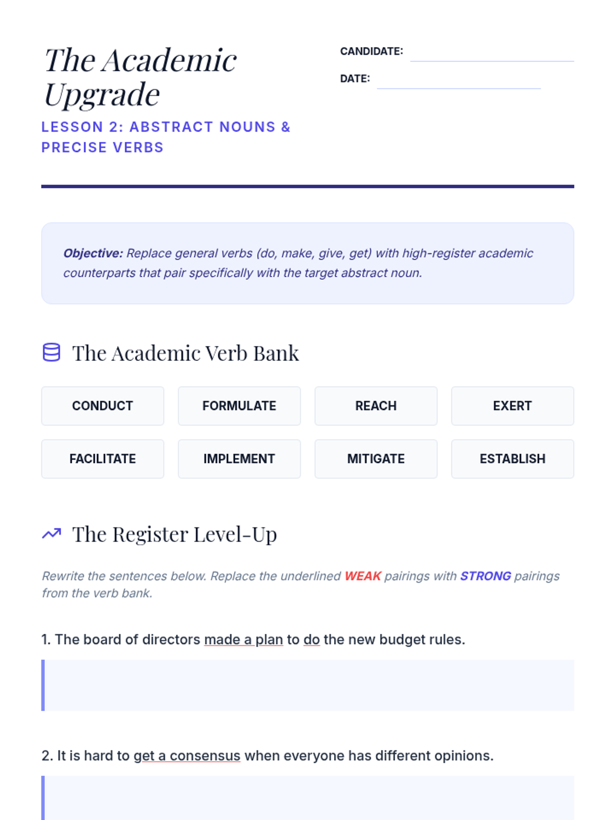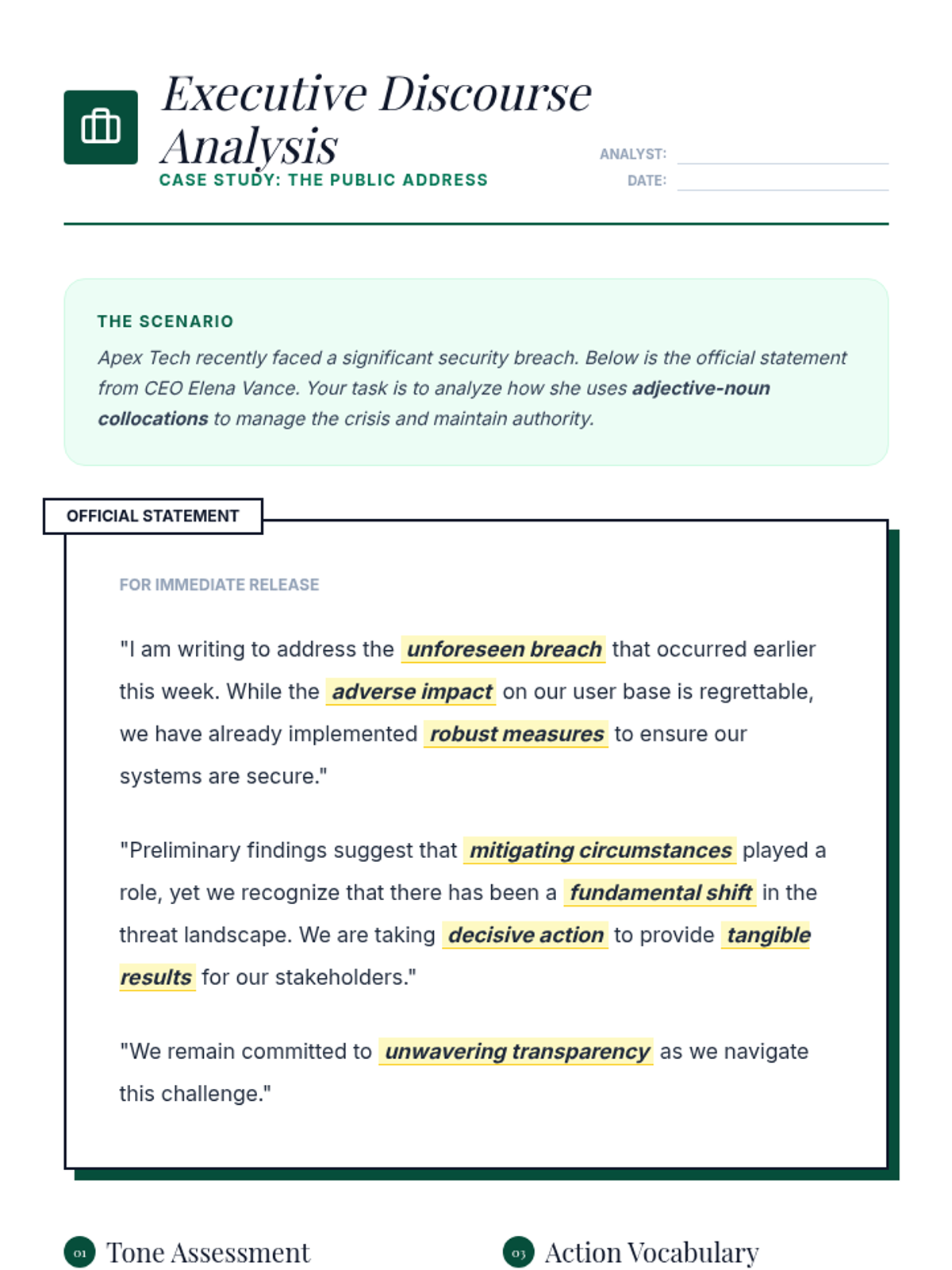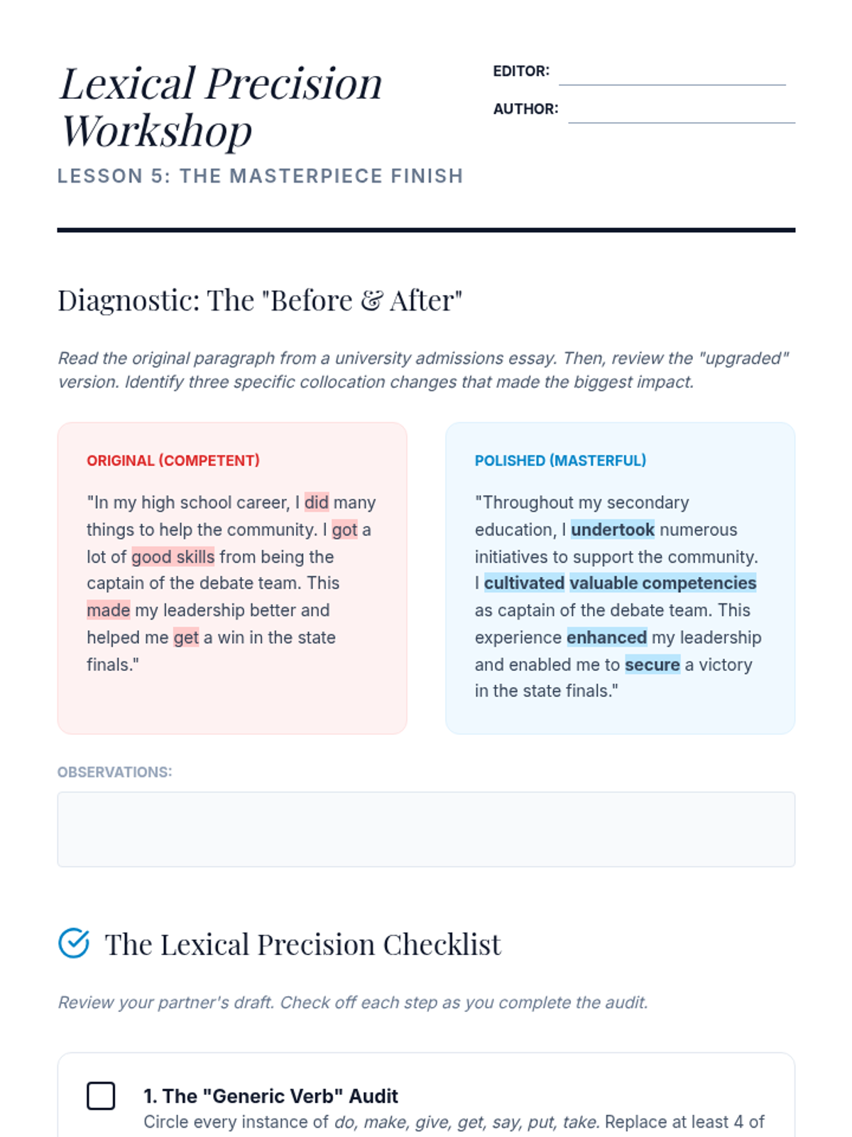 A comprehensive 12th-grade sequence designed to elevate students' English from general fluency to advanced professional and academic mastery through the study of collocations and register. Students will learn to select word pairings that enhance credibility, authority, and precision in university and corporate contexts.