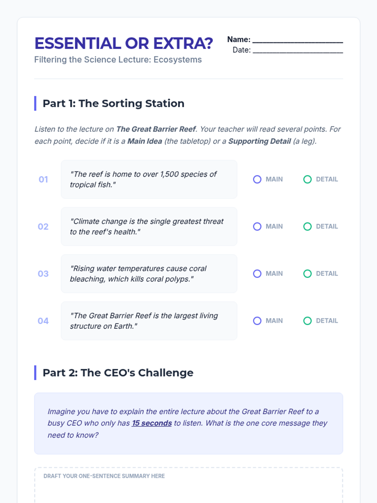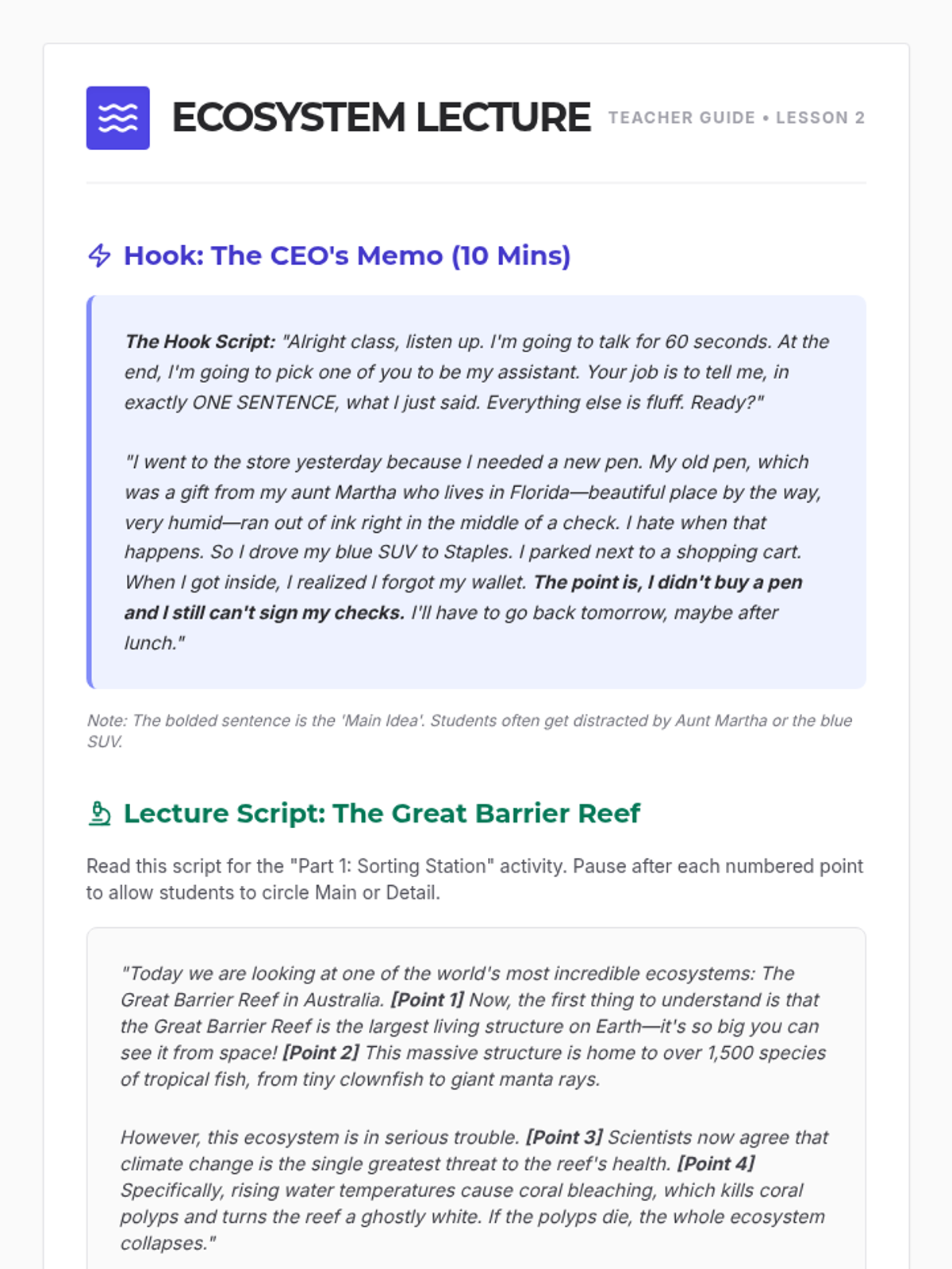A comprehensive workshop-style unit for 6th Grade ESL students focused on the linguistic mechanics of paraphrasing and synthesizing information. Students move from identifying core concepts to orally retelling information, transforming individual sentences, and finally weaving multiple sources into a single coherent paragraph without plagiarizing.