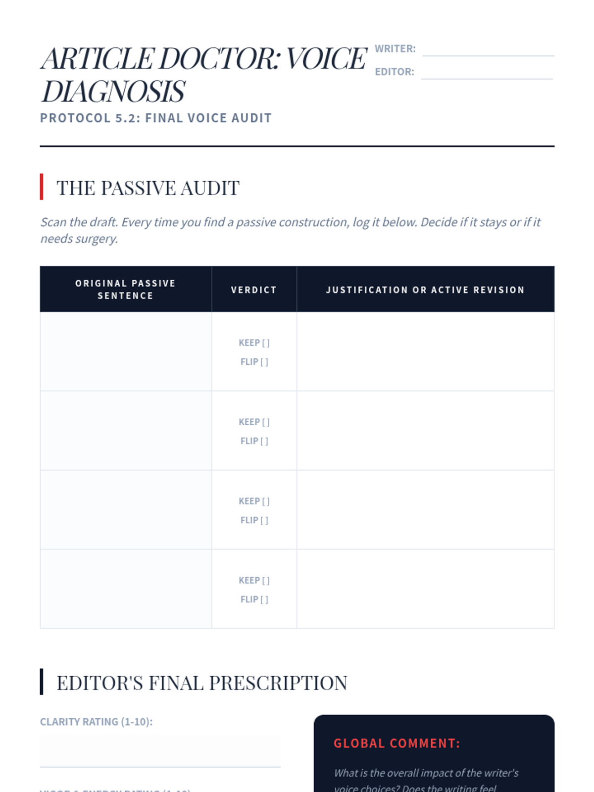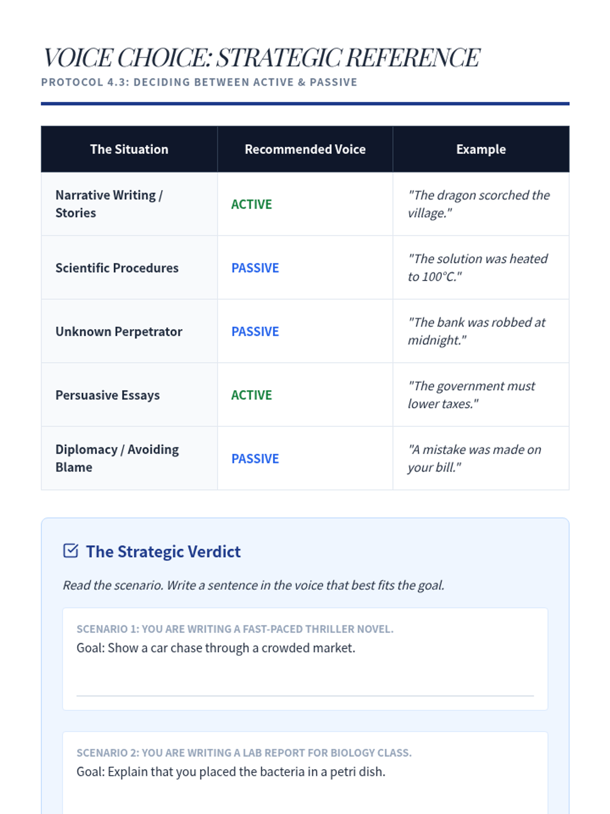 A comprehensive writing workshop that moves 9th-grade students from basic recognition of active and passive voice to stylistic mastery, focusing on clarity, vigor, and intentional rhetorical choices.