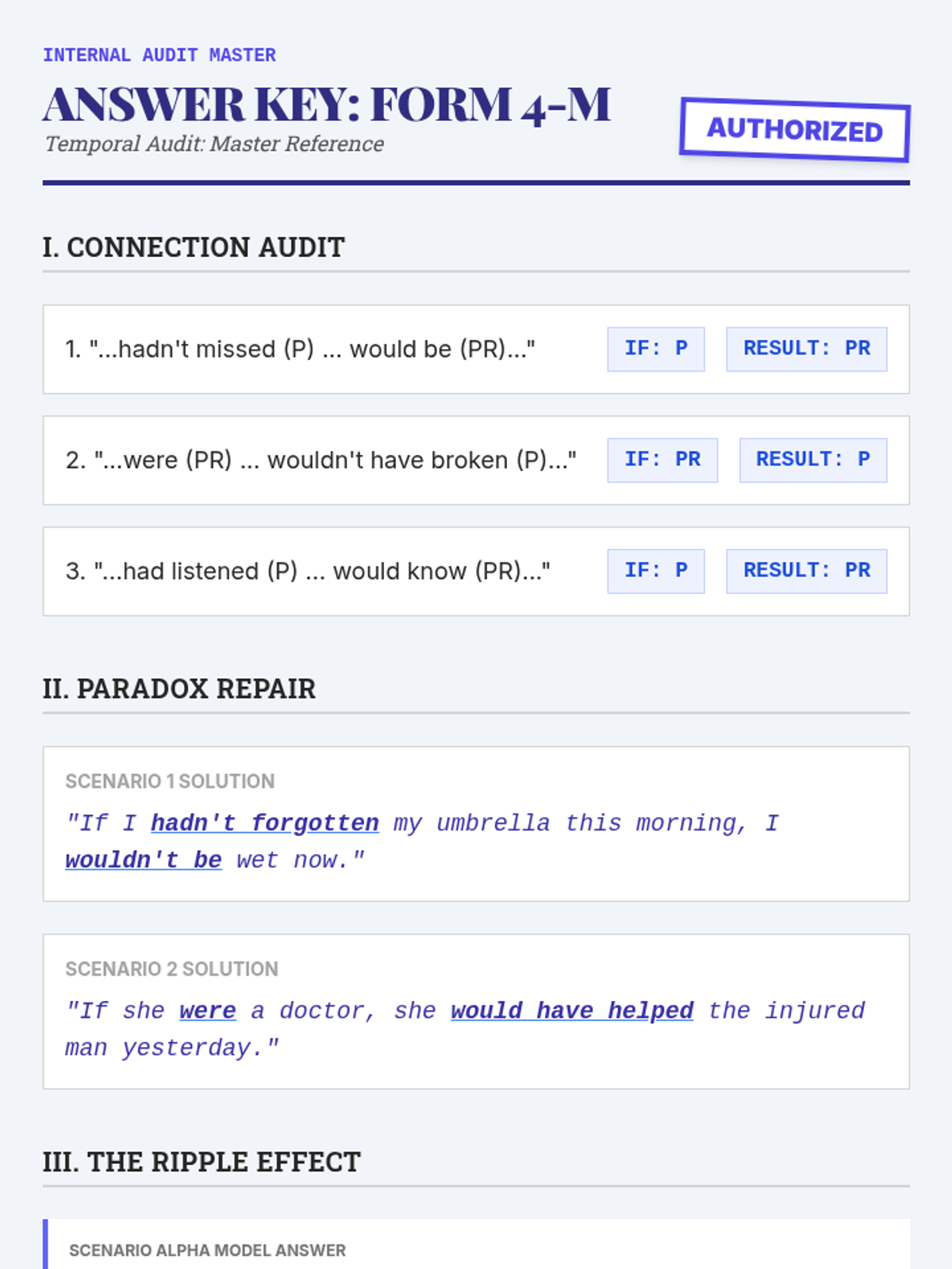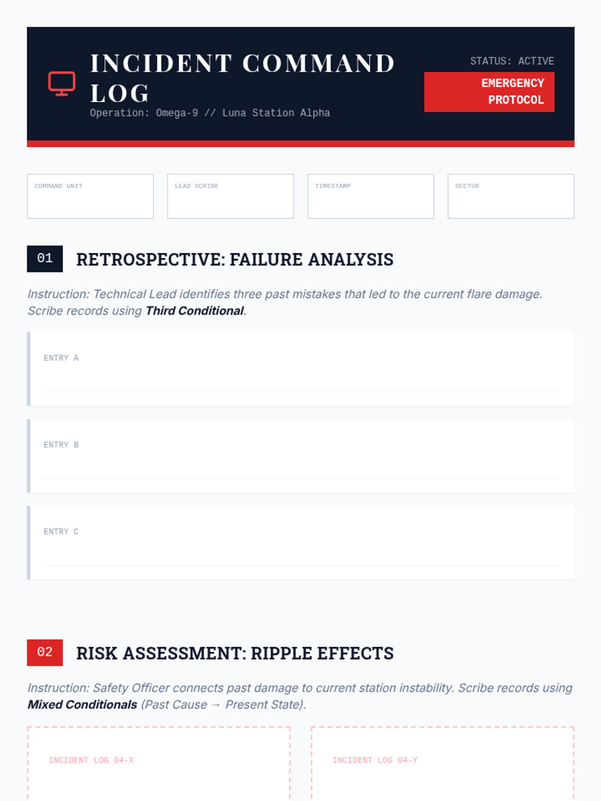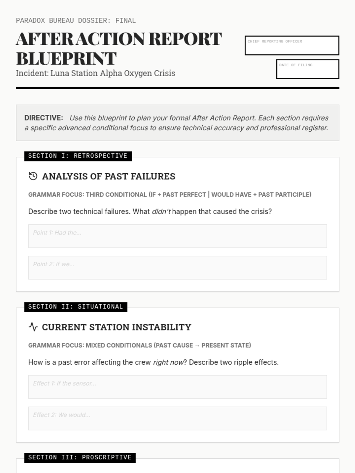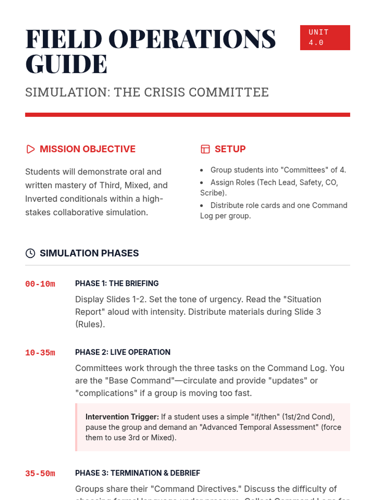 A simulation-based sequence where 7th-grade students master advanced conditional structures (Third, Mixed, and Inverted) to analyze hypothetical scenarios, past regrets, and formal consequences. Students progress from historical 'what-ifs' to a 'Crisis Management' simulation and formal report writing.