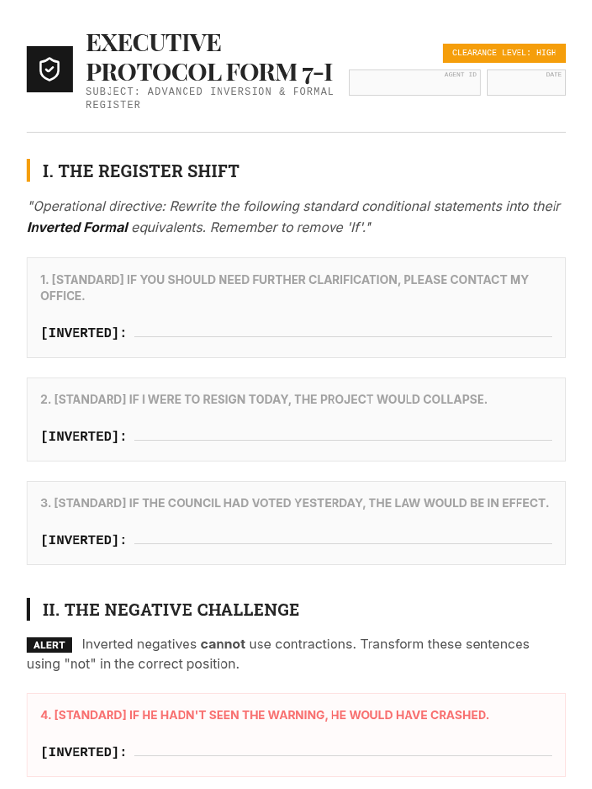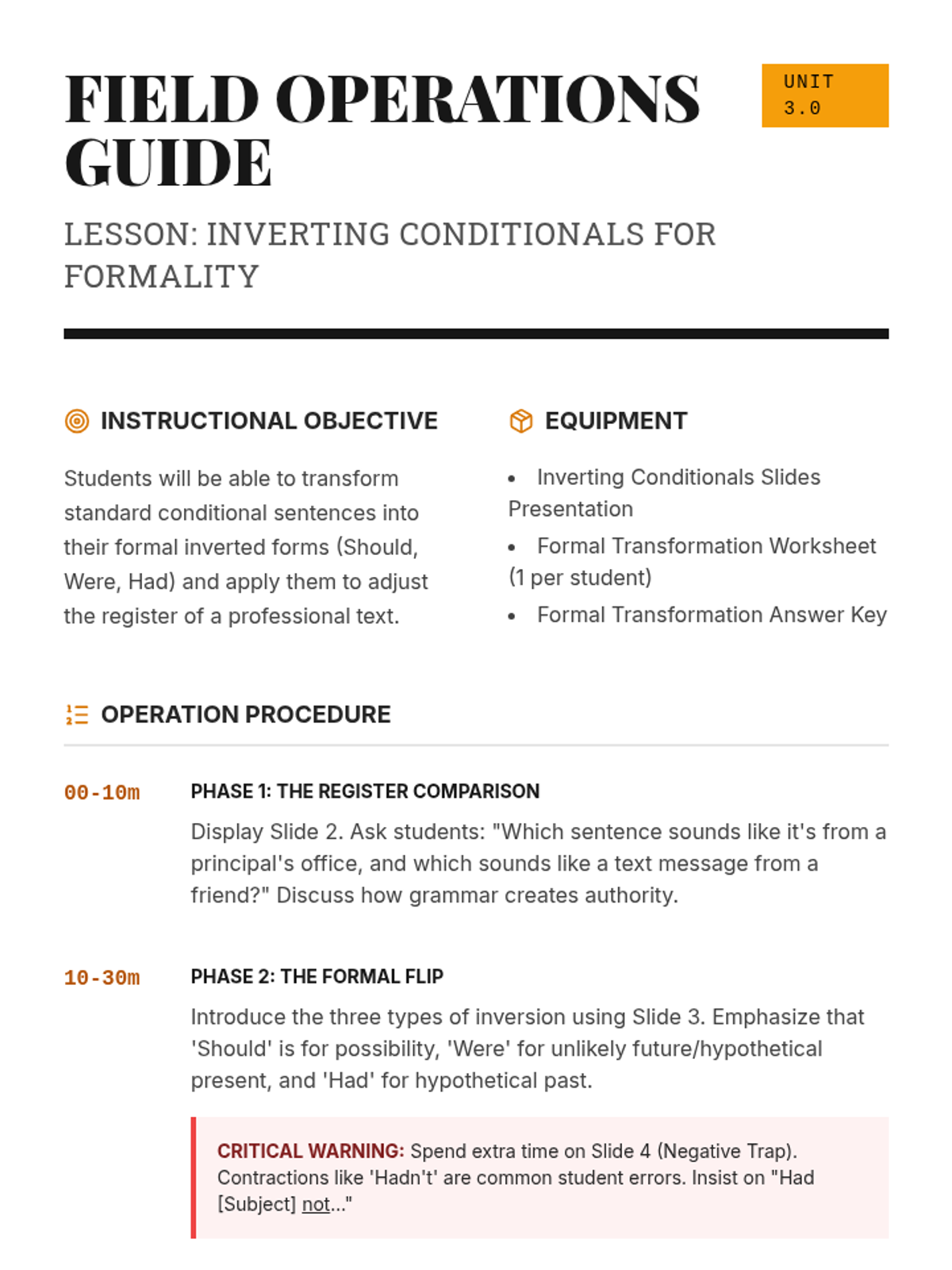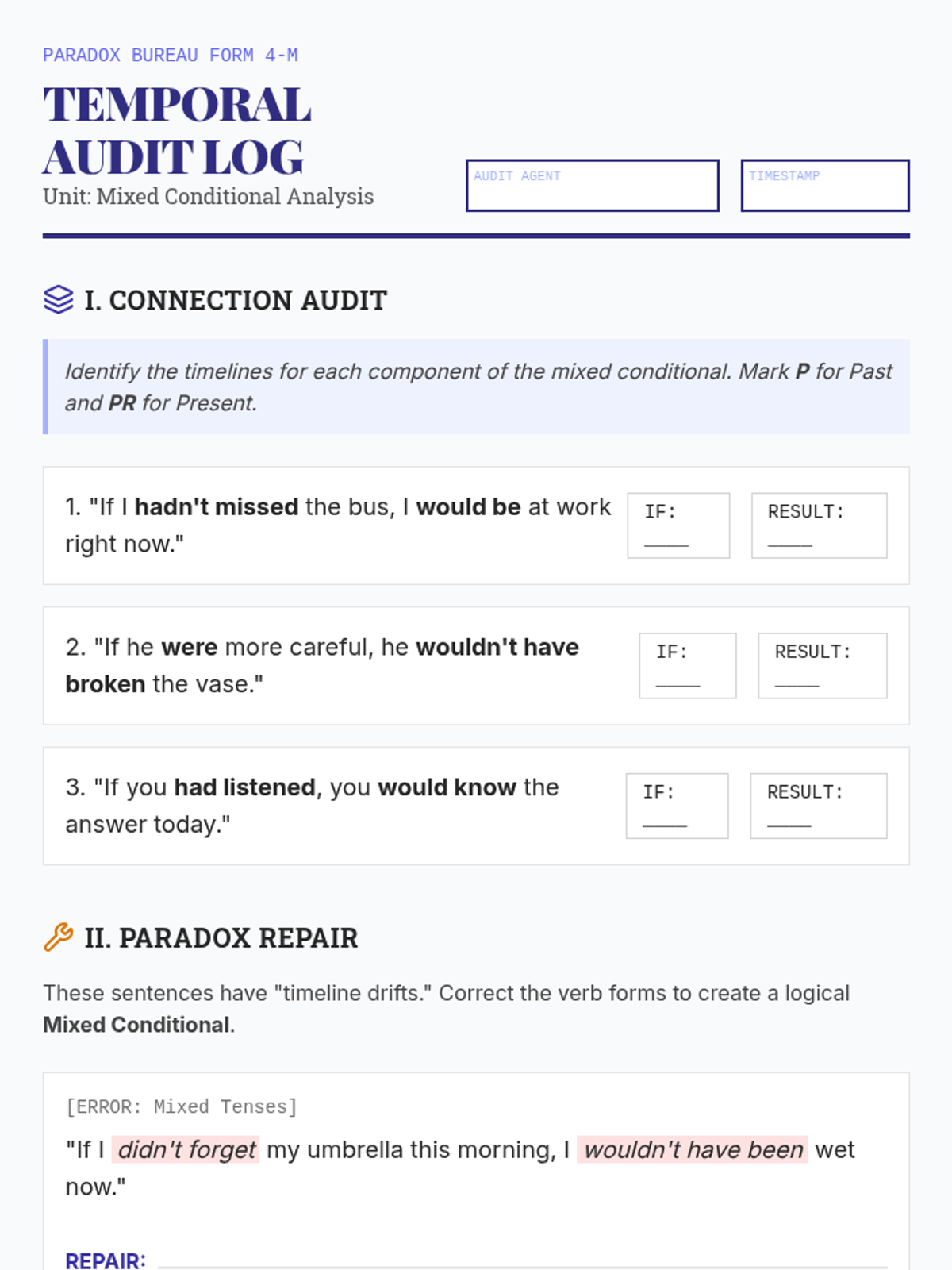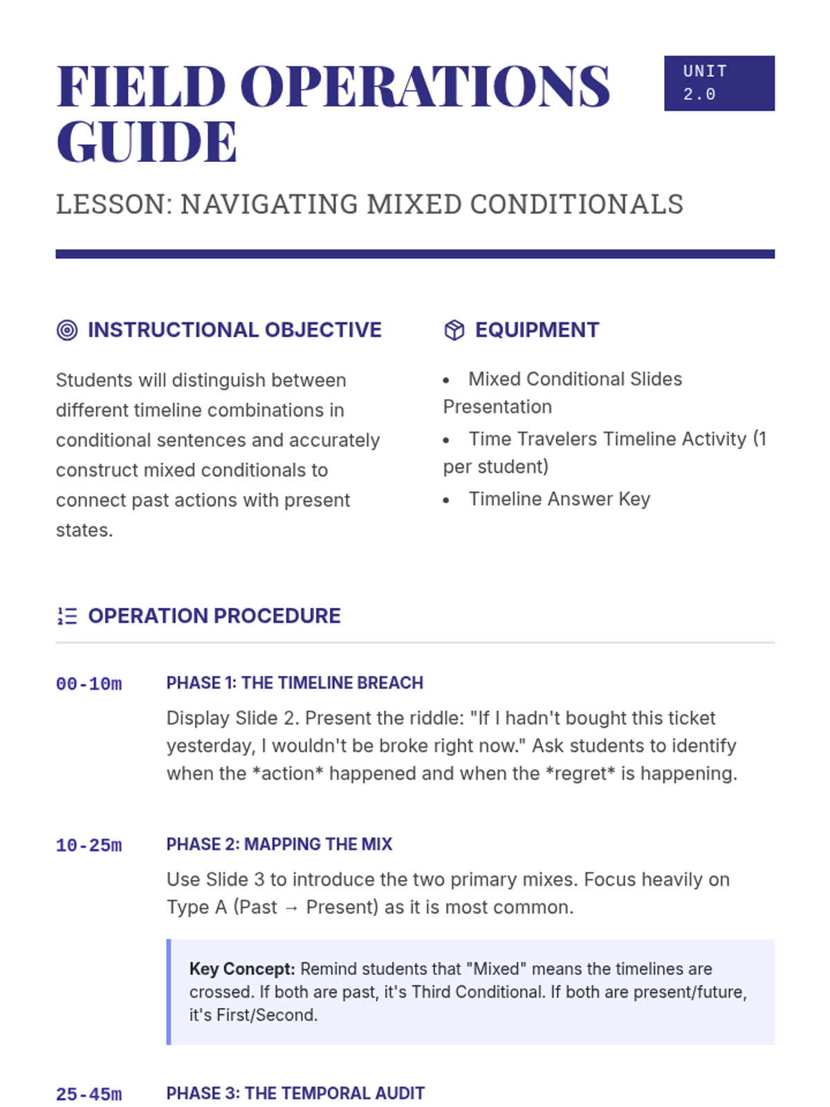 A simulation-based sequence where 7th-grade students master advanced conditional structures (Third, Mixed, and Inverted) to analyze hypothetical scenarios, past regrets, and formal consequences. Students progress from historical 'what-ifs' to a 'Crisis Management' simulation and formal report writing.
