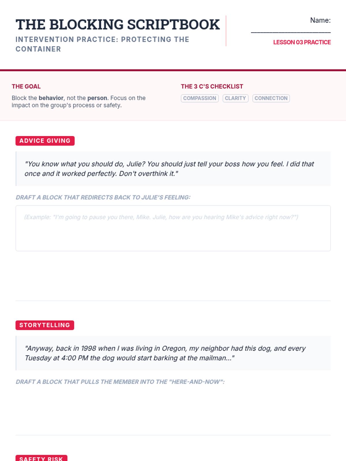 A comprehensive sequence for graduate students focusing on refined counseling micro-skills in a group context. Students progress from self-assessment to mastering complex interventions like linking, blocking, and process-level facilitation.