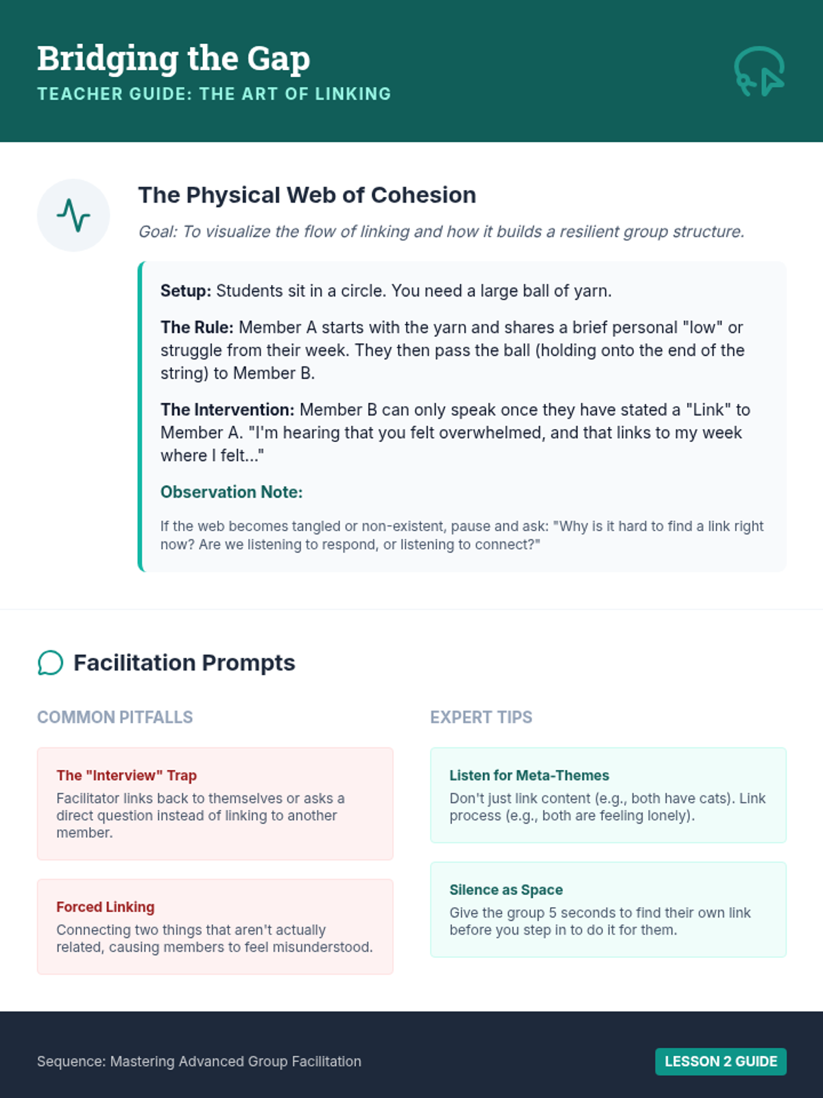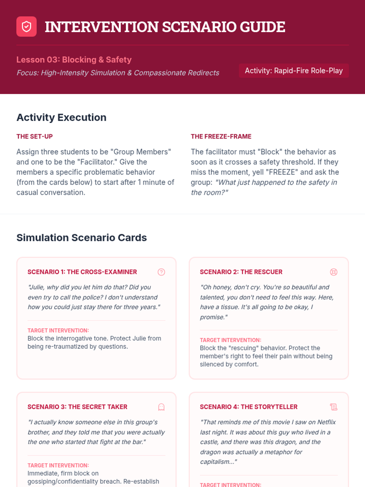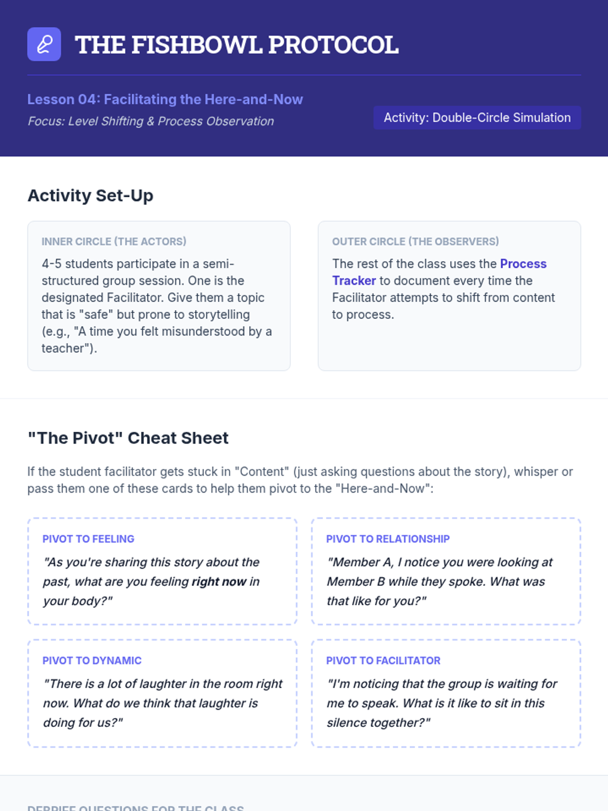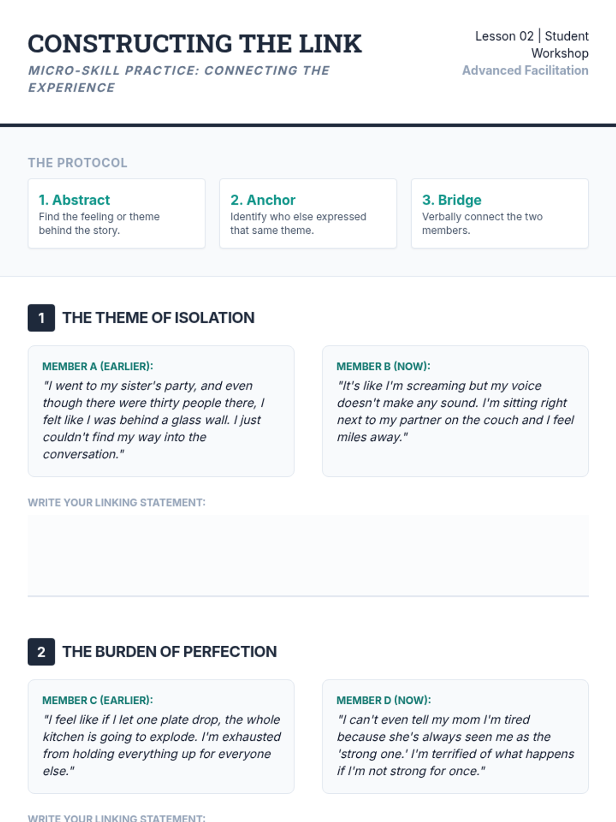 A graduate-level training sequence on facilitating peer support systems to mitigate stress and anxiety. Students learn the science of social support, micro-skills for active listening, boundary setting to prevent burnout, and group facilitation techniques to create sustainable communities of care.