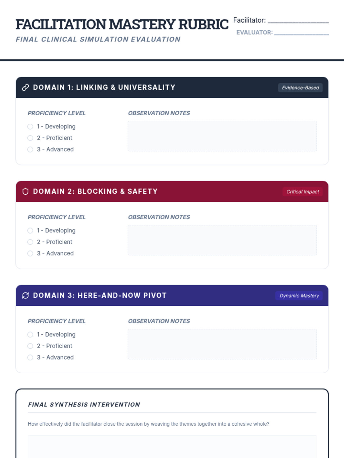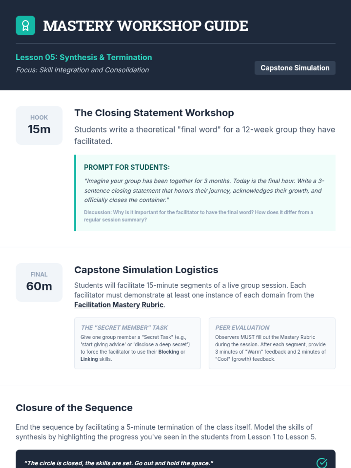 A comprehensive graduate-level seminar series on advanced group counseling facilitation, focusing on instructional frameworks, clinical process, and cultural sensitivity.