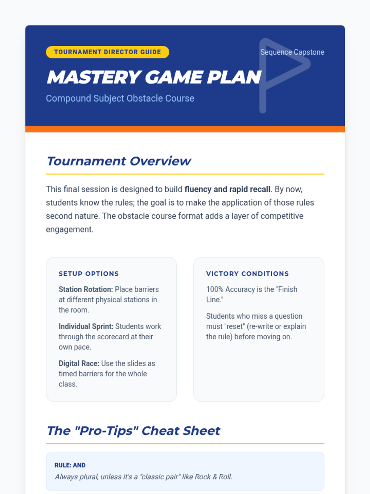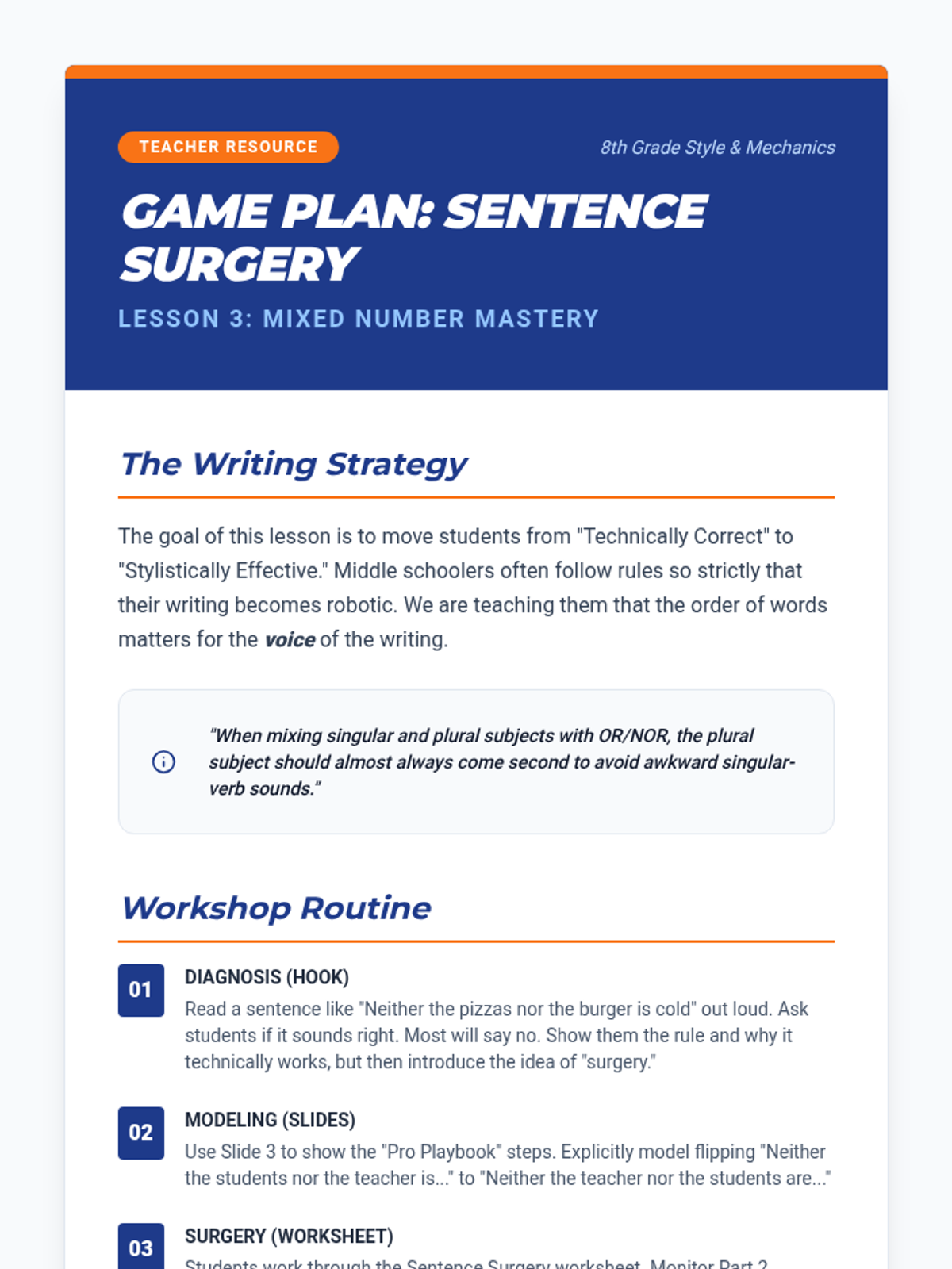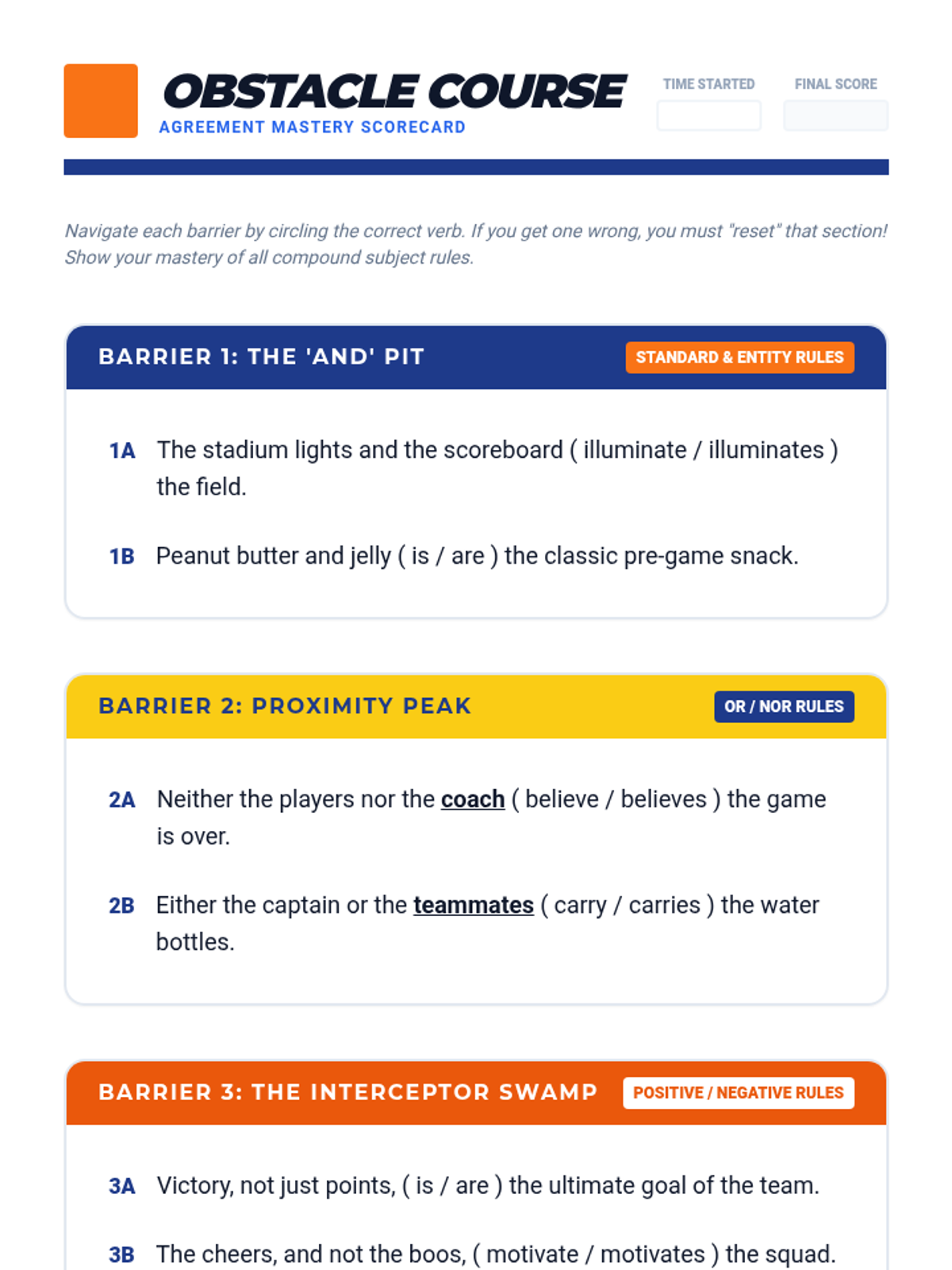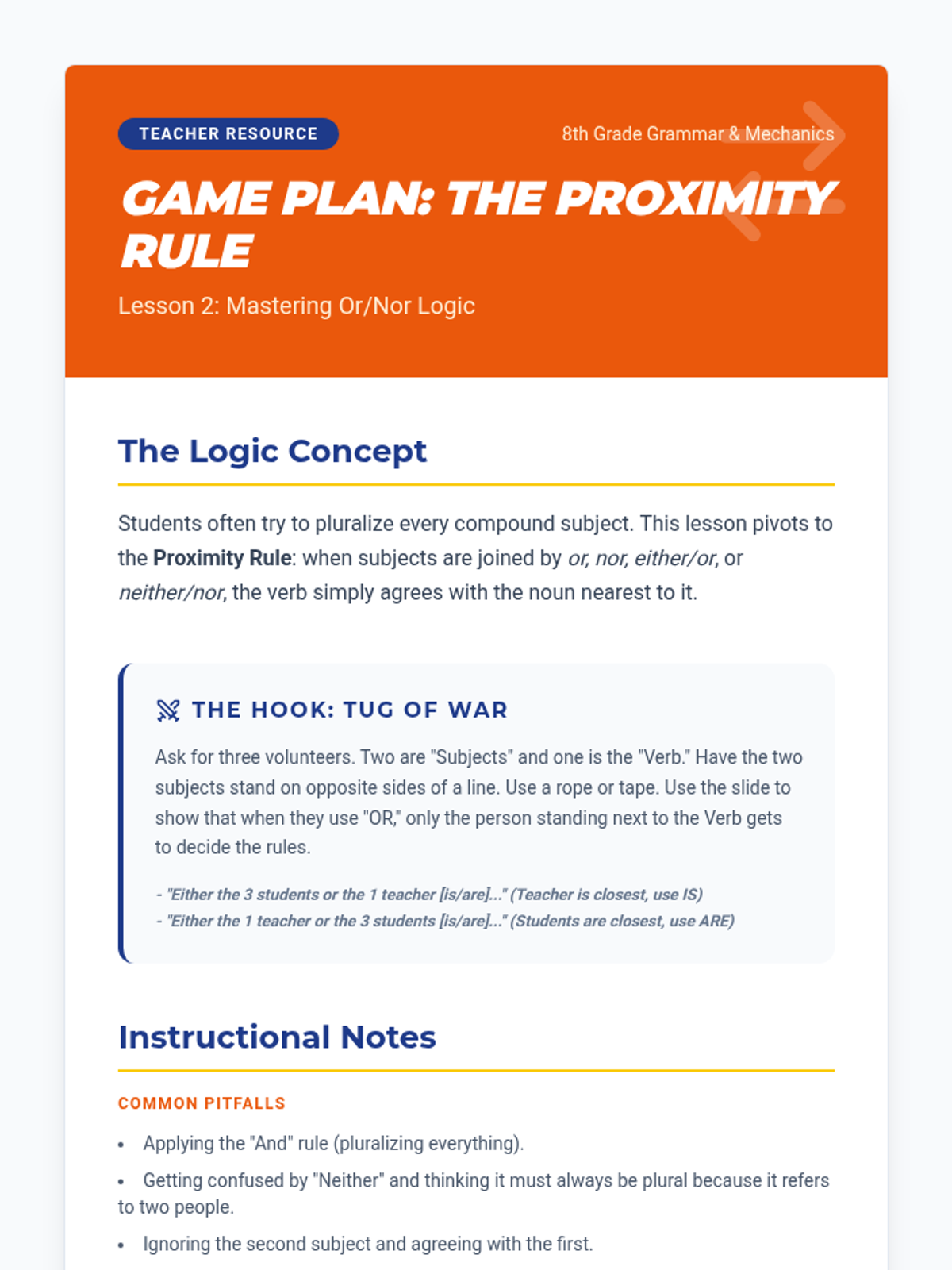 An 8th-grade grammar sequence focusing on the nuances of subject-verb agreement with compound subjects. Students engage in game-based learning to master the 'and' rule, the proximity rule with 'or/nor', mixed number subjects, and positive/negative subject pairings.