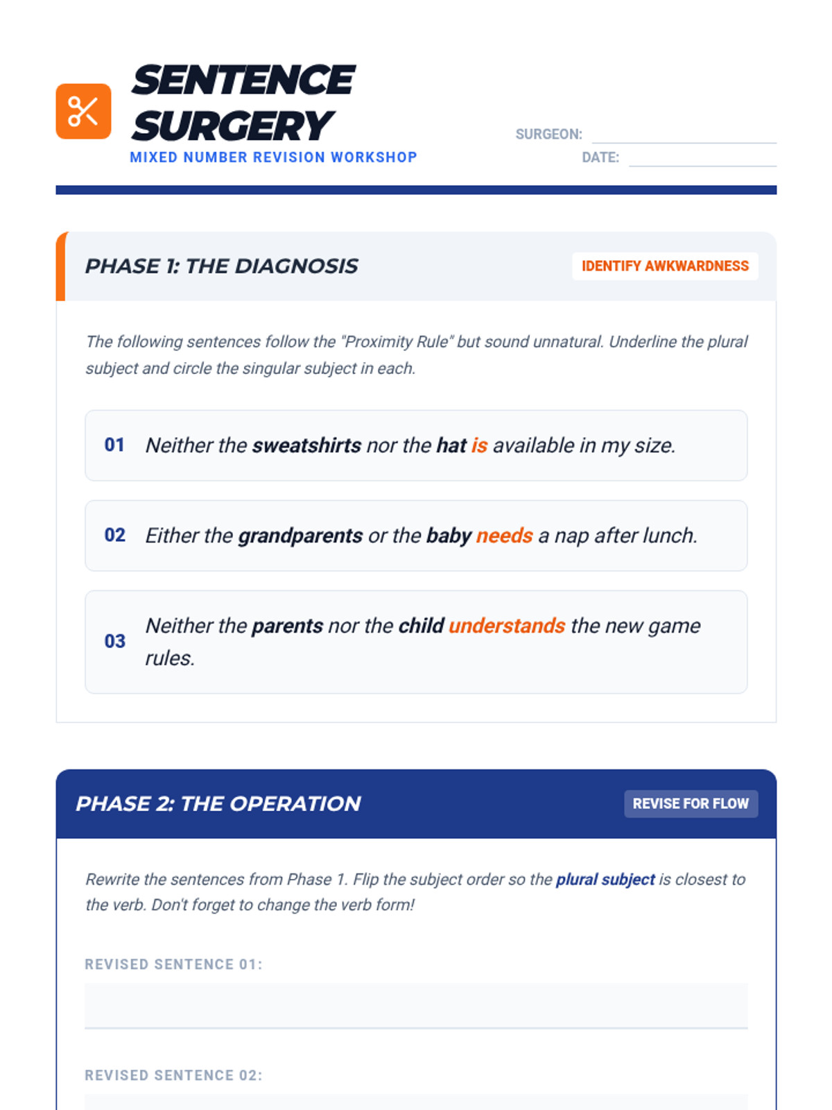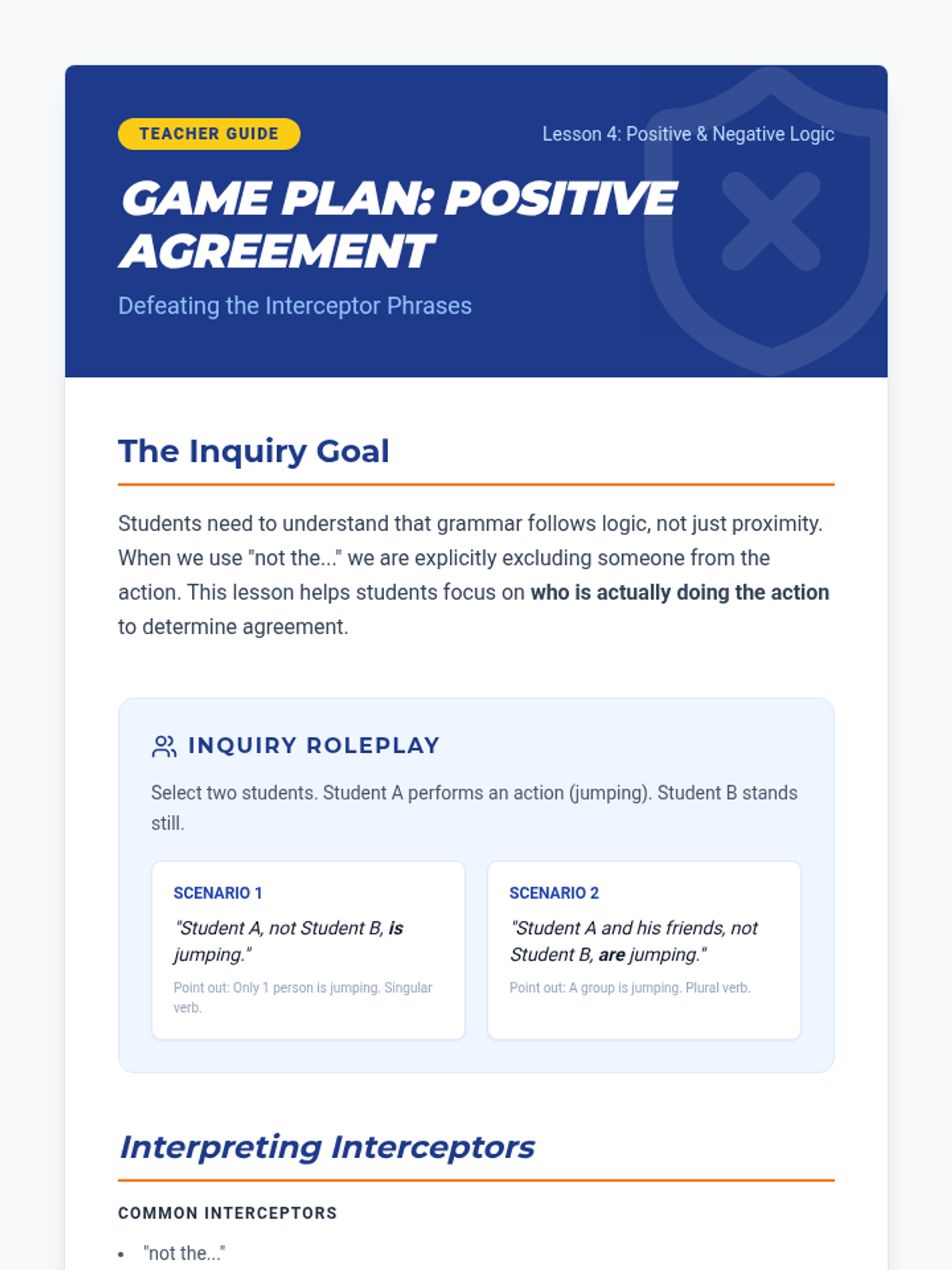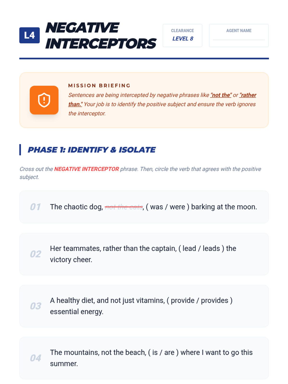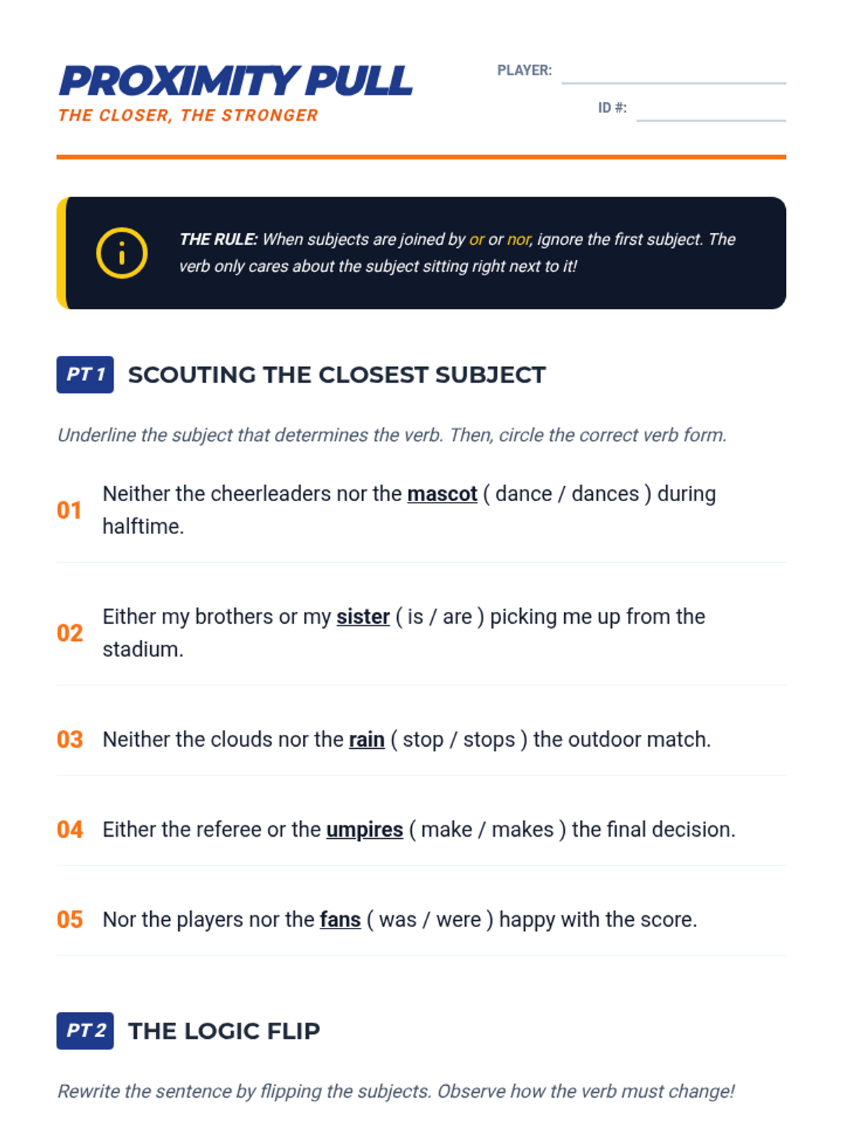 An 8th-grade grammar sequence focusing on the nuances of subject-verb agreement with compound subjects. Students engage in game-based learning to master the 'and' rule, the proximity rule with 'or/nor', mixed number subjects, and positive/negative subject pairings.