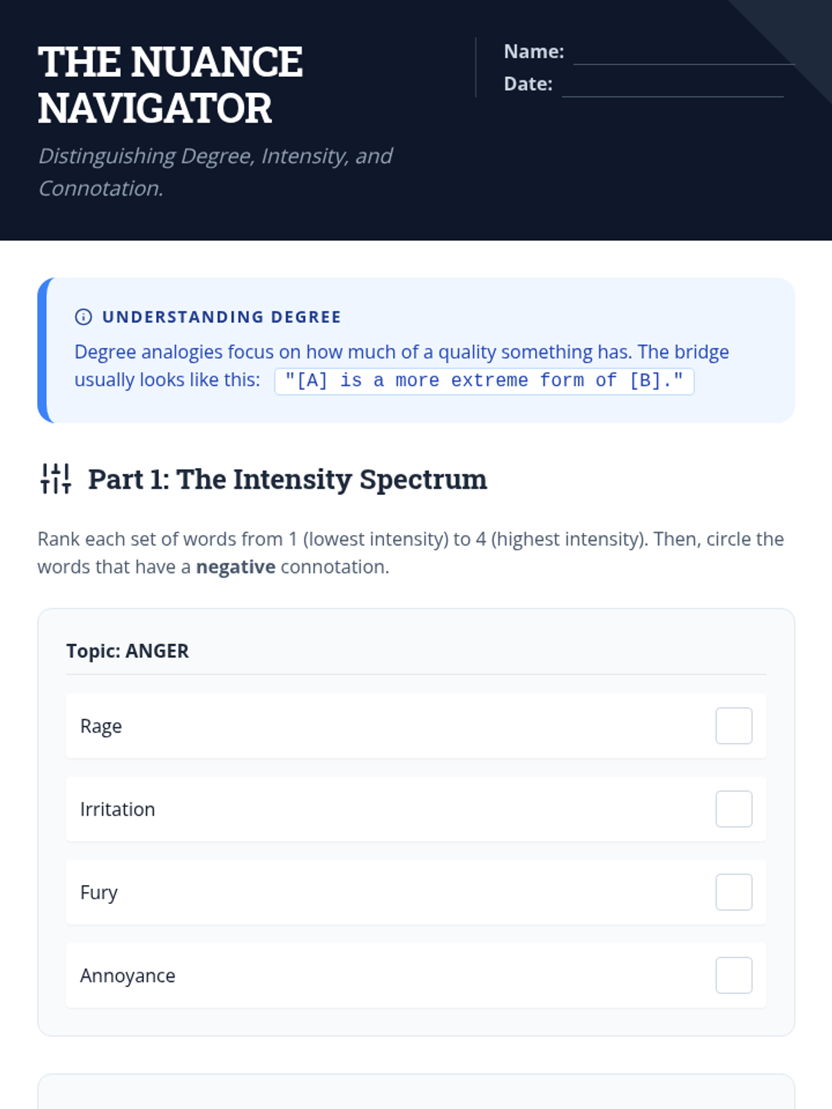 A comprehensive sequence for 10th-grade students focused on mastering verbal analogies through logical bridge sentences and categorical relationship types. Students progress from basic relationship identification to analyzing degrees of intensity, structural hierarchies, and causal functions, culminating in high-level application and assessment.
