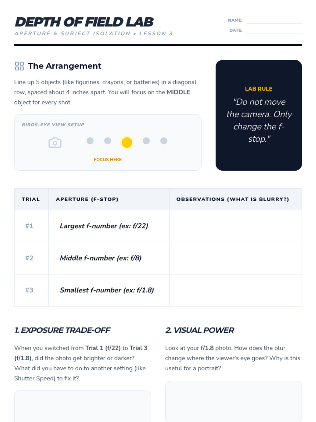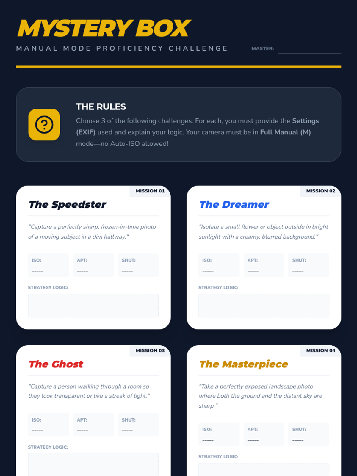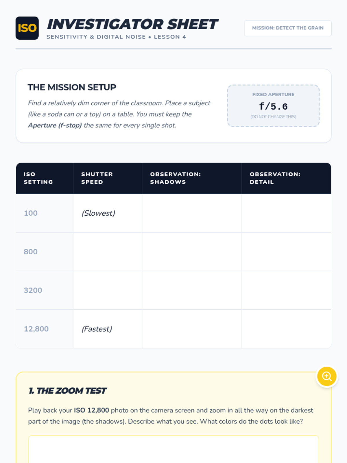 A comprehensive 5-lesson unit for 8th-grade photography students, focusing on the technical mastery of the exposure triangle (ISO, aperture, and shutter speed). Students progress from conceptual understanding to manual mode proficiency through simulations, experiments, and creative challenges.