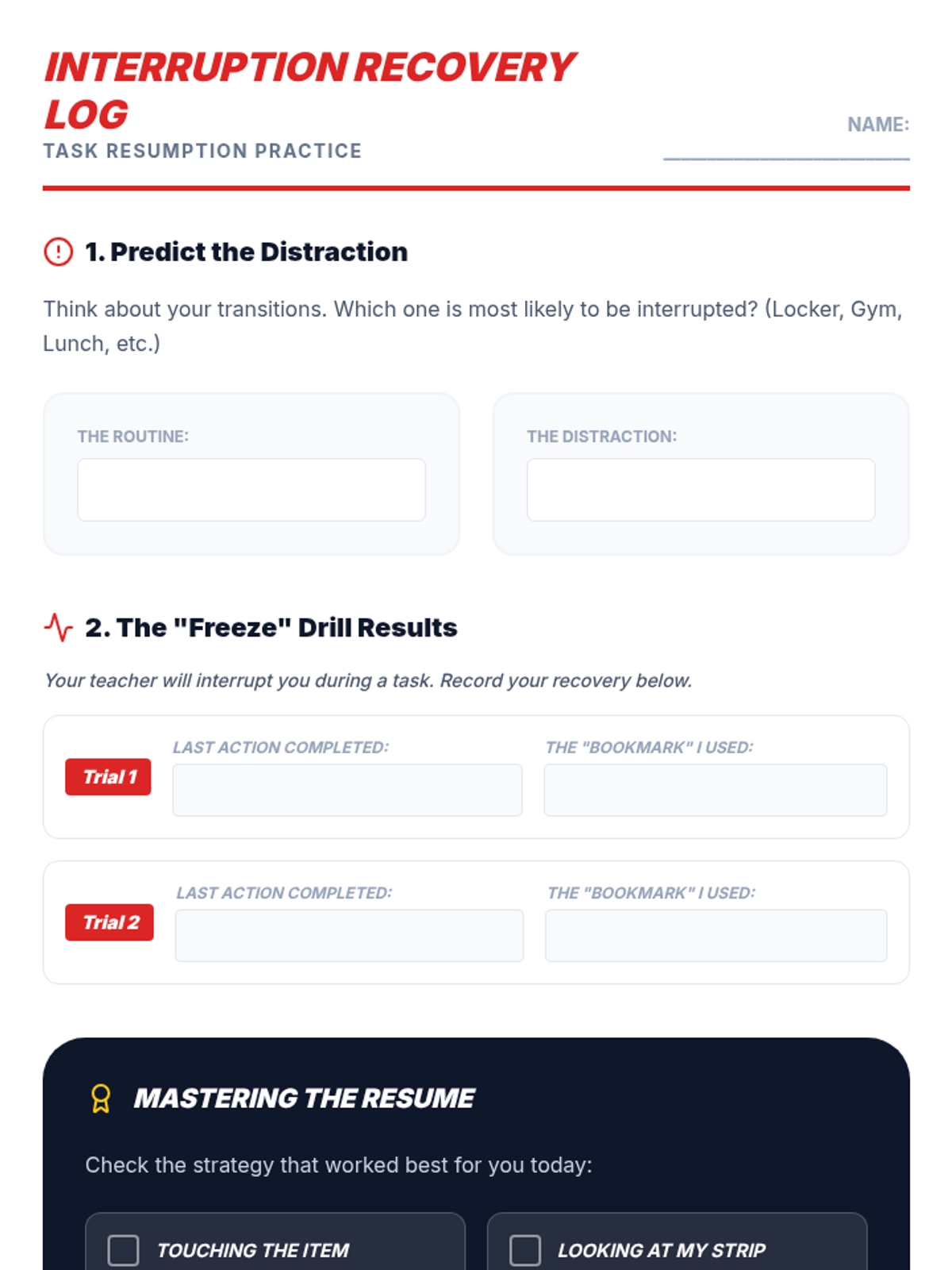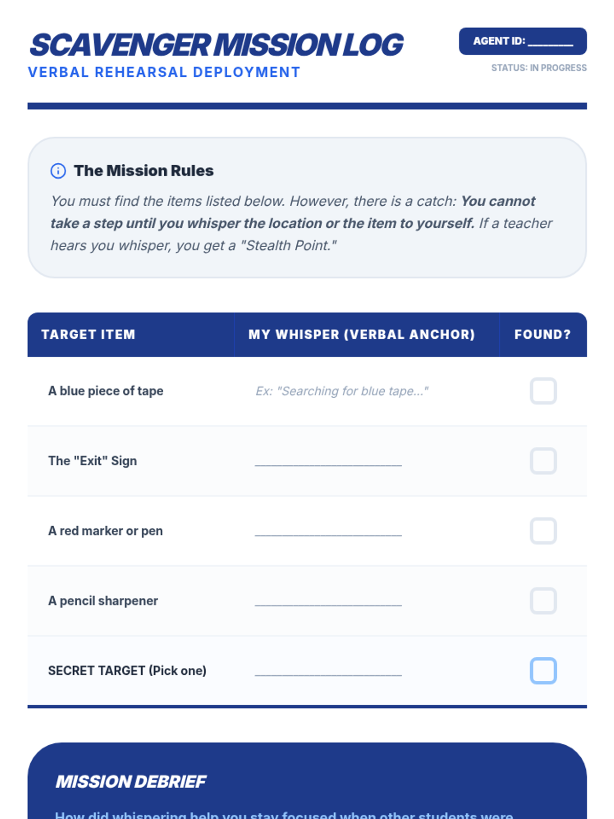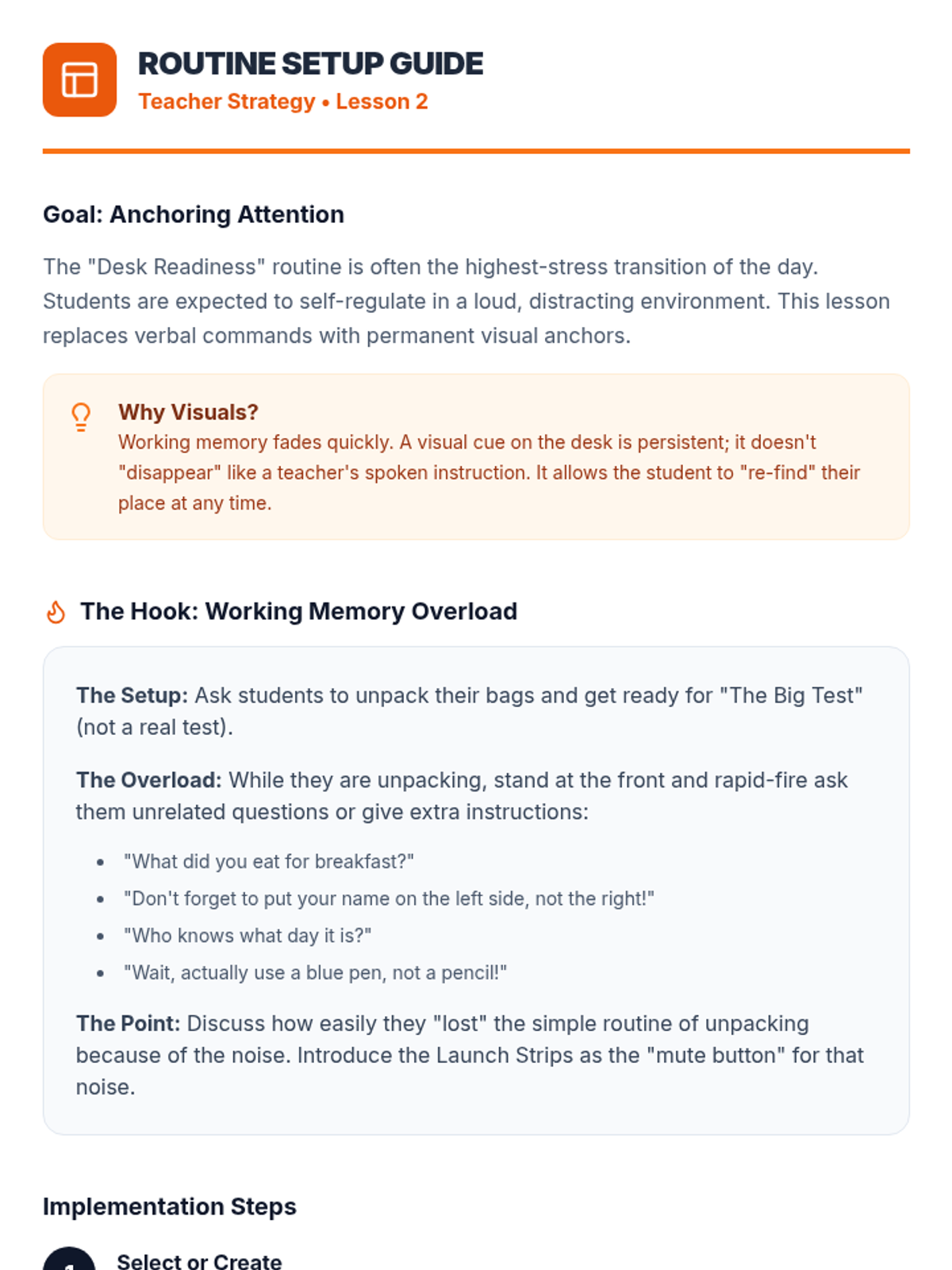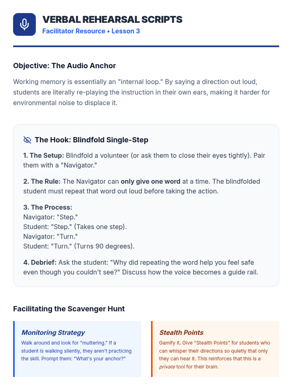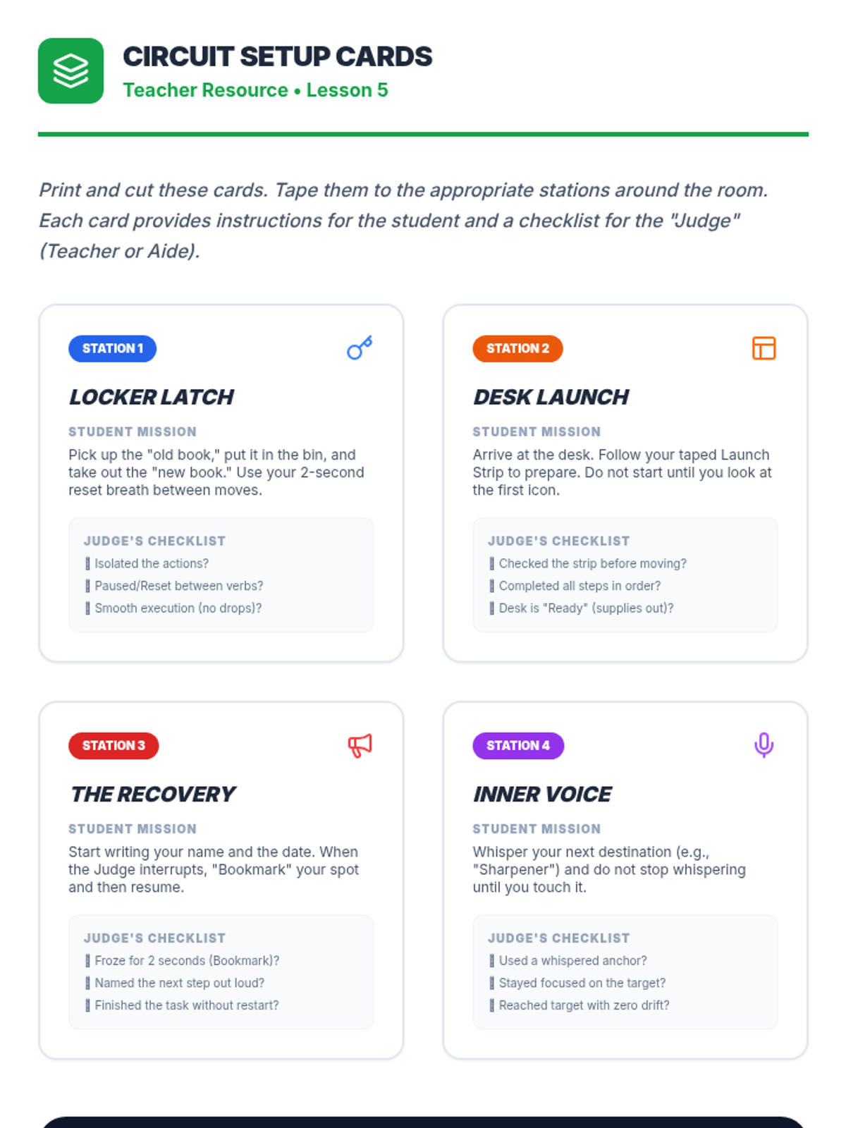 This sequence helps 7th-grade students with working memory challenges master classroom transitions by breaking complex tasks into single-step actions. Students move from teacher-guided deconstruction of routines to independent use of verbal rehearsal and visual cues, culminating in a simulated school day circuit.