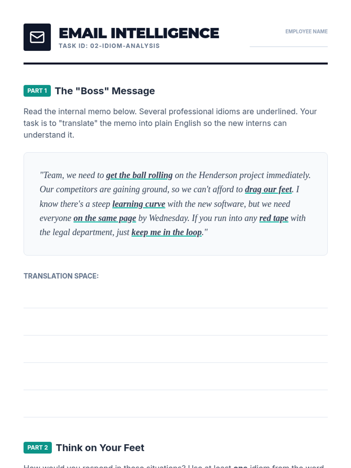 This sequence addresses the complexities of English phraseology, specifically academic collocations and professional idioms. Students move from literal translations to understanding figurative language used in business and formal environments.