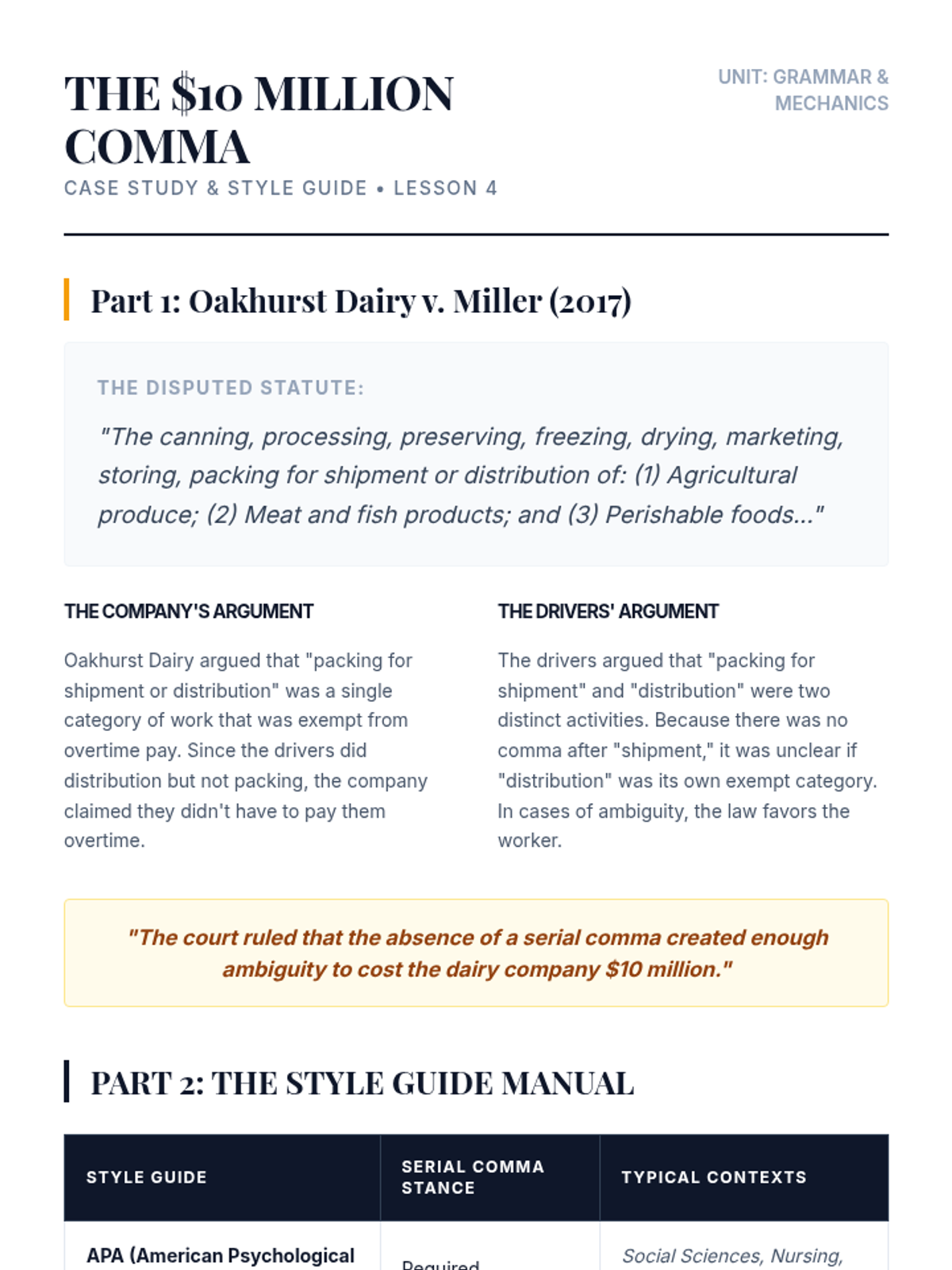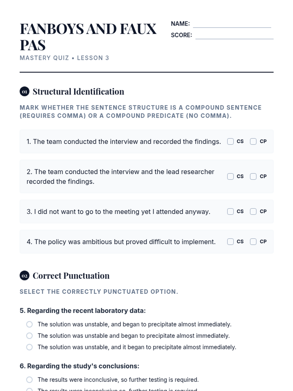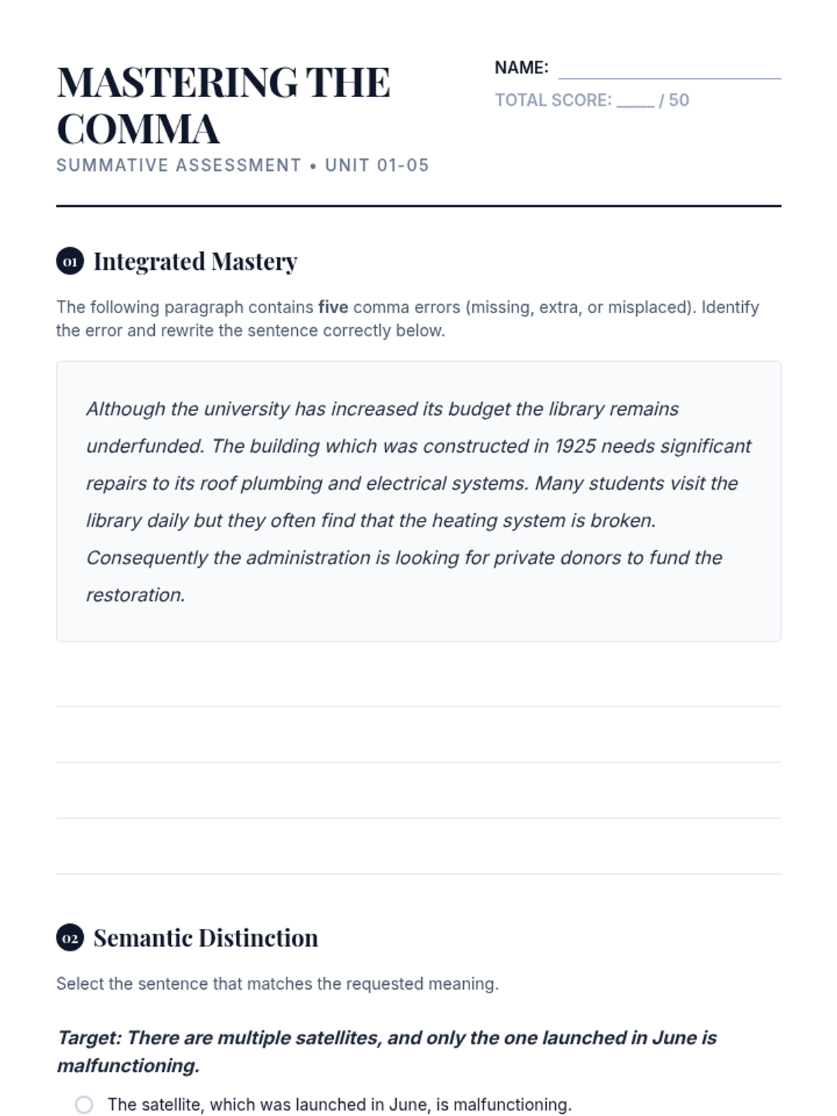 A comprehensive workshop-style sequence for undergraduate students focusing on the strategic and mechanical use of commas in academic writing to improve clarity, rhythm, and precision.