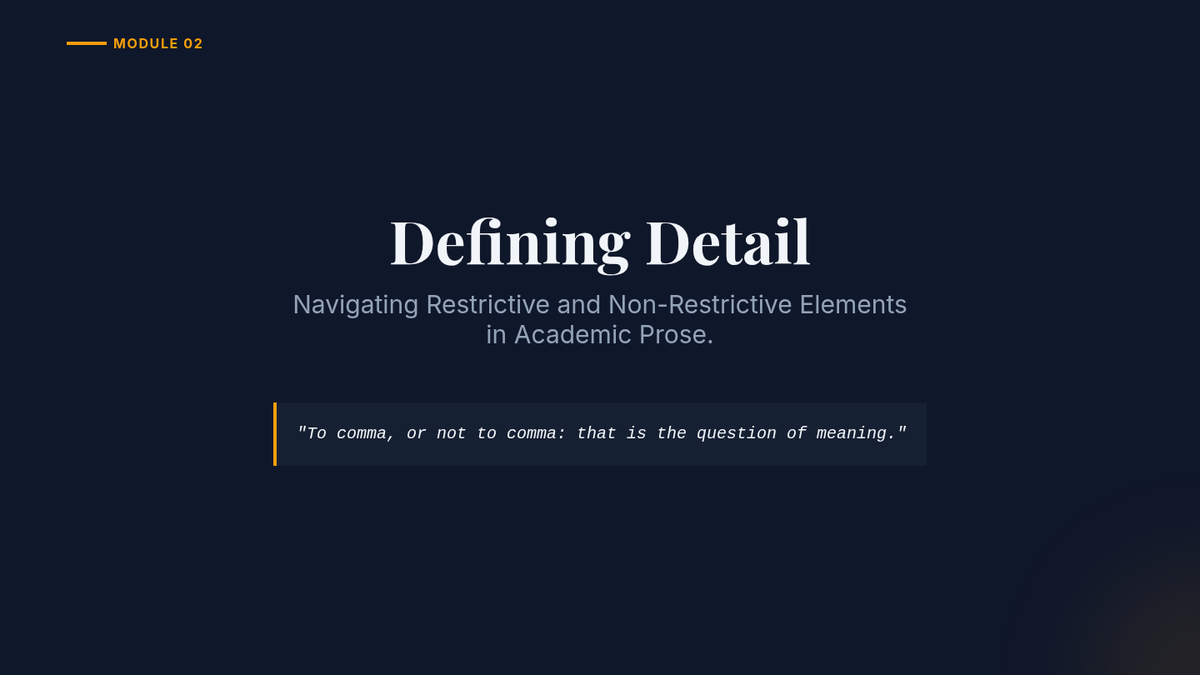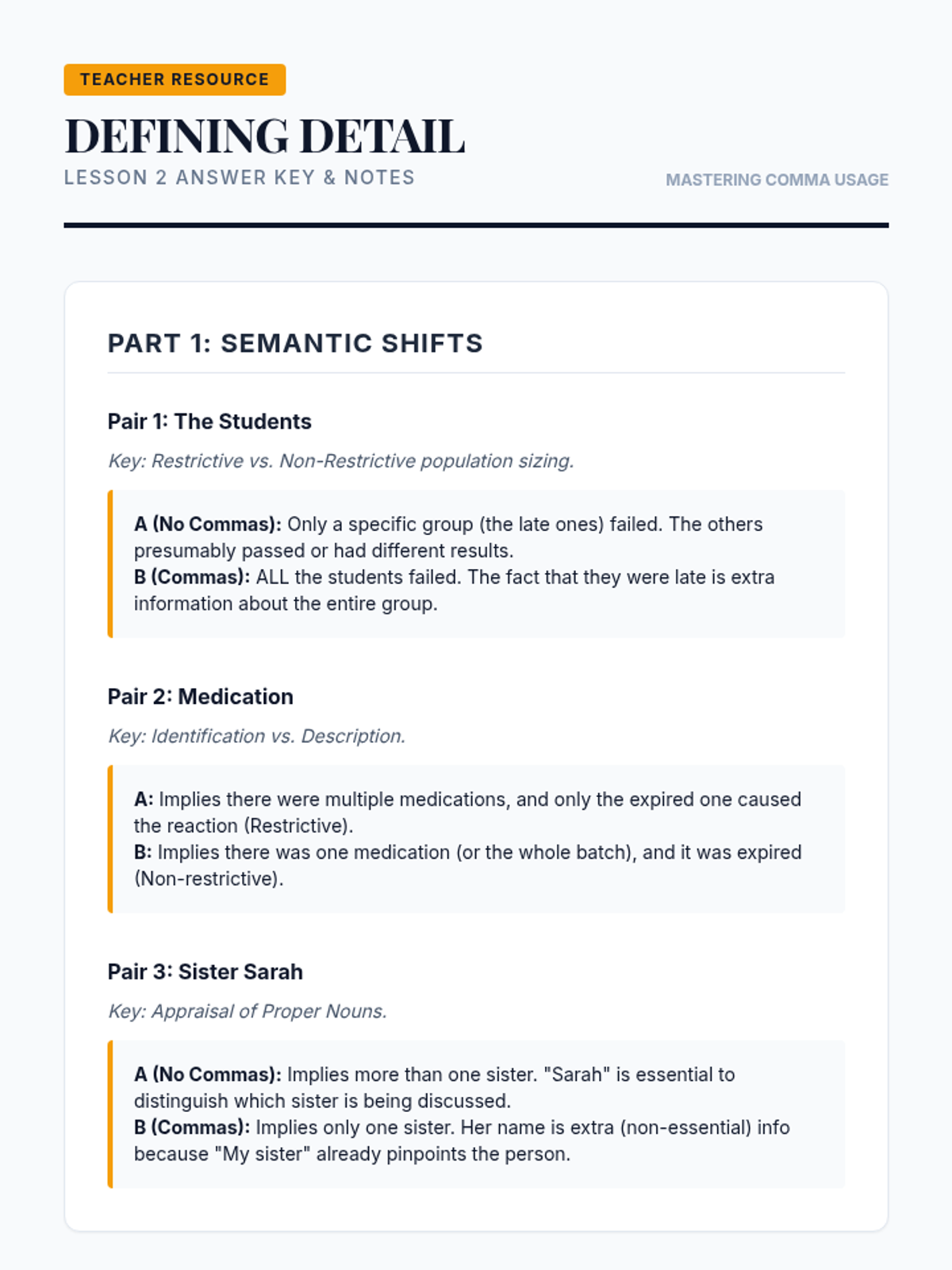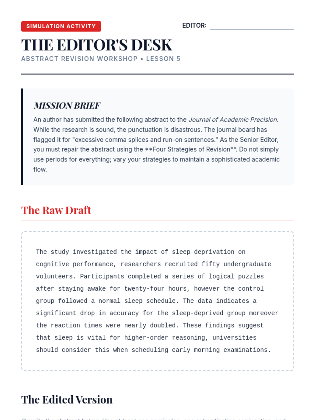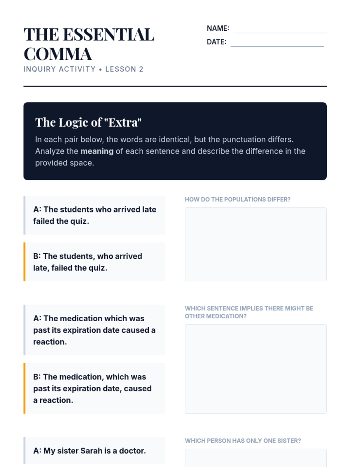 A comprehensive workshop-style sequence for undergraduate students focusing on the strategic and mechanical use of commas in academic writing to improve clarity, rhythm, and precision.