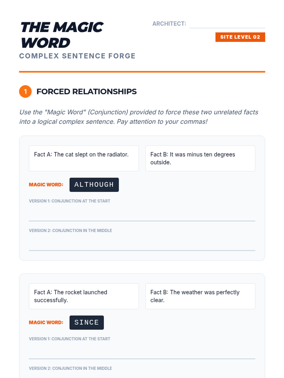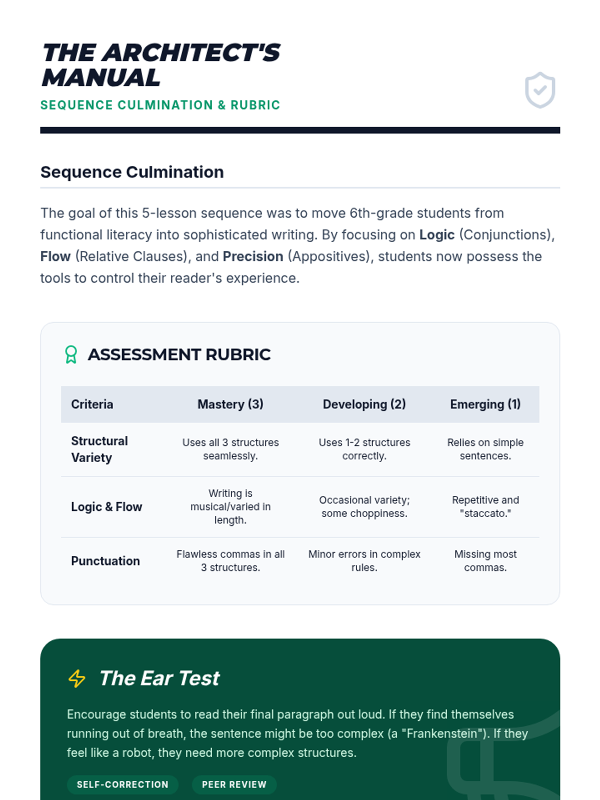 A comprehensive 5-lesson sequence for 6th graders to move beyond simple sentences by mastering complex structures, subordinating conjunctions, relative clauses, and appositives to enhance writing sophistication and flow.