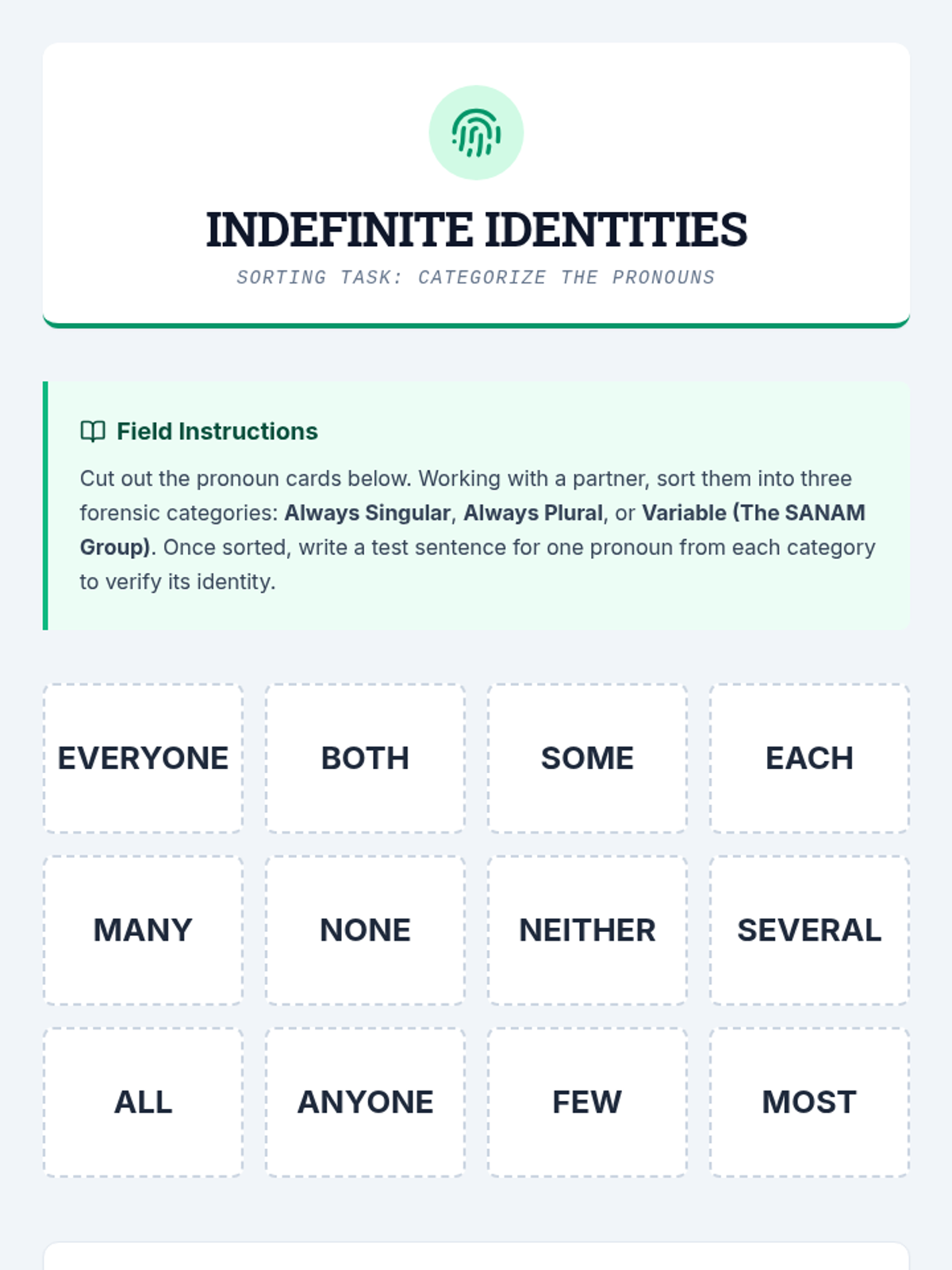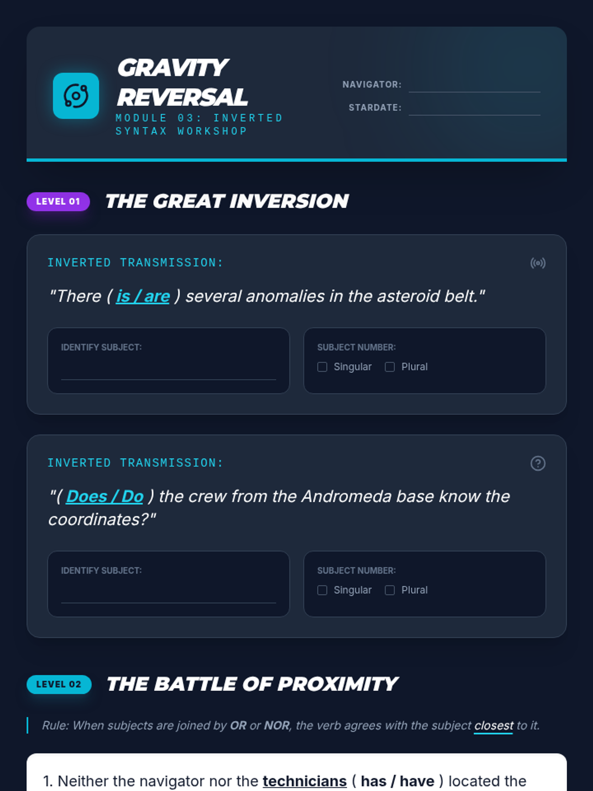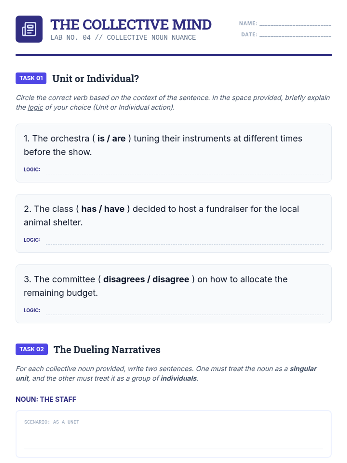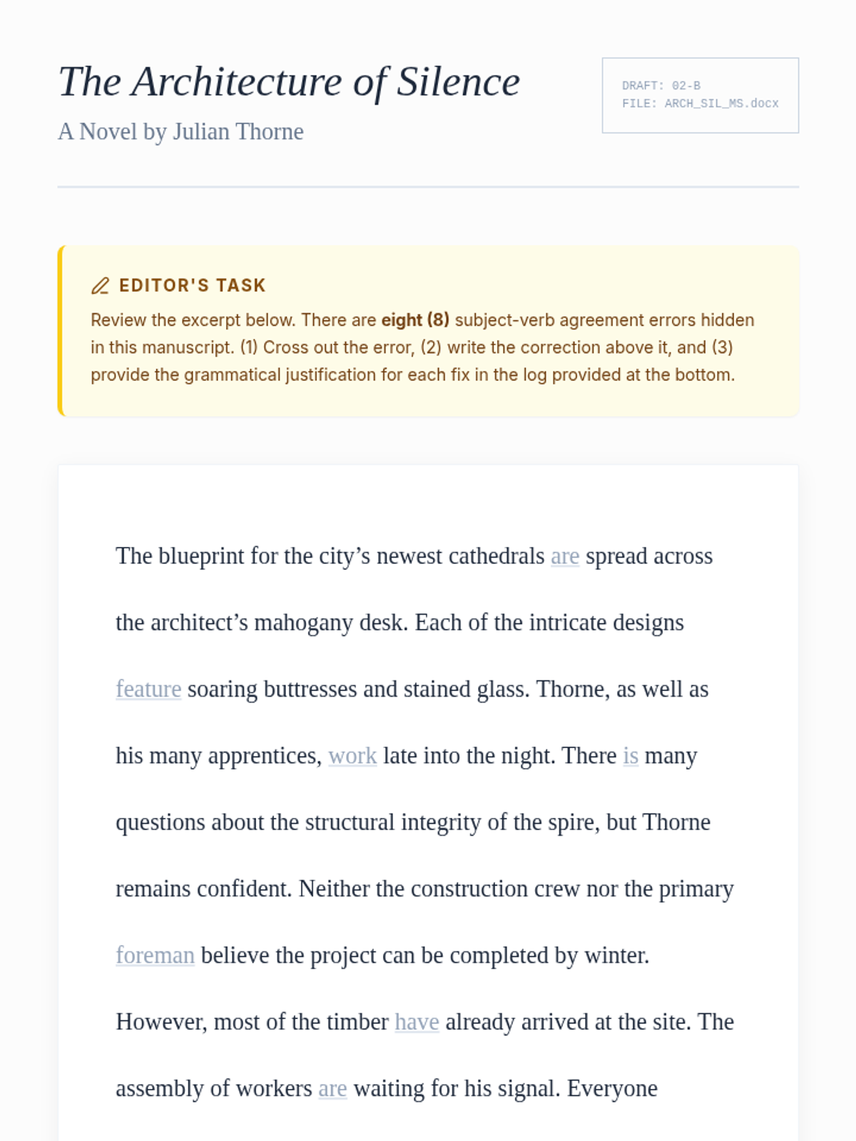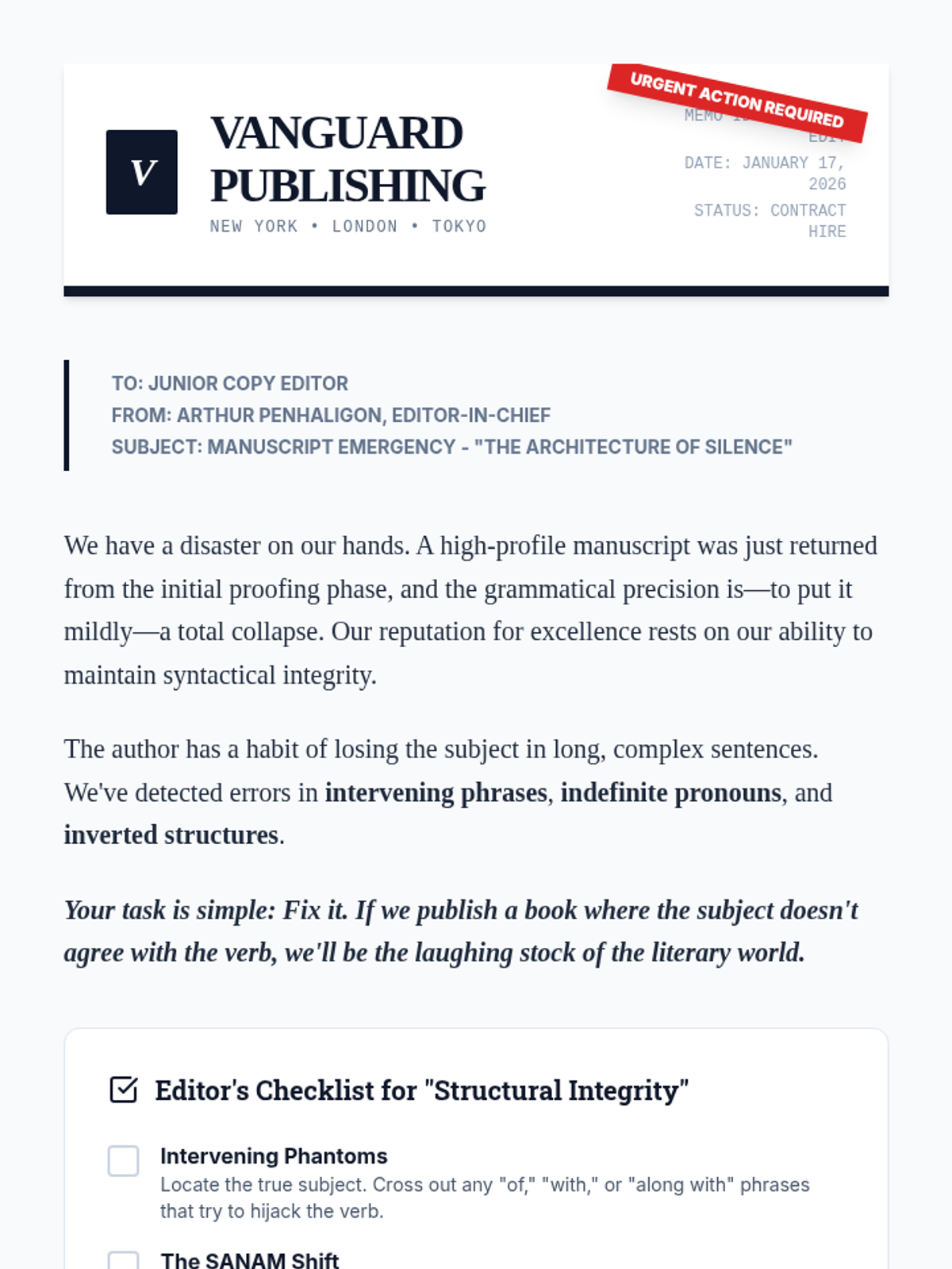 A comprehensive 11th-grade grammar sequence focusing on subject-verb agreement in complex sentences. Students progress from identifying intervening phrases to mastering indefinite pronouns, inverted syntax, and collective nouns, culminating in a professional copy-editing simulation.