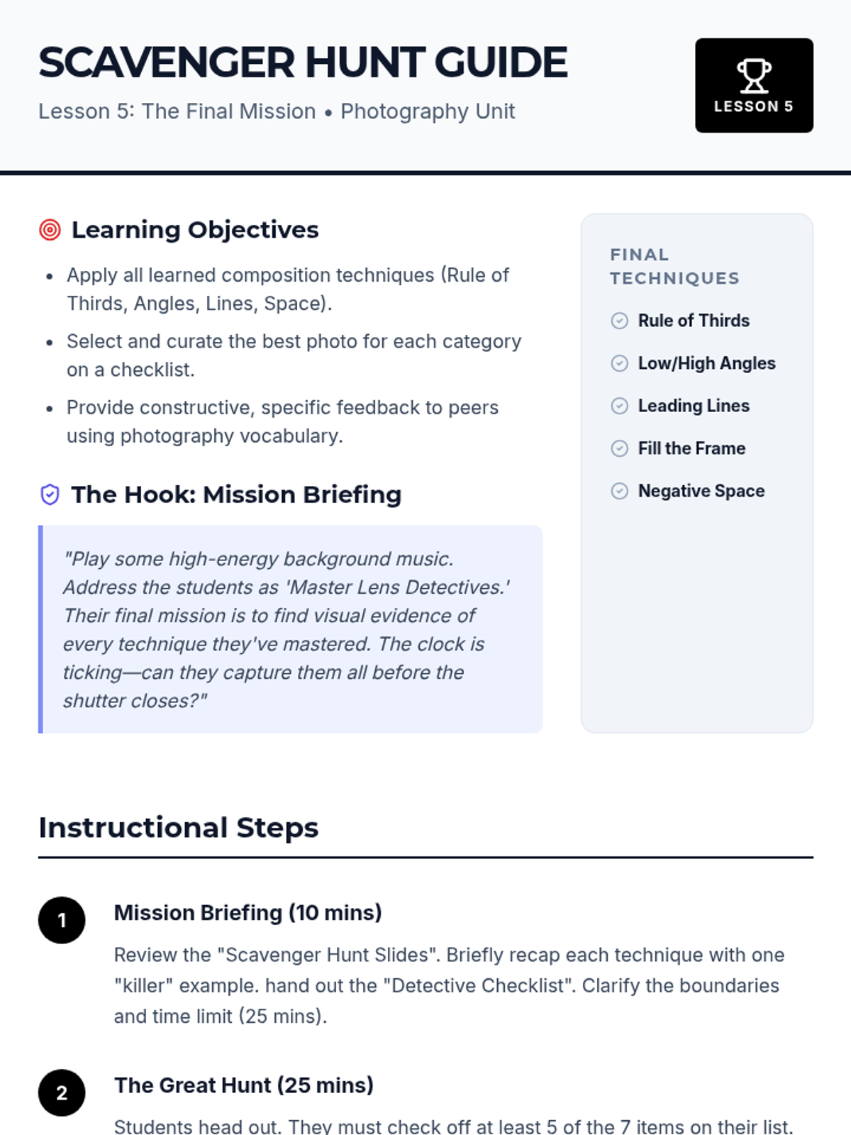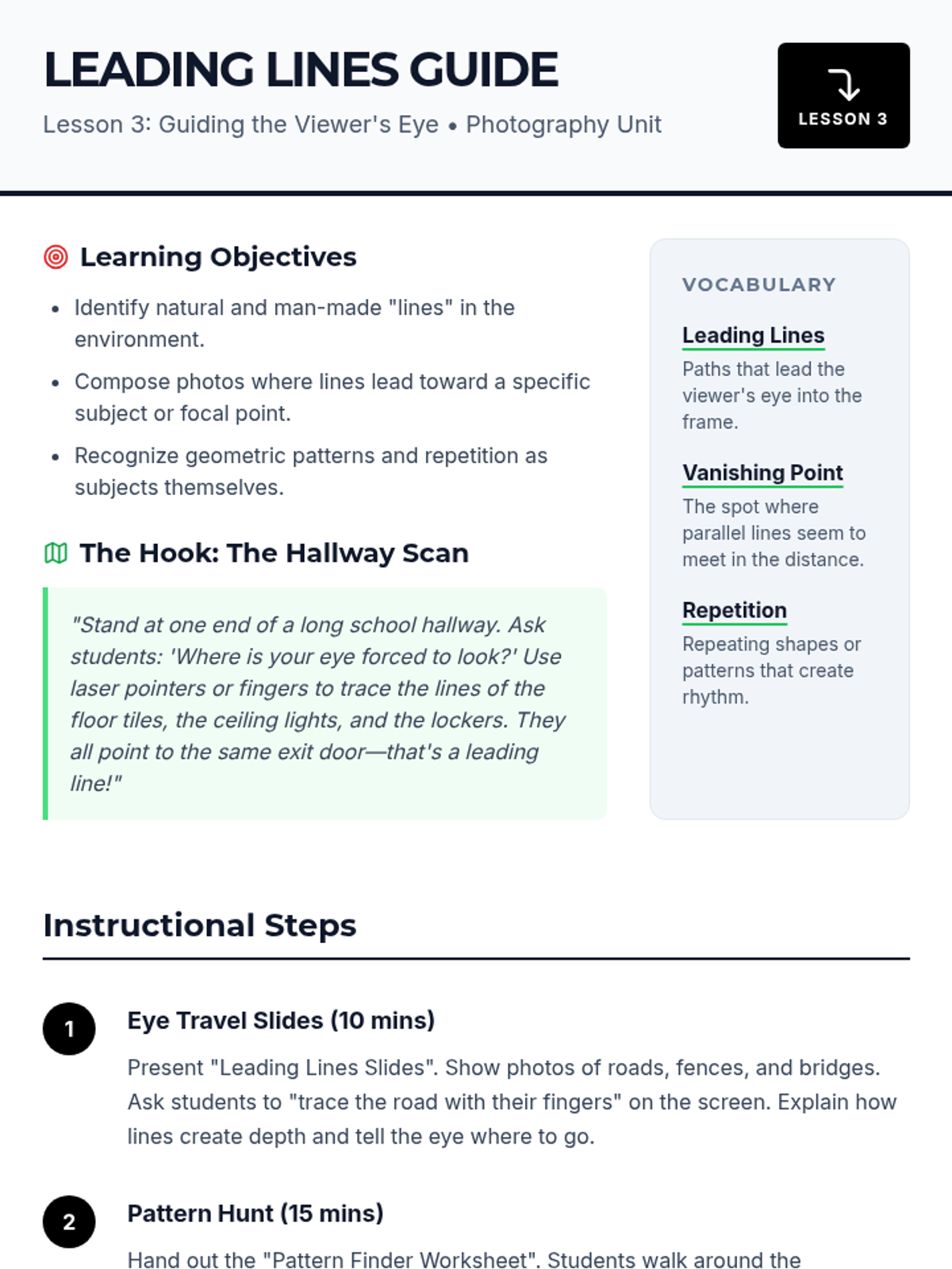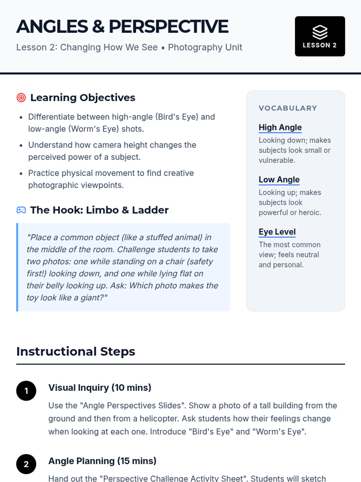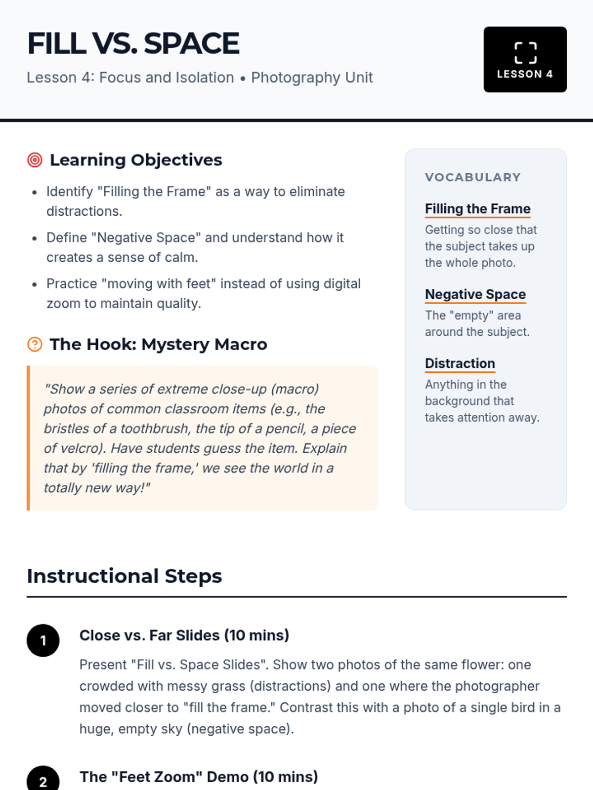 This sequence introduces 4th-grade students to the fundamental rules of visual composition, transforming how they view their surroundings through a lens. Students learn about the Rule of Thirds, camera angles, leading lines, and framing techniques to move beyond snapshots and toward intentional artistic photography.