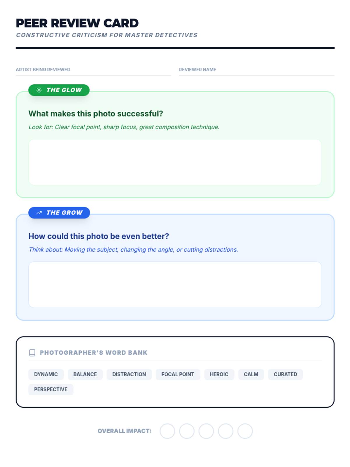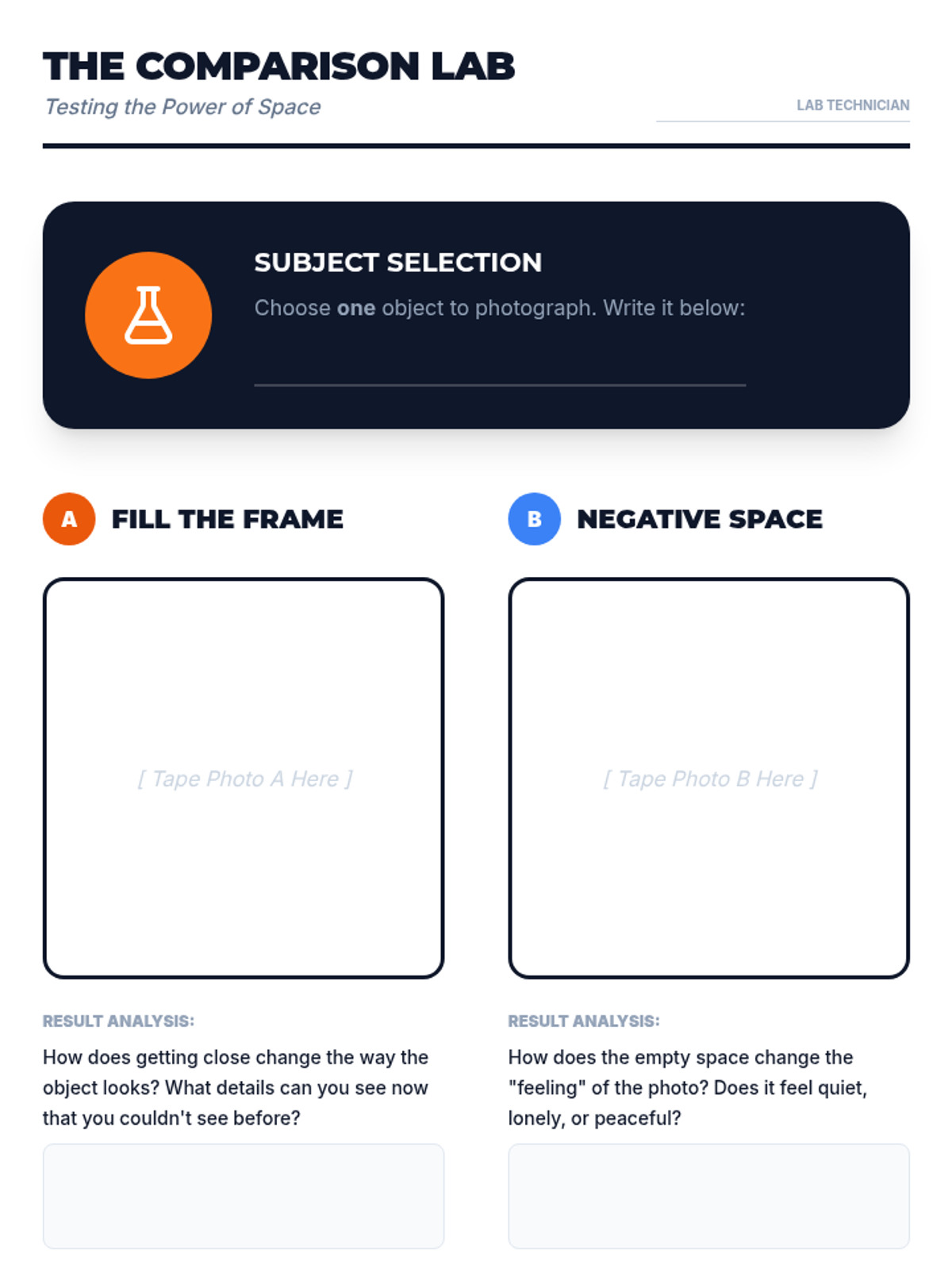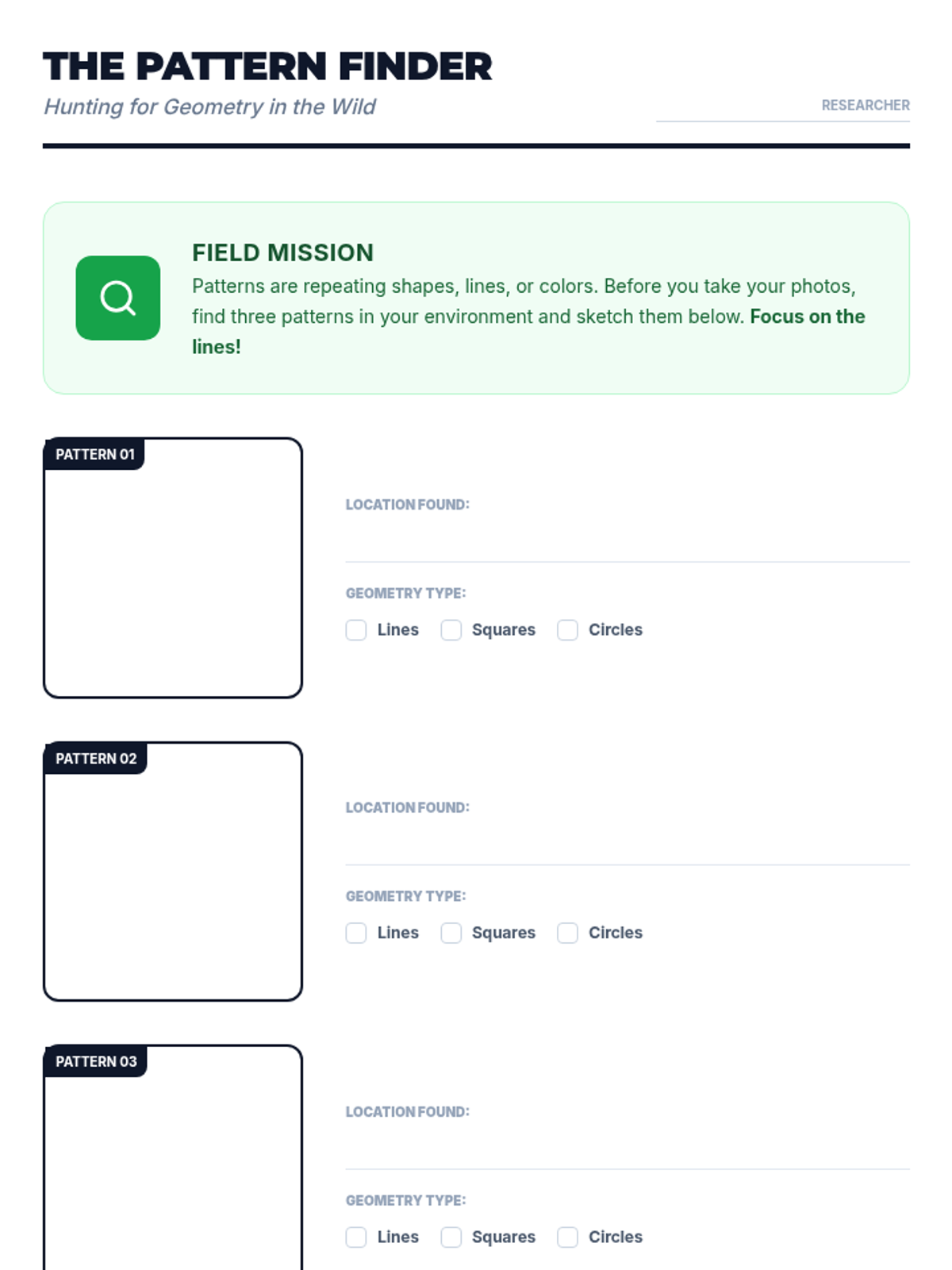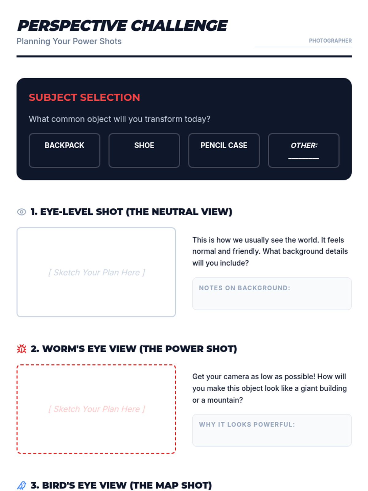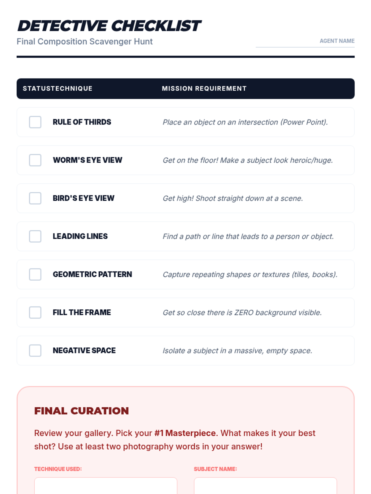 This sequence introduces 4th-grade students to the fundamental rules of visual composition, transforming how they view their surroundings through a lens. Students learn about the Rule of Thirds, camera angles, leading lines, and framing techniques to move beyond snapshots and toward intentional artistic photography.