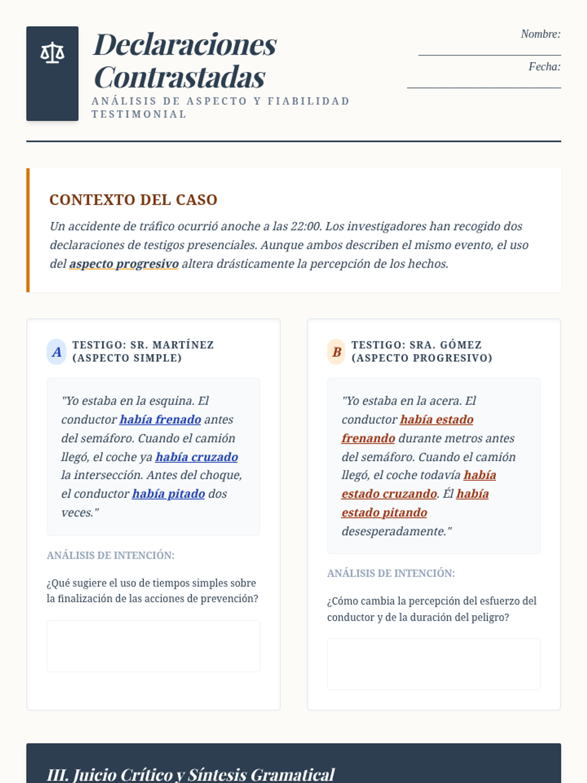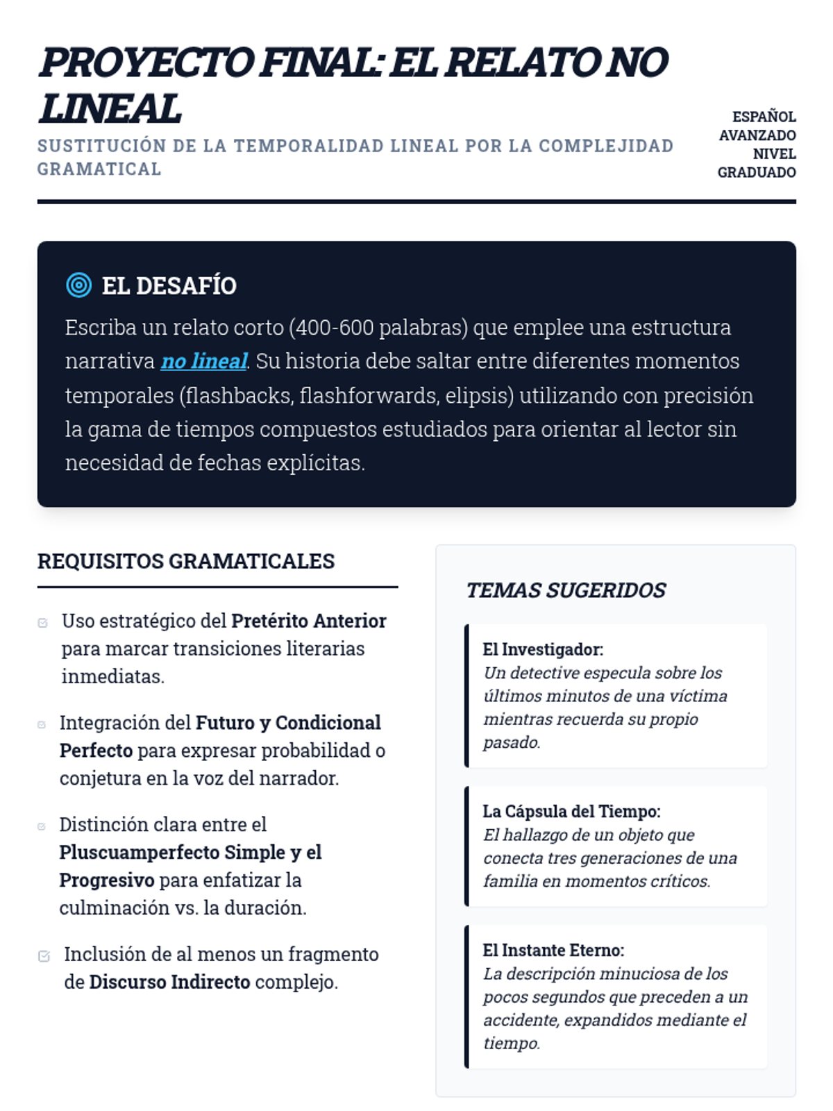 This advanced Spanish grammar sequence explores the sophisticated use of compound tenses in narrative and analytical writing. Graduate students will master the nuances of anteriority, probability, and temporal flow through literary analysis and creative application.