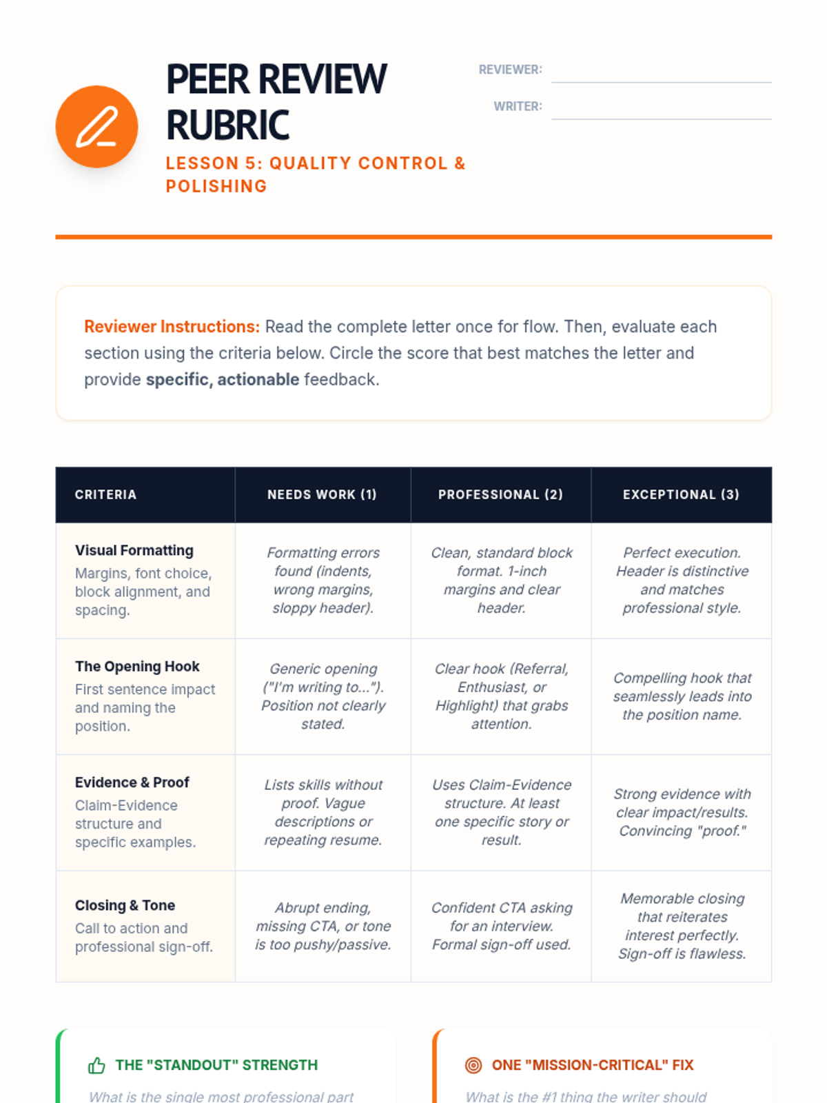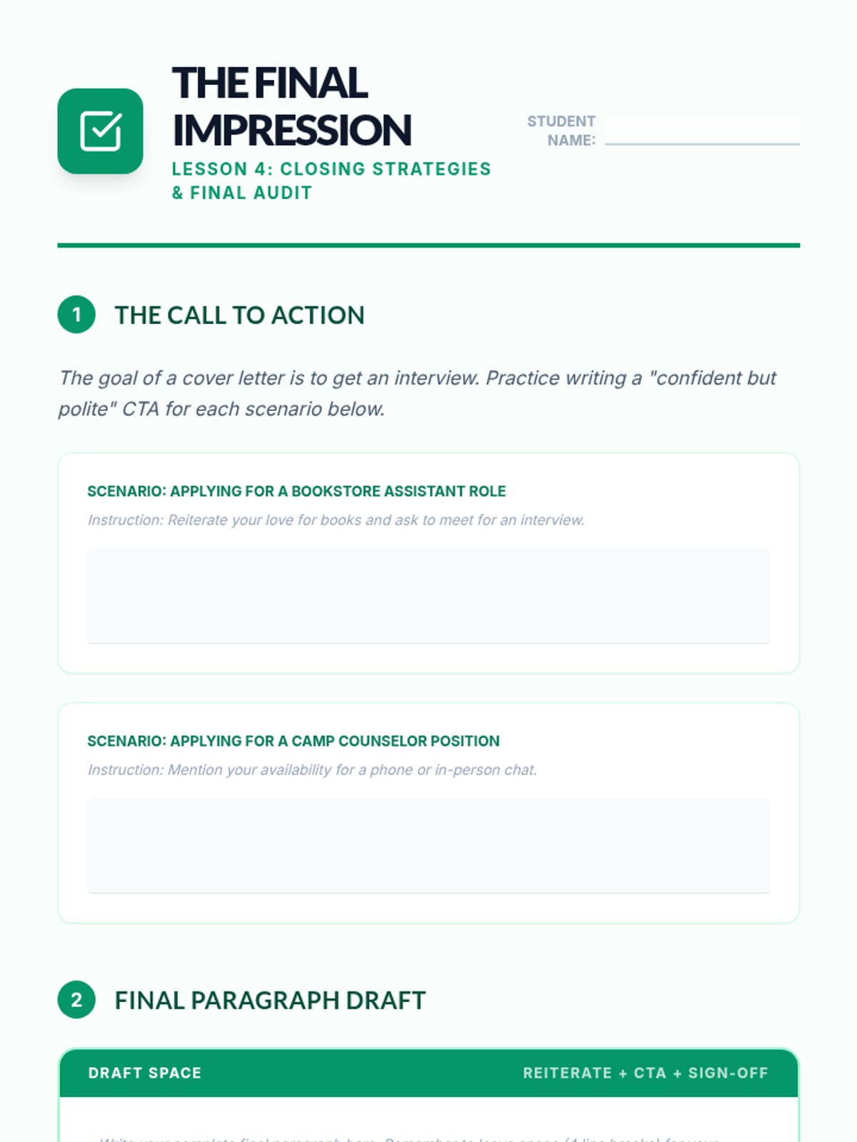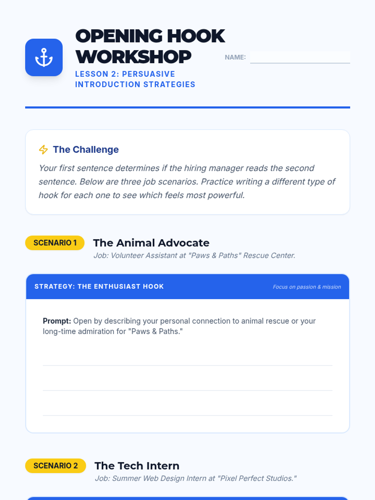 A comprehensive 5-lesson sequence designed to teach 9th-grade students the essential structure, formatting, and persuasive writing techniques required for professional cover letters. Students progress from basic document formatting to crafting compelling body paragraphs and professional closings, culminating in a polished, peer-reviewed draft.