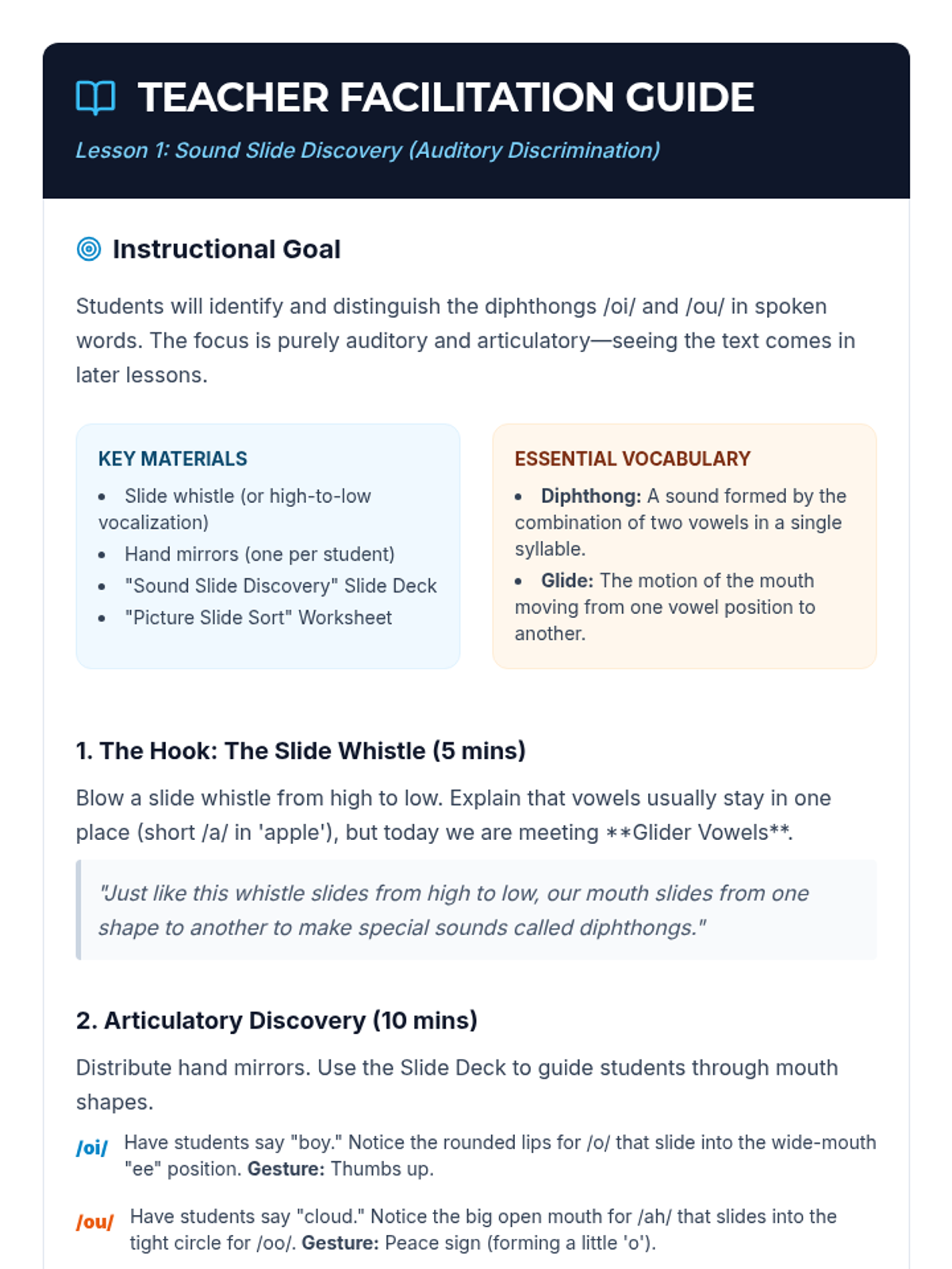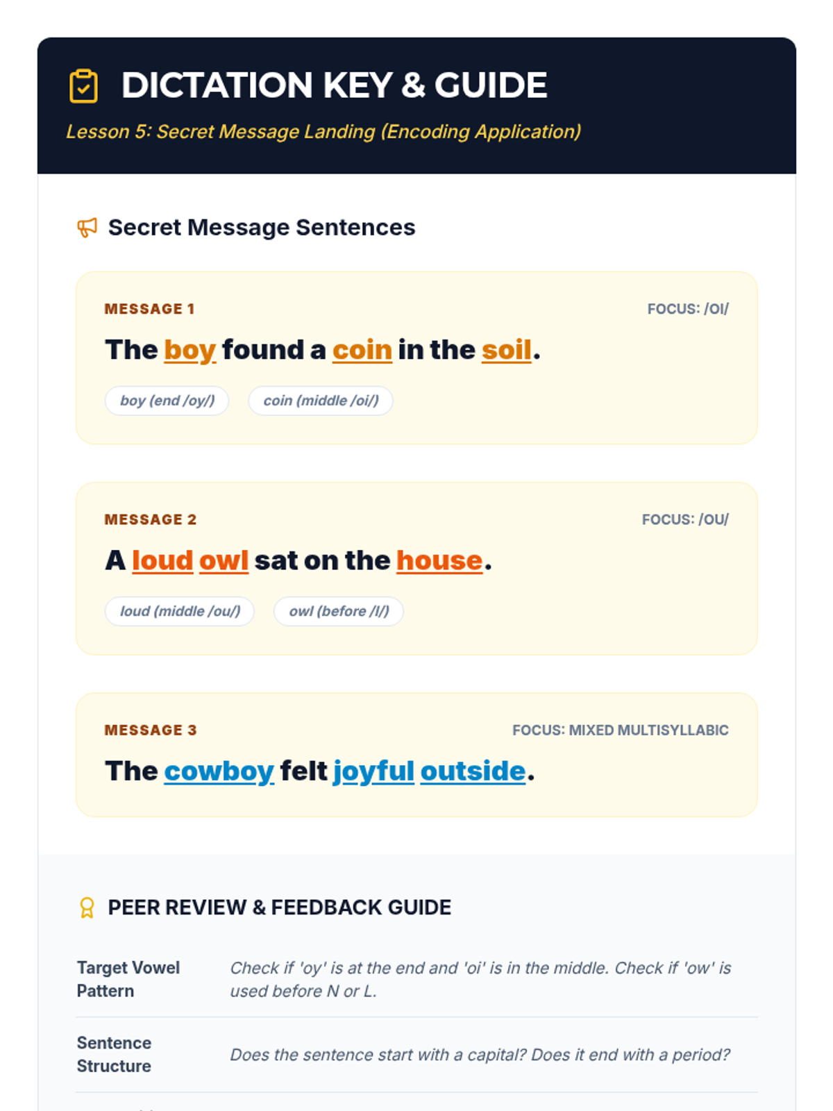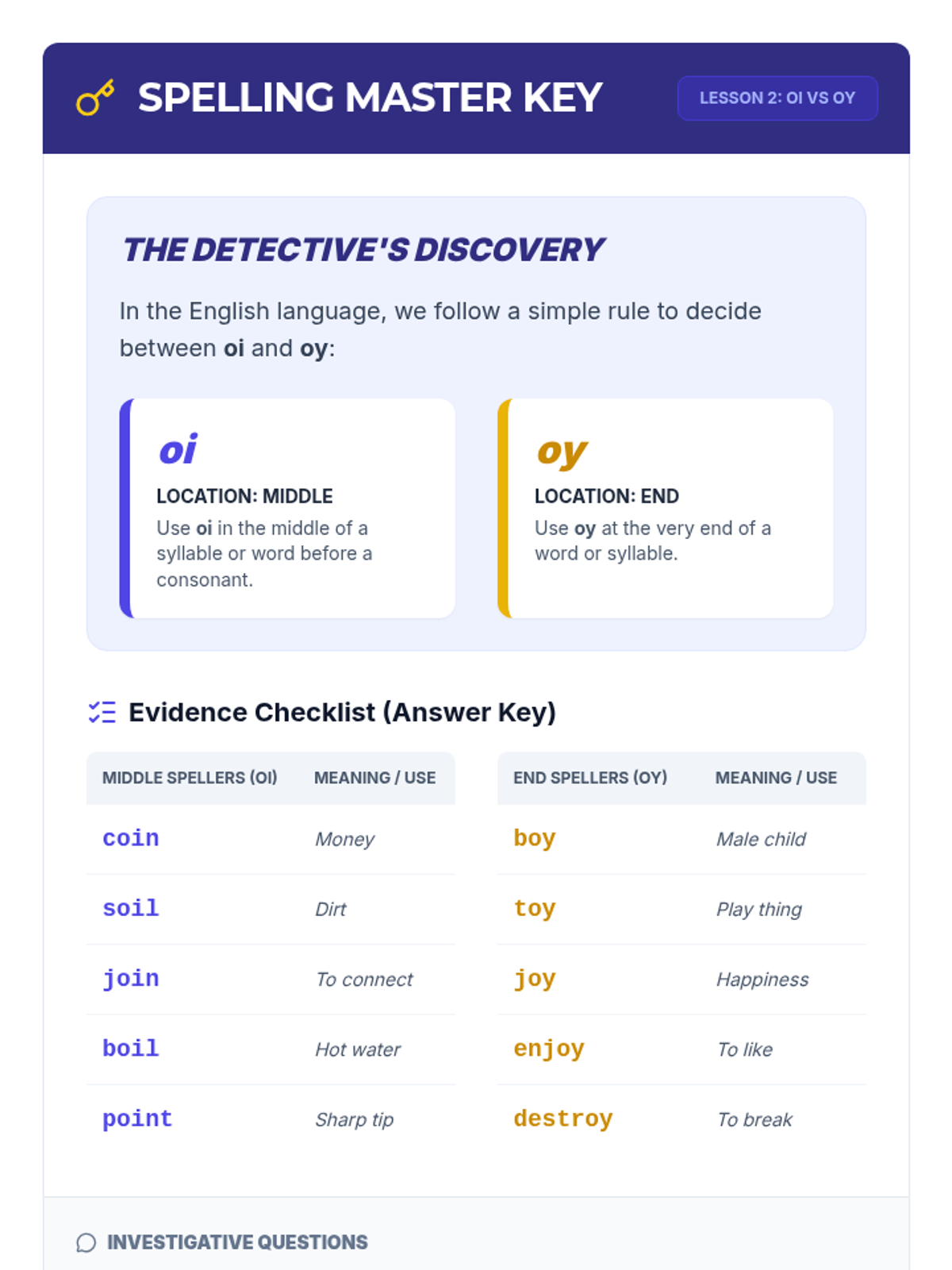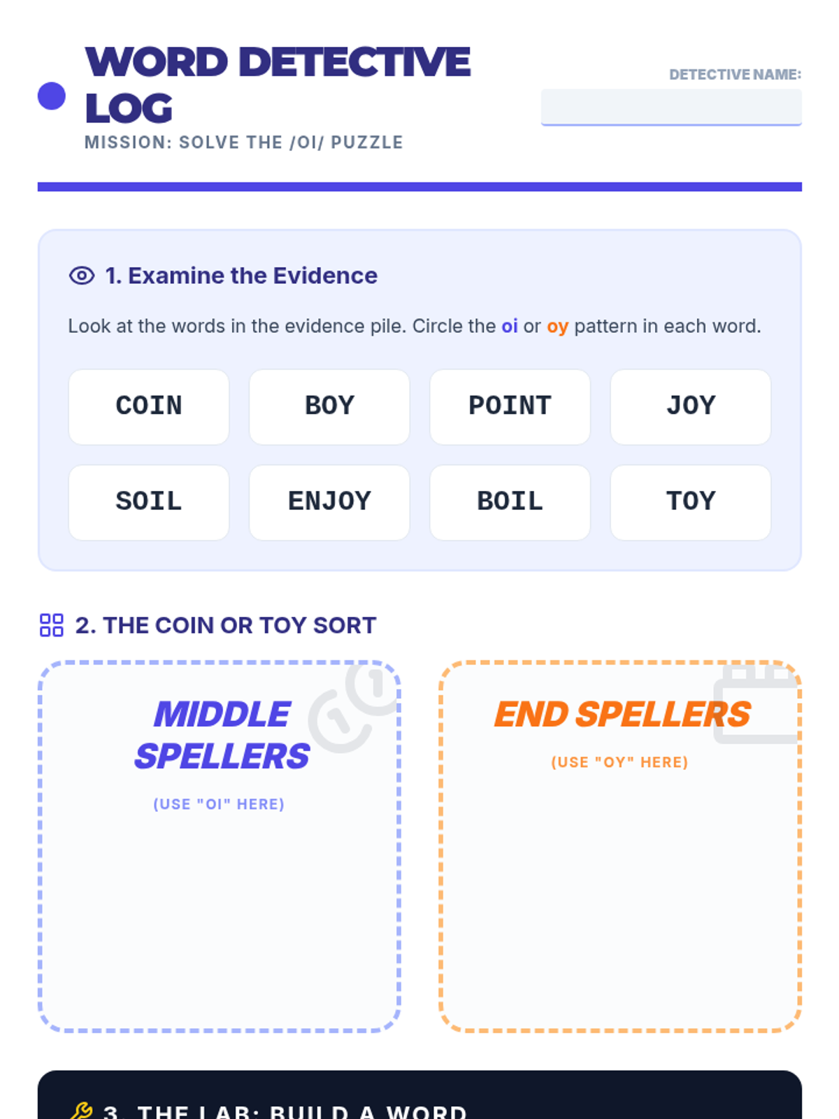 A comprehensive phonics unit for 2nd Grade focusing on the auditory discrimination, decoding, and encoding of the diphthongs /oi/ (oi, oy) and /ou/ (ou, ow). Students progress from sound recognition to applying positional spelling rules in multisyllabic words and sentences.