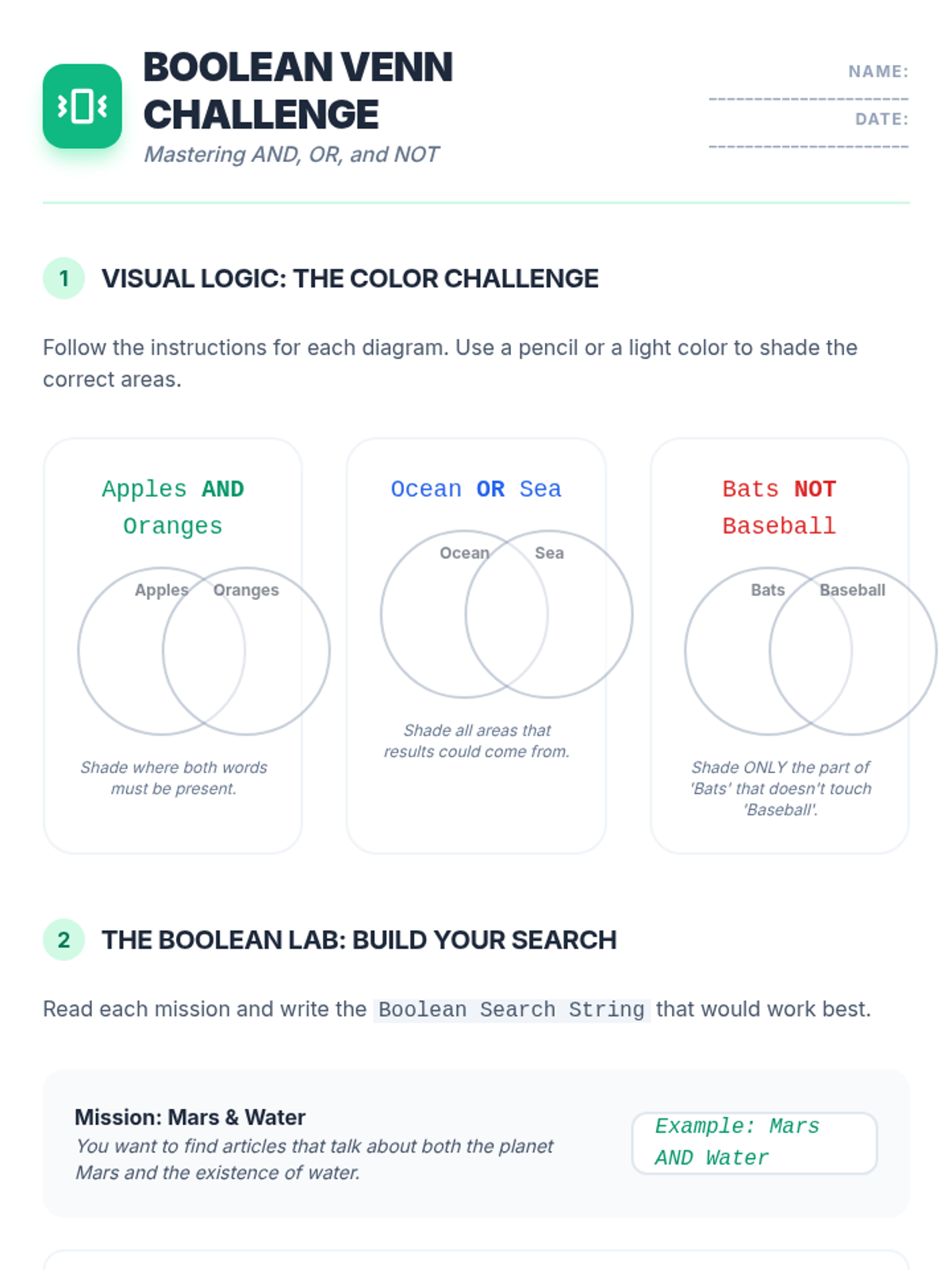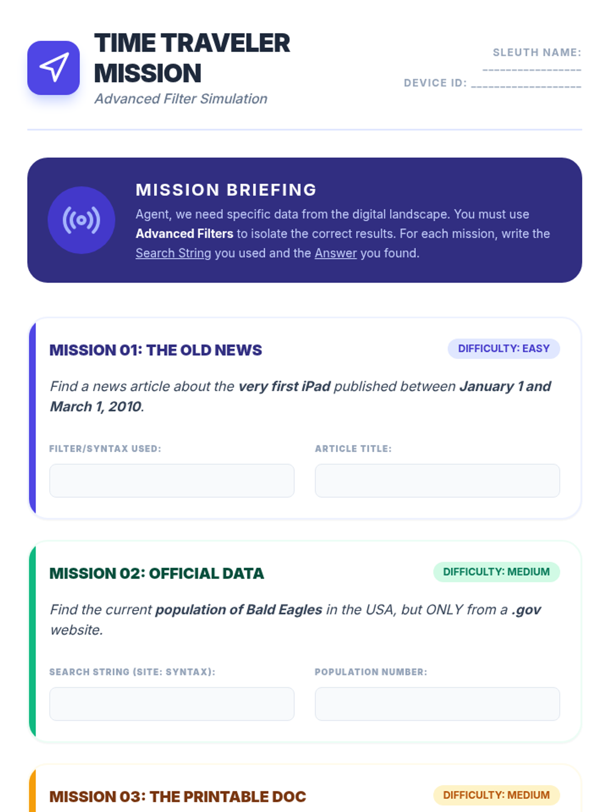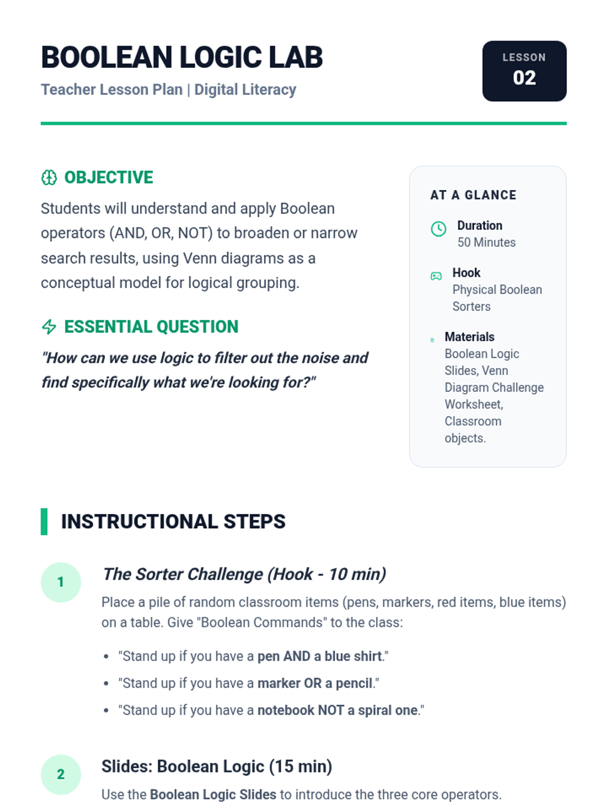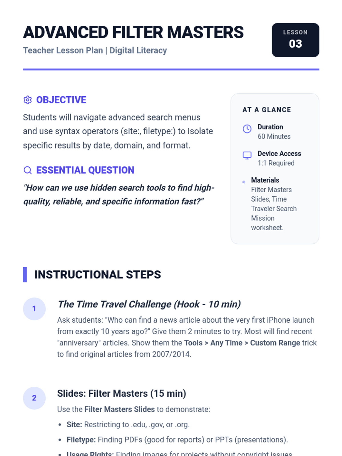 A 5-lesson sequence for 5th graders to master effective online search strategies. Students move from basic keyword selection to using complex Boolean operators, advanced filters, and critical analysis of search results to become efficient 'Search Sleuths'.