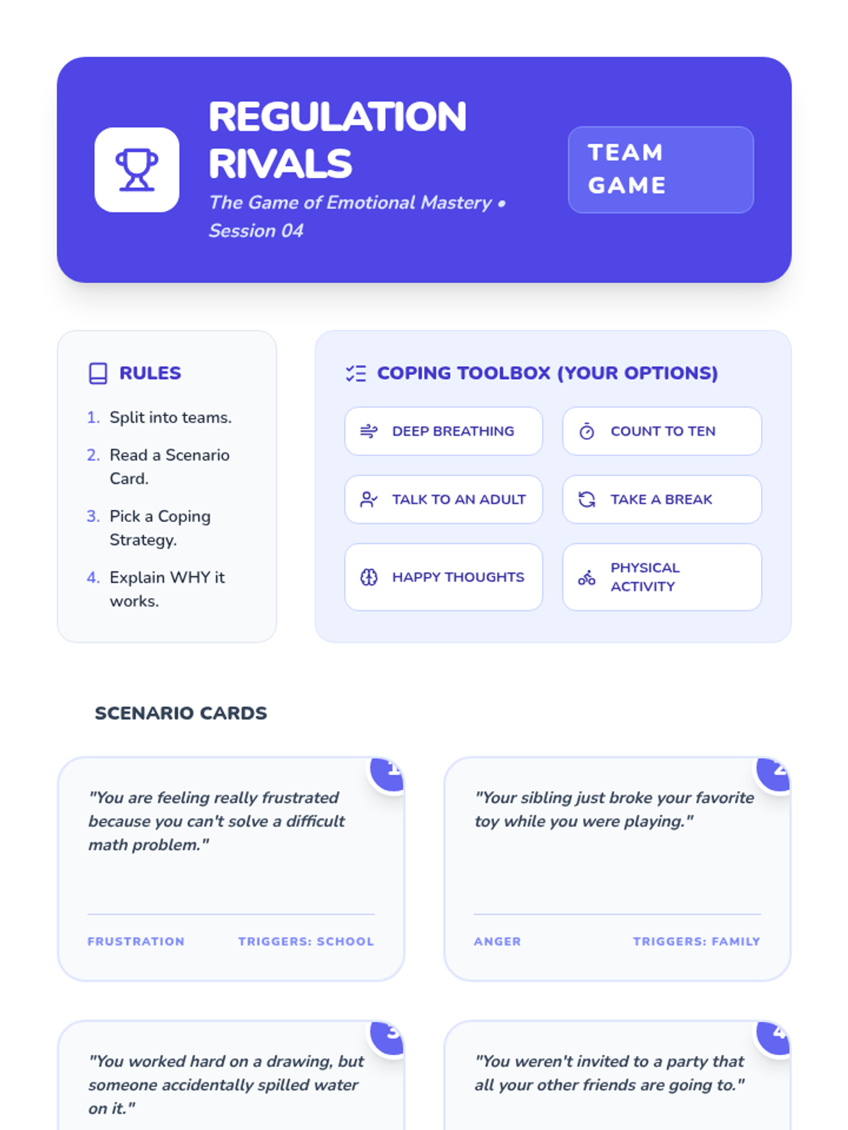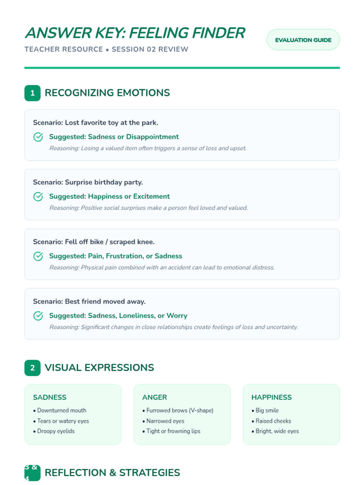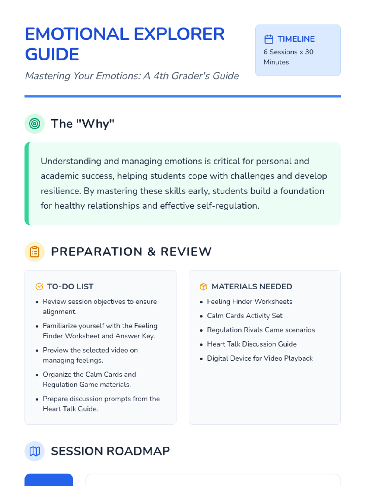 A comprehensive 6-session sequence designed for 4th graders to build emotional intelligence. Students explore identifying, expressing, and managing negative emotions through interactive games, role-play, and mindfulness techniques.