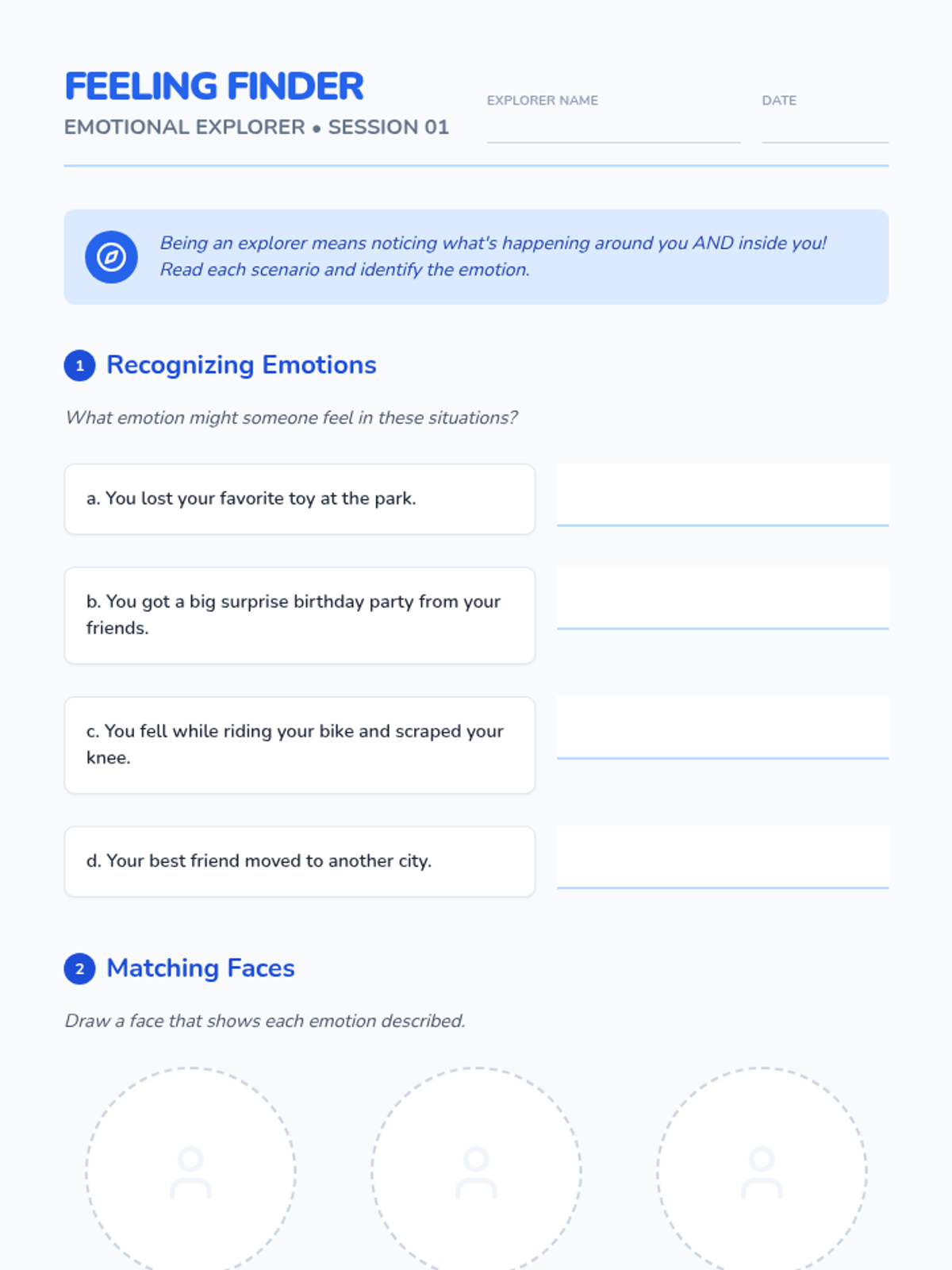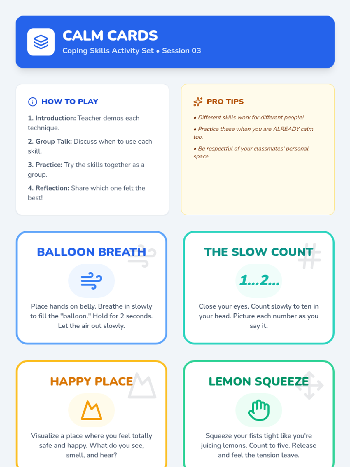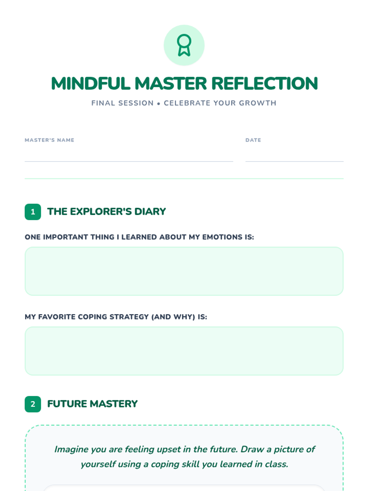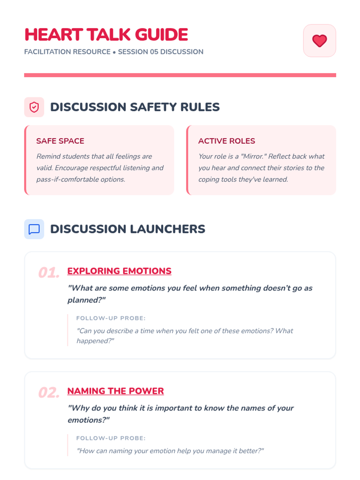 A comprehensive 6-session sequence designed for 4th graders to build emotional intelligence. Students explore identifying, expressing, and managing negative emotions through interactive games, role-play, and mindfulness techniques.