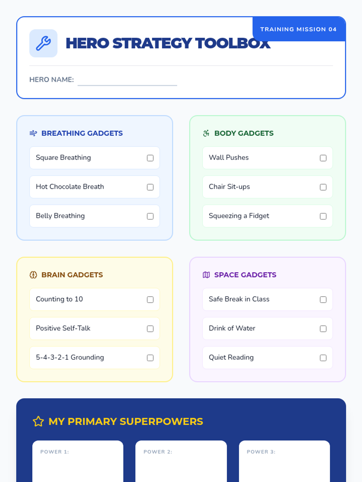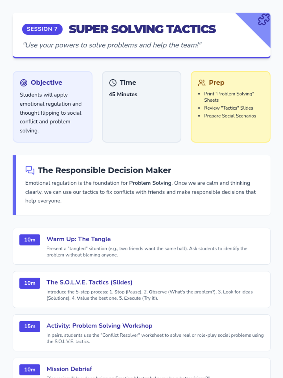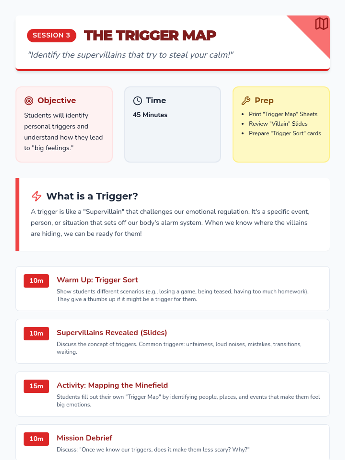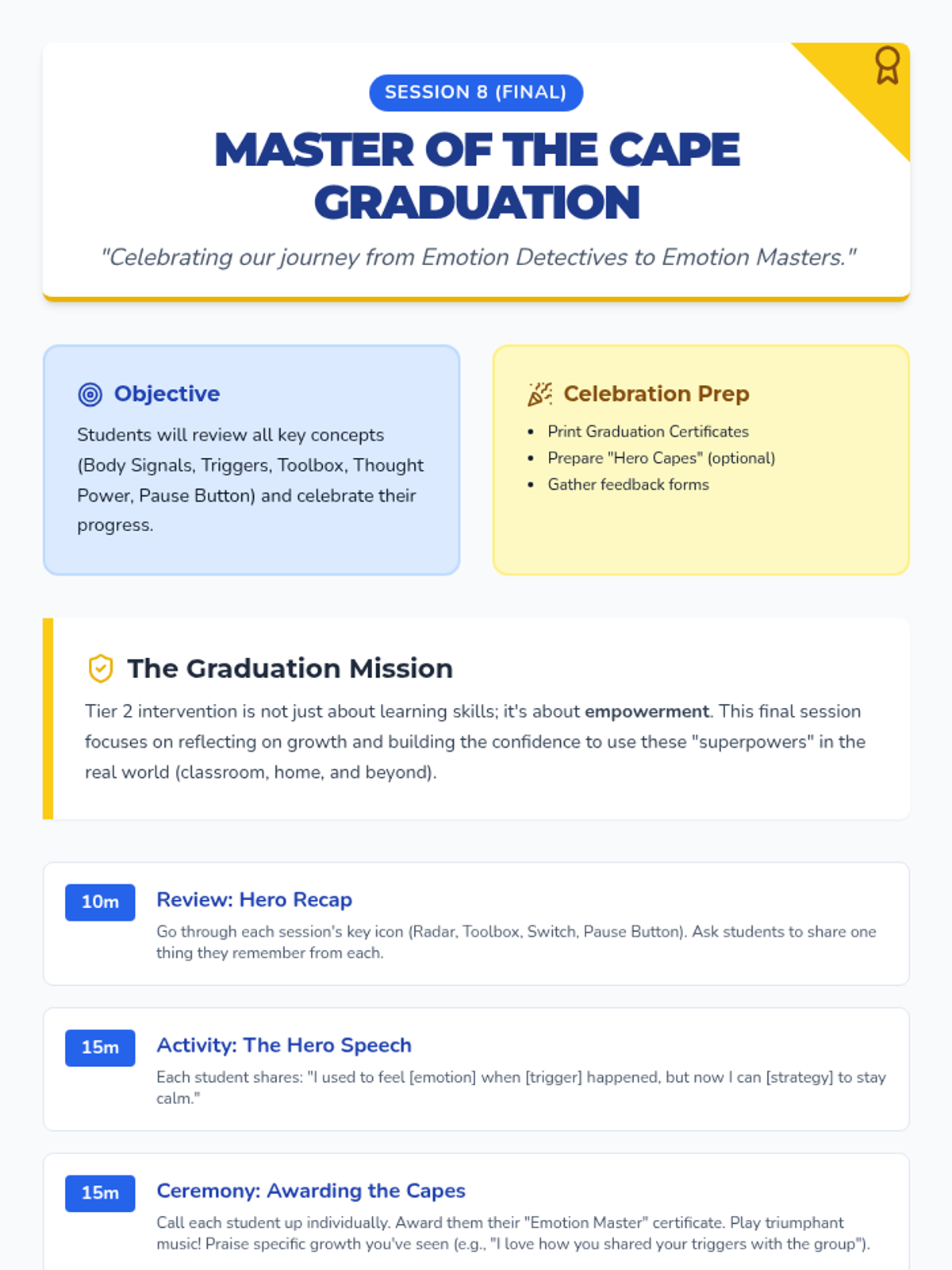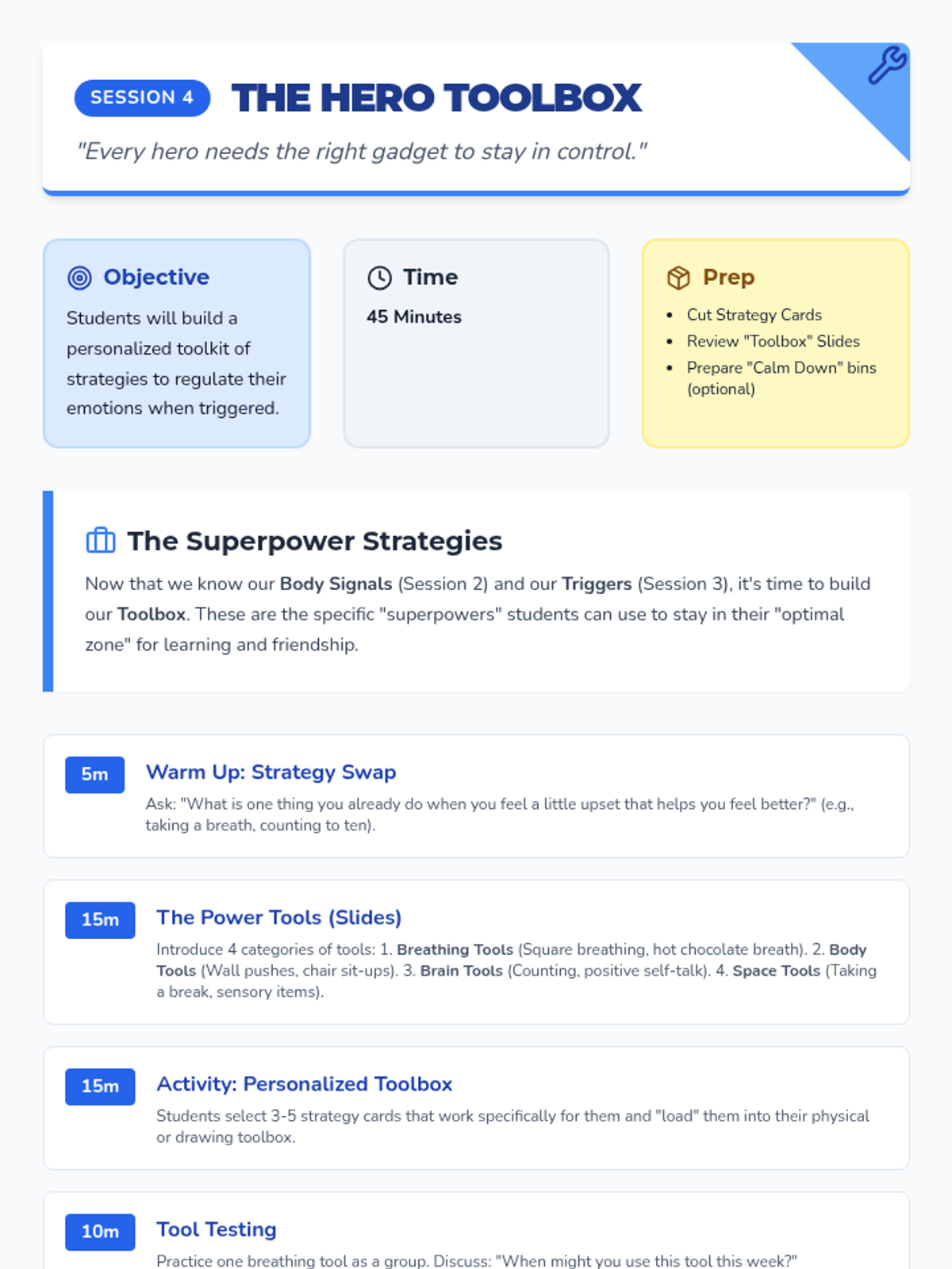 An 8-session Tier 2 intervention sequence designed for 4th graders to develop emotional regulation and responsible decision-making skills. The program uses a 'Superhero Academy' theme to engage students in identifying emotions, recognizing body signals, and building a toolbox of coping strategies.