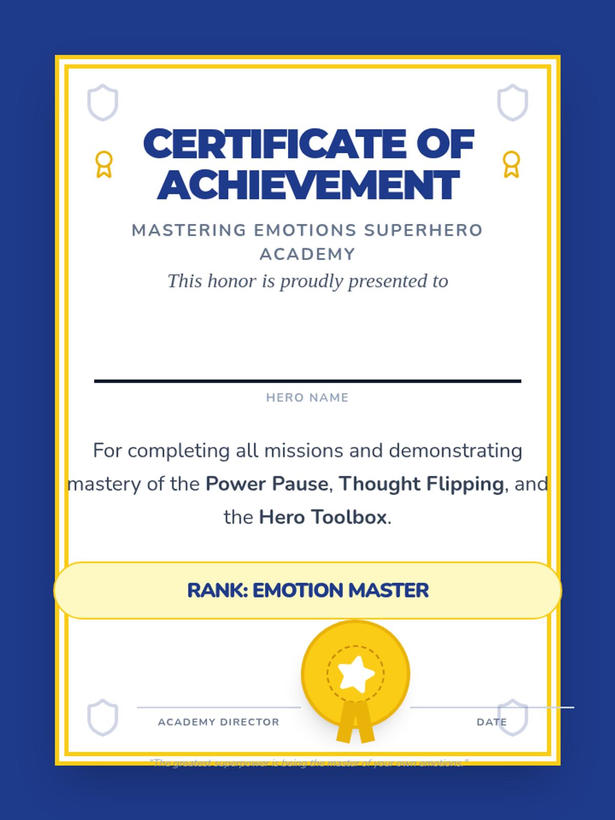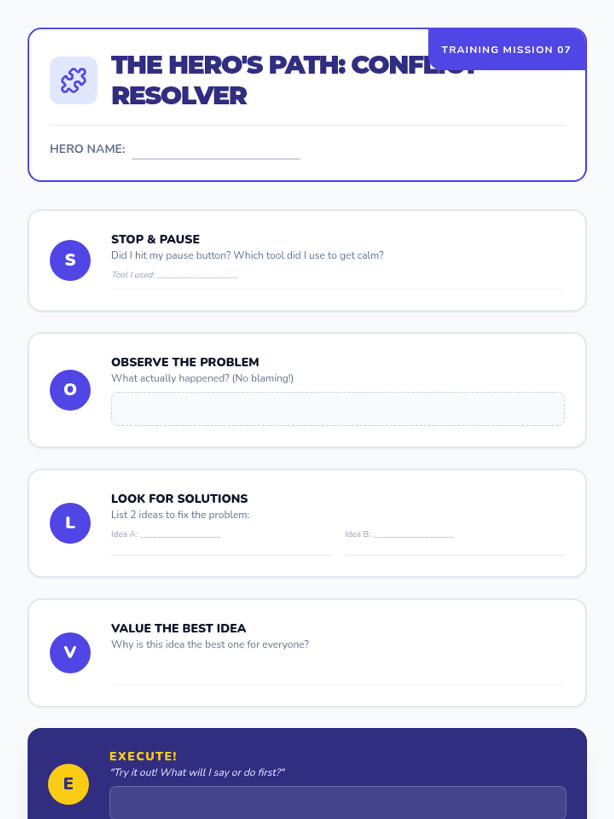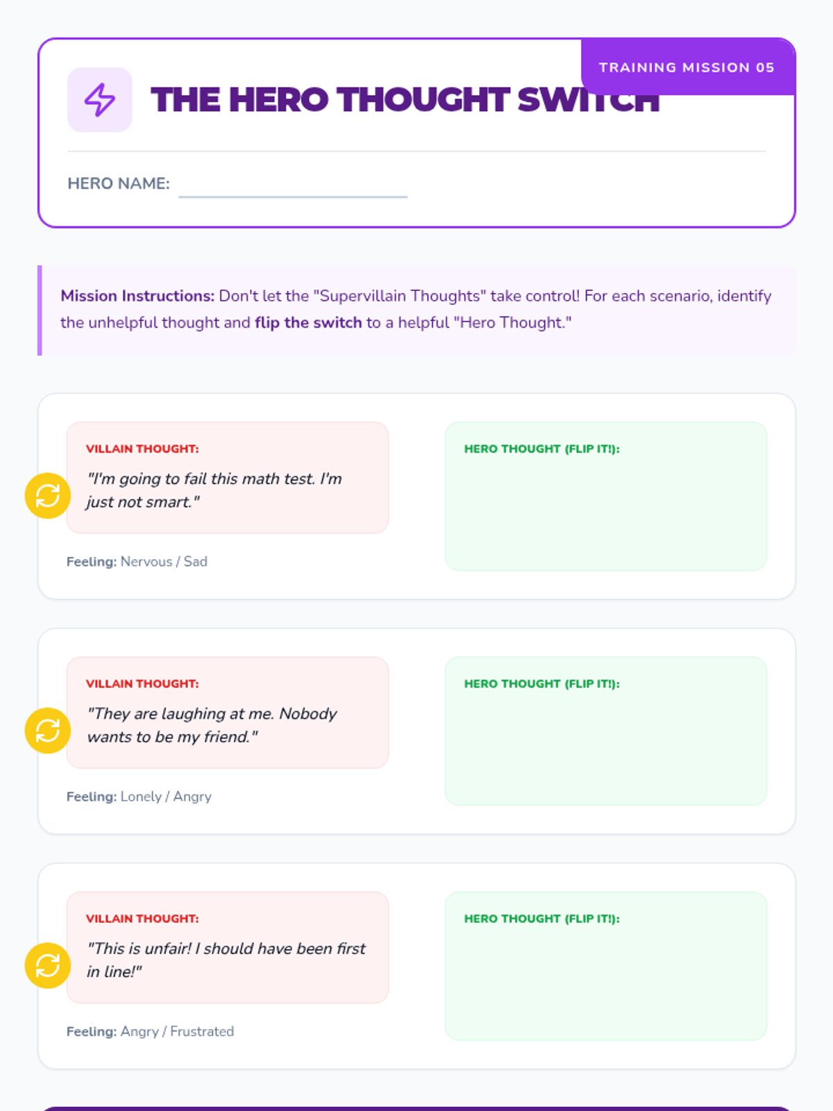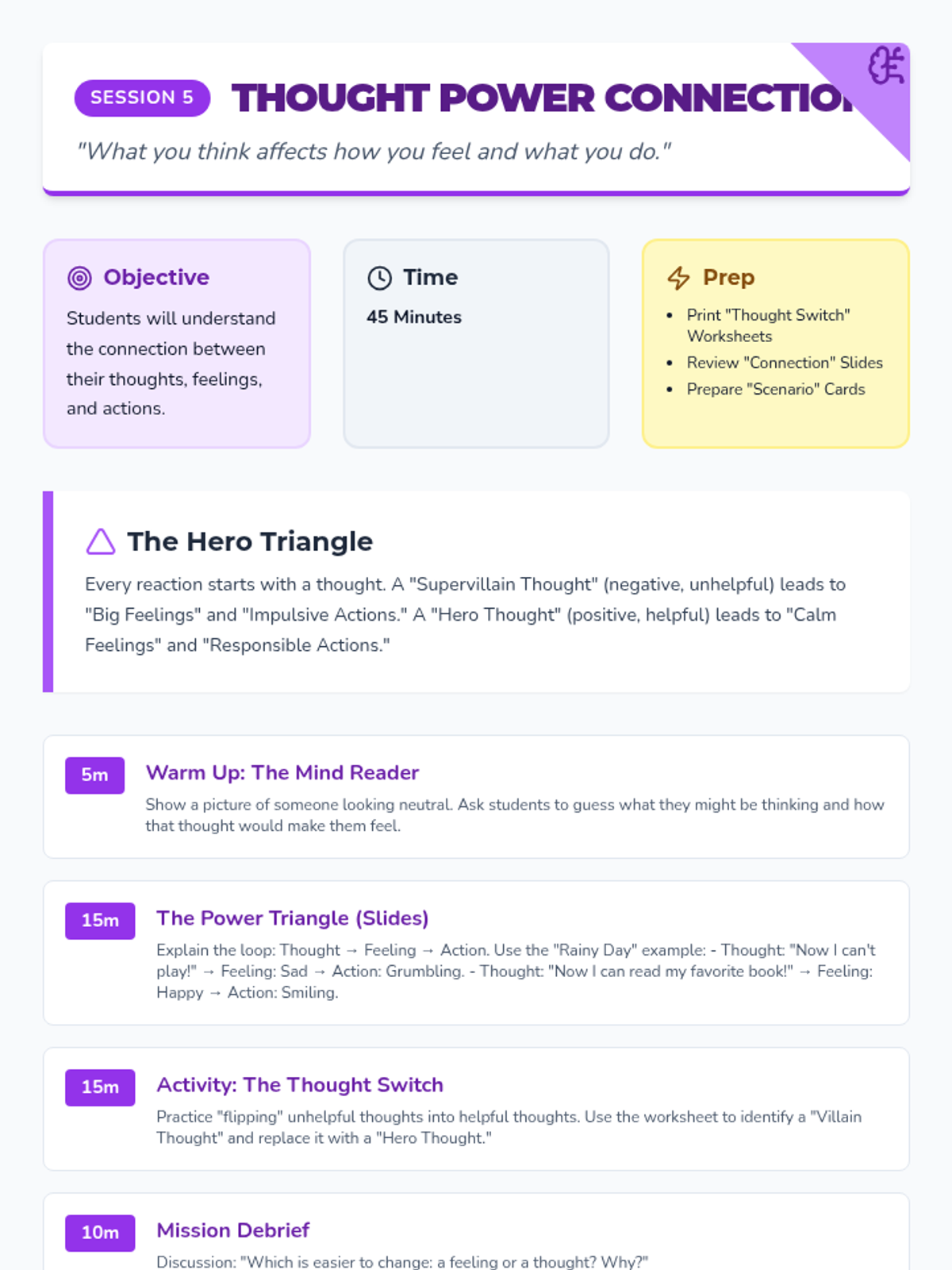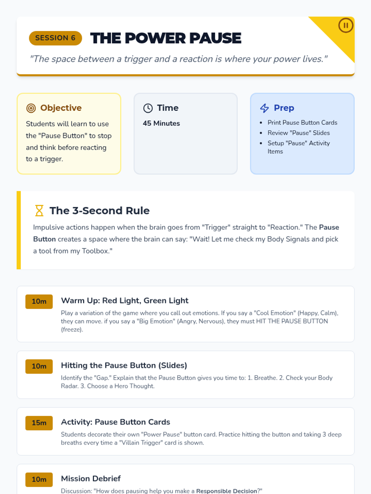 An 8-session Tier 2 intervention sequence designed for 4th graders to develop emotional regulation and responsible decision-making skills. The program uses a 'Superhero Academy' theme to engage students in identifying emotions, recognizing body signals, and building a toolbox of coping strategies.