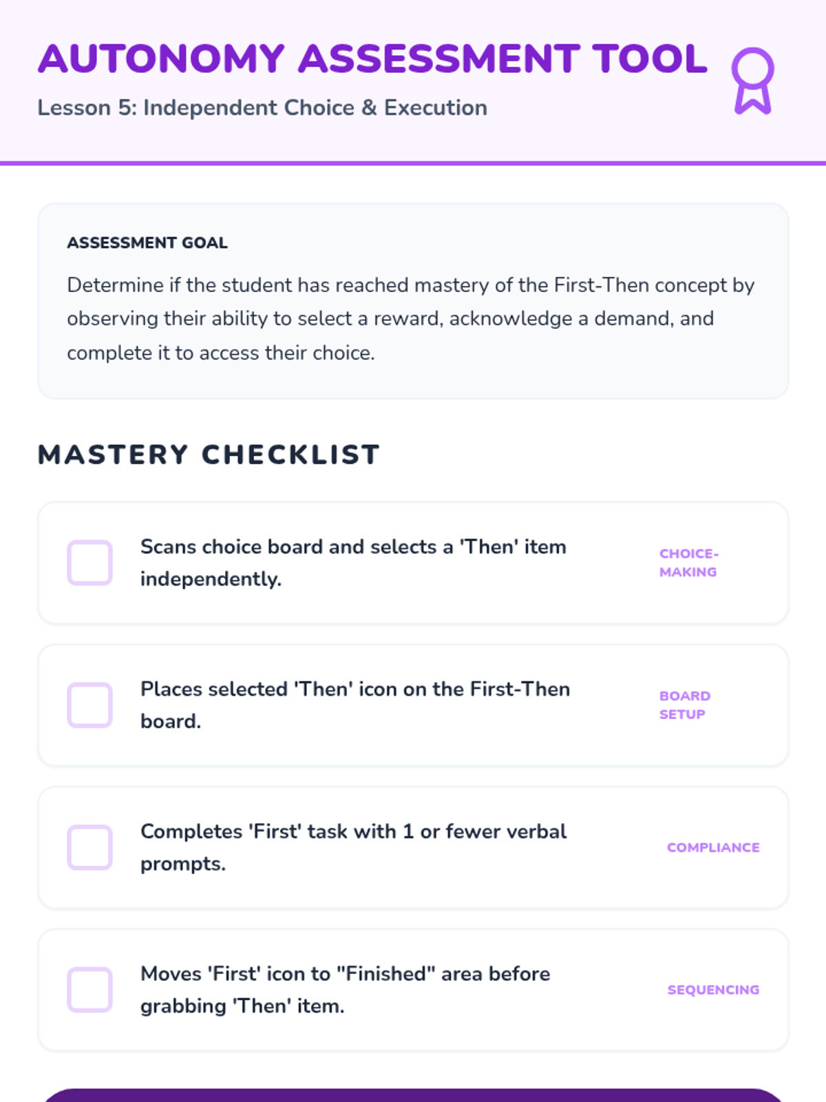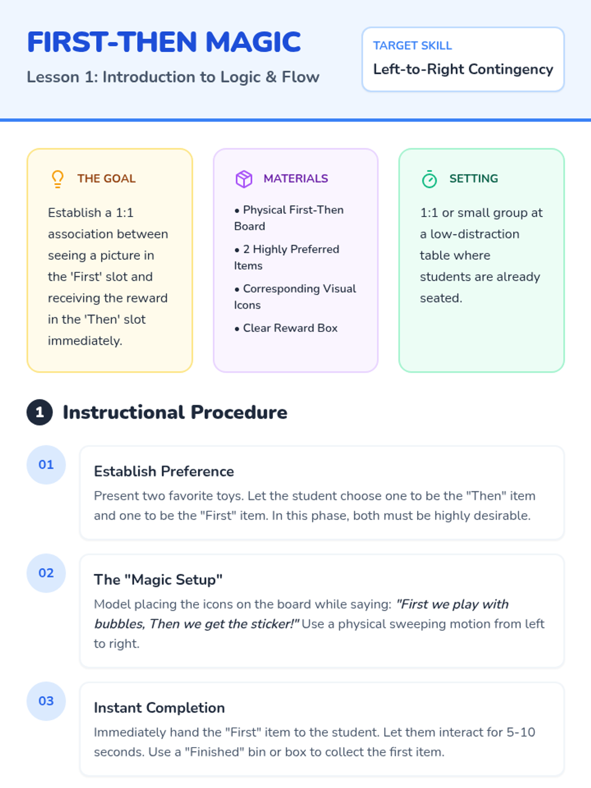A foundational sequence for Pre-K students to master 'First-Then' contingencies using visual schedules. This unit moves from basic logic and symbol recognition to independent task completion and choice-making, reducing transition anxiety and building autonomy.