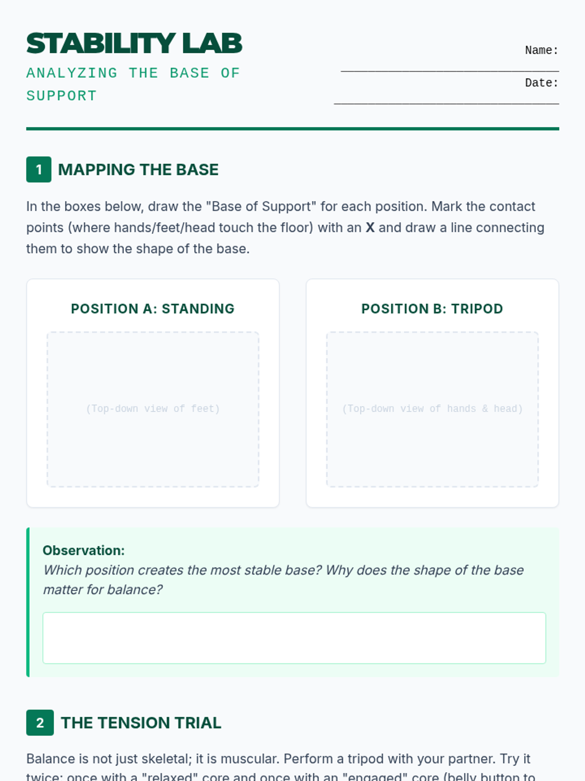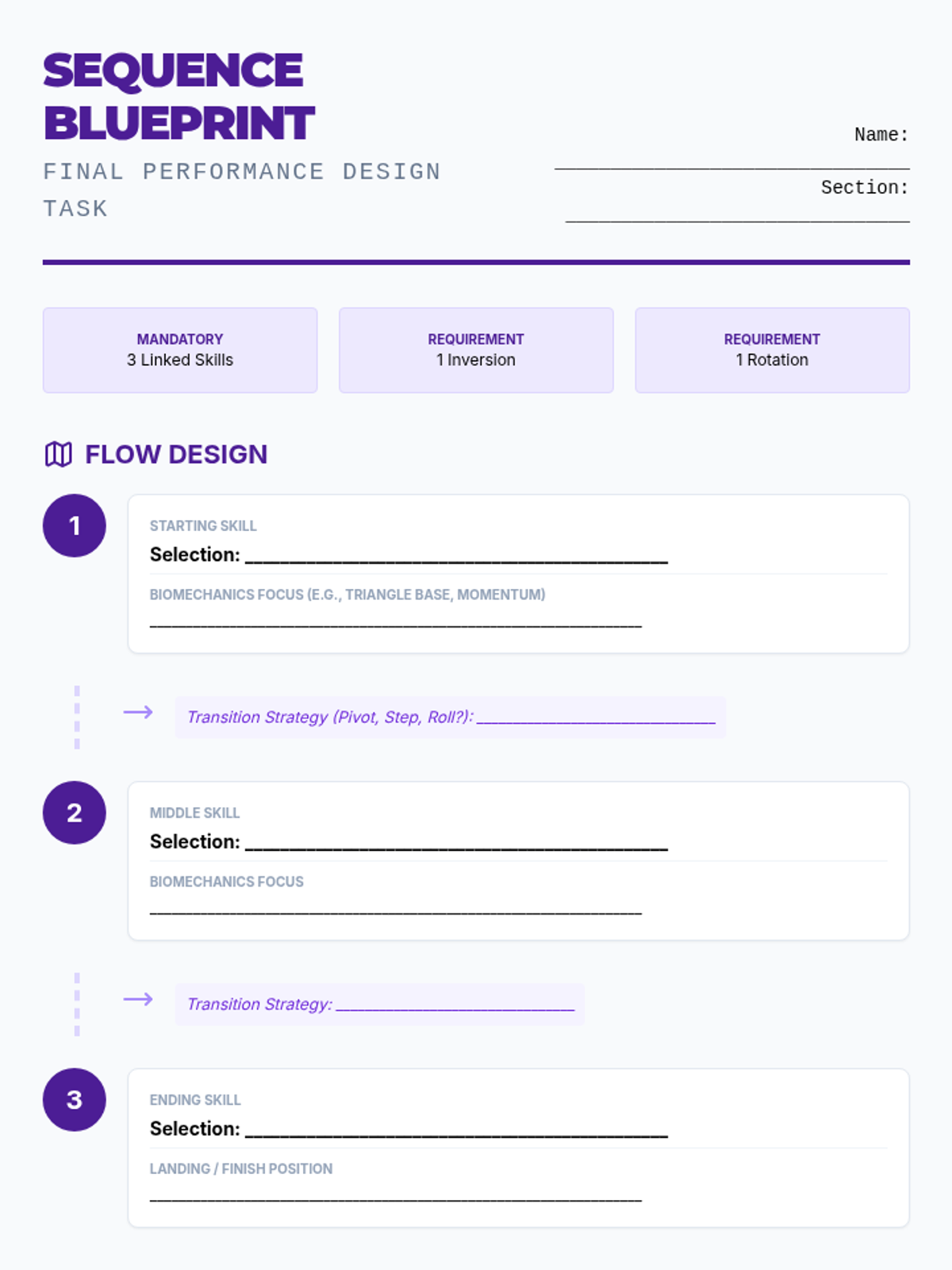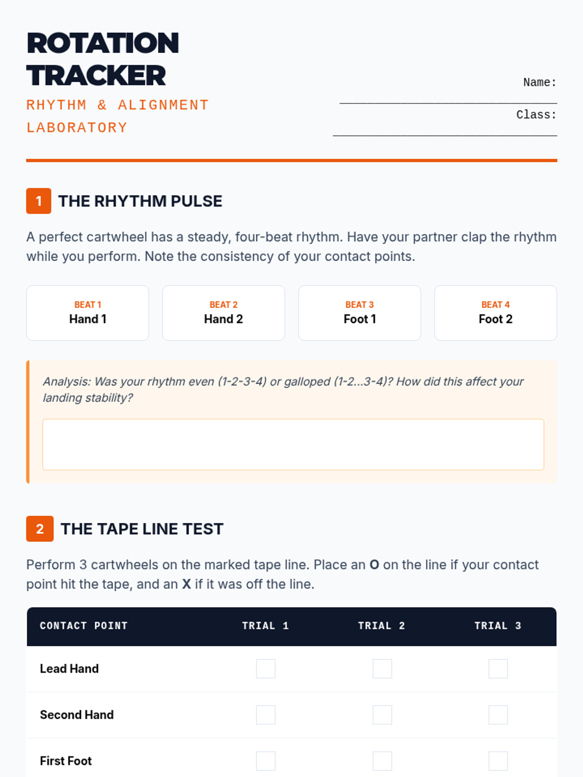 An 8th-grade gymnastics sequence focusing on biomechanics, body alignment, and the physics of floor skills. Students progress from safety rolls to complex inversions and lateral rotations, emphasizing the relationship between center of gravity and stability.