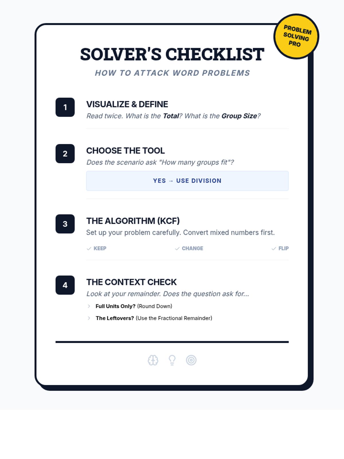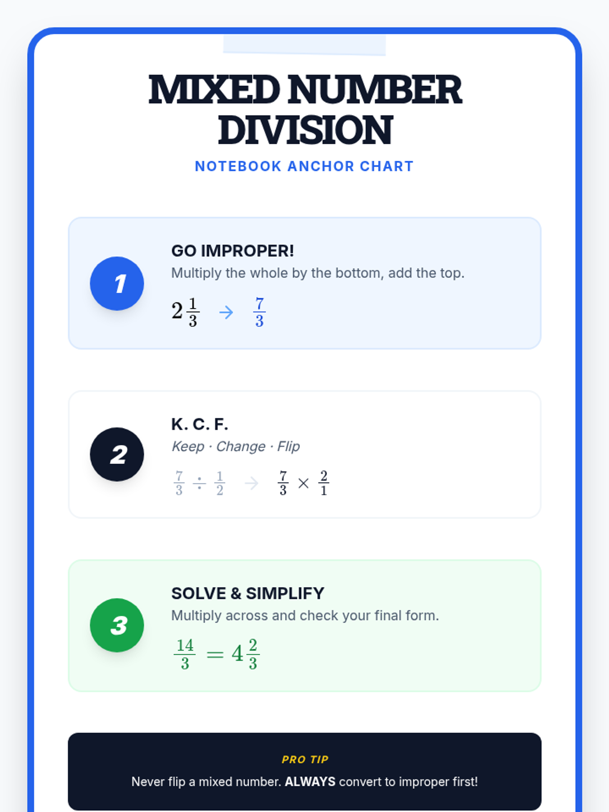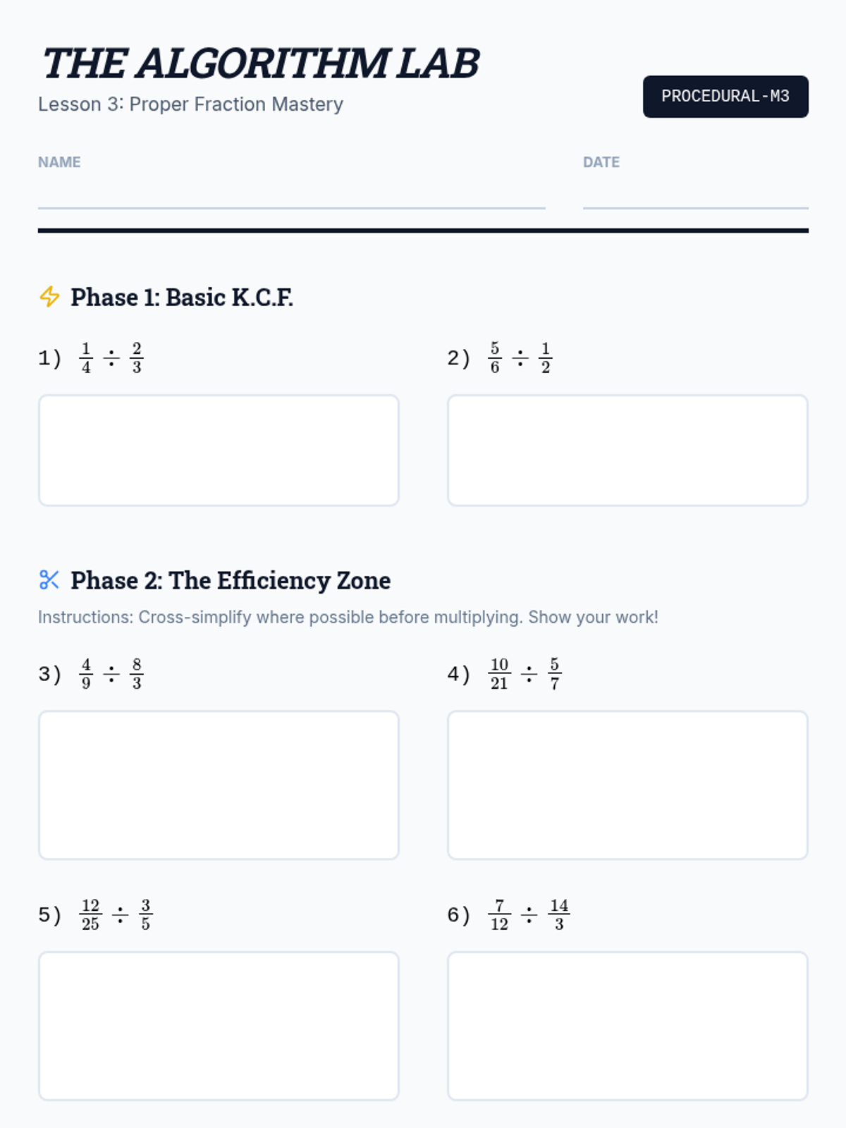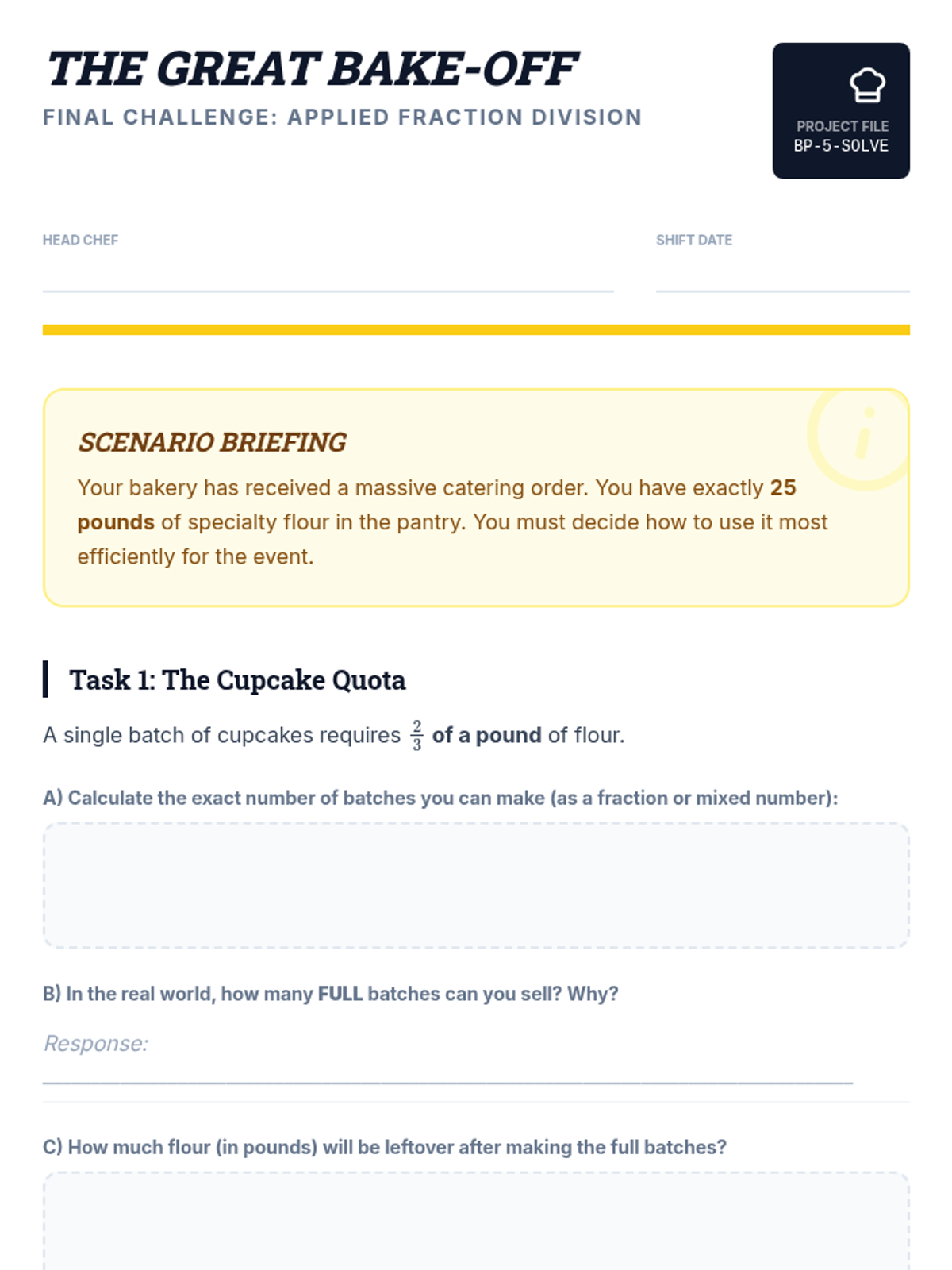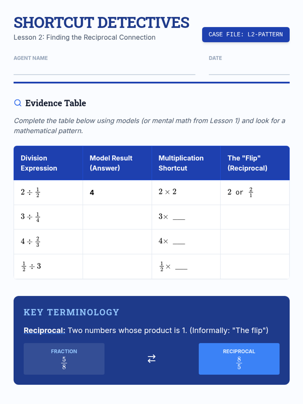 A comprehensive 7th-grade unit that builds a deep conceptual understanding of fraction division, moving from visual modeling to the standard algorithm and real-world application. Students investigate reciprocals, handle mixed numbers, and solve complex multi-step problems.