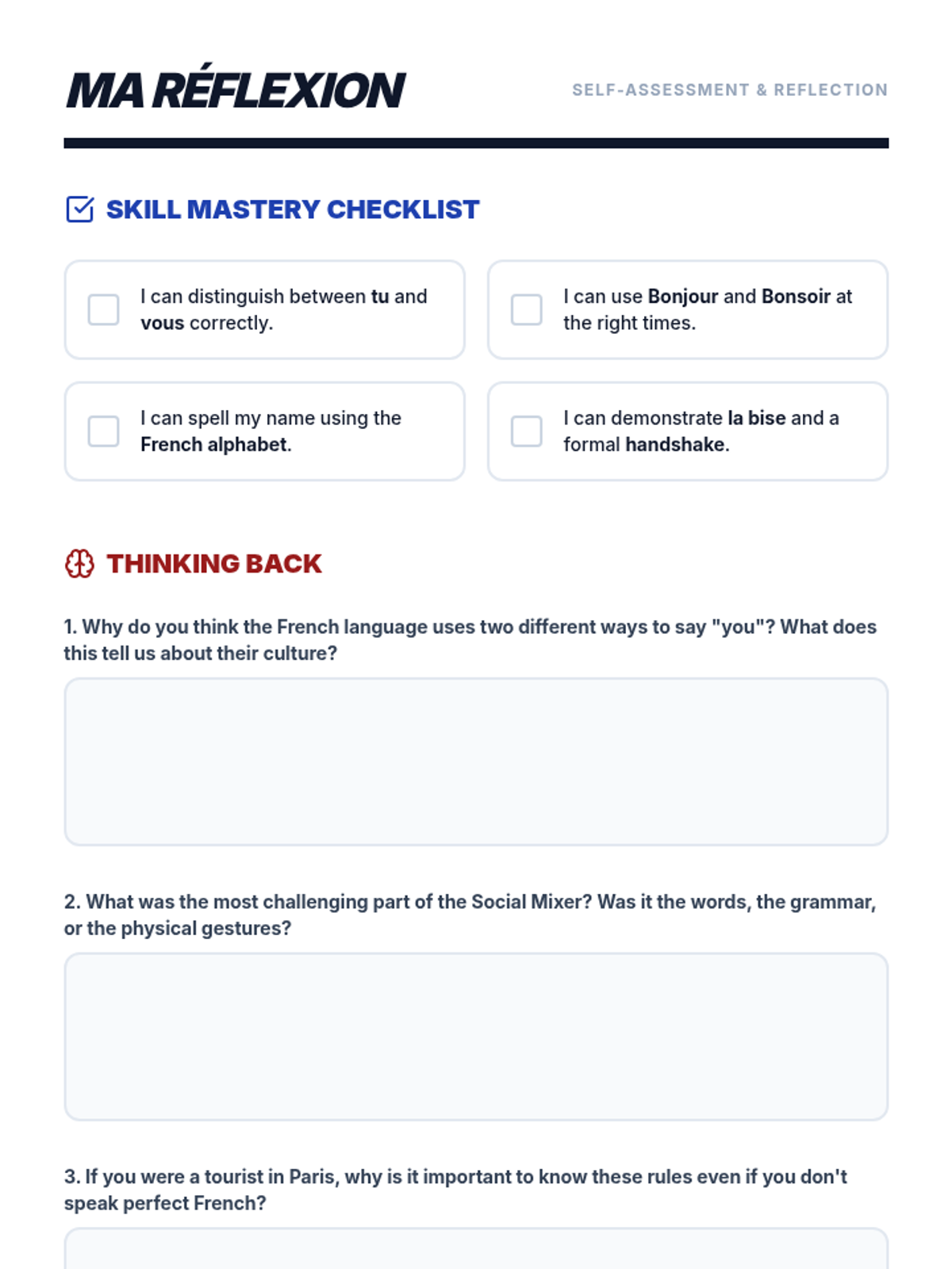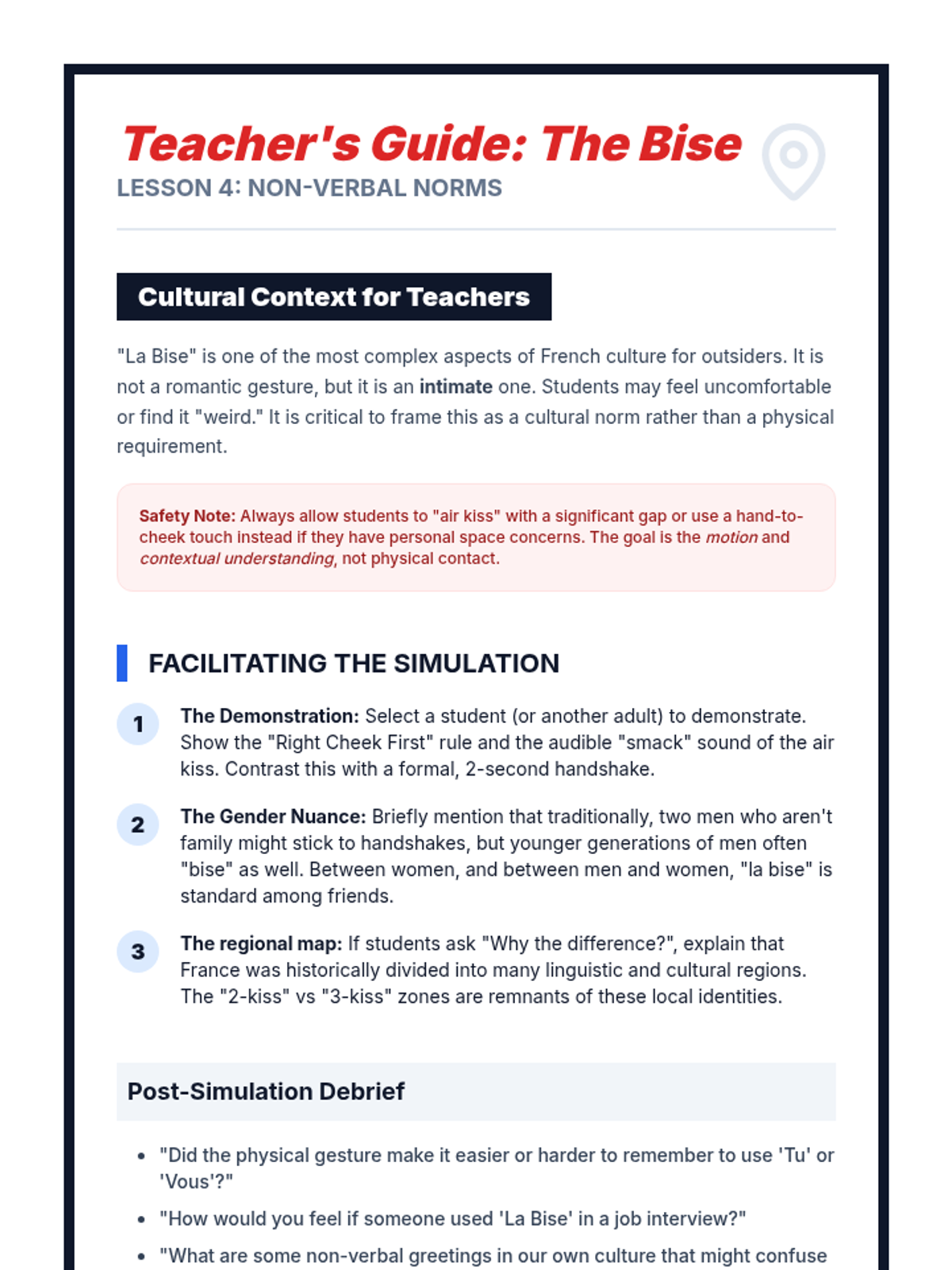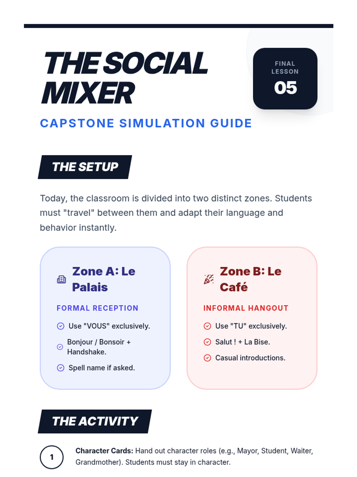 A 5-lesson unit for 8th-grade French students focusing on the nuances of formal and informal greetings, the 'tu' vs. 'vous' distinction, and non-verbal cultural rituals like 'la bise'. Students move from basic vocabulary to fluid social interactions through simulations and register analysis.