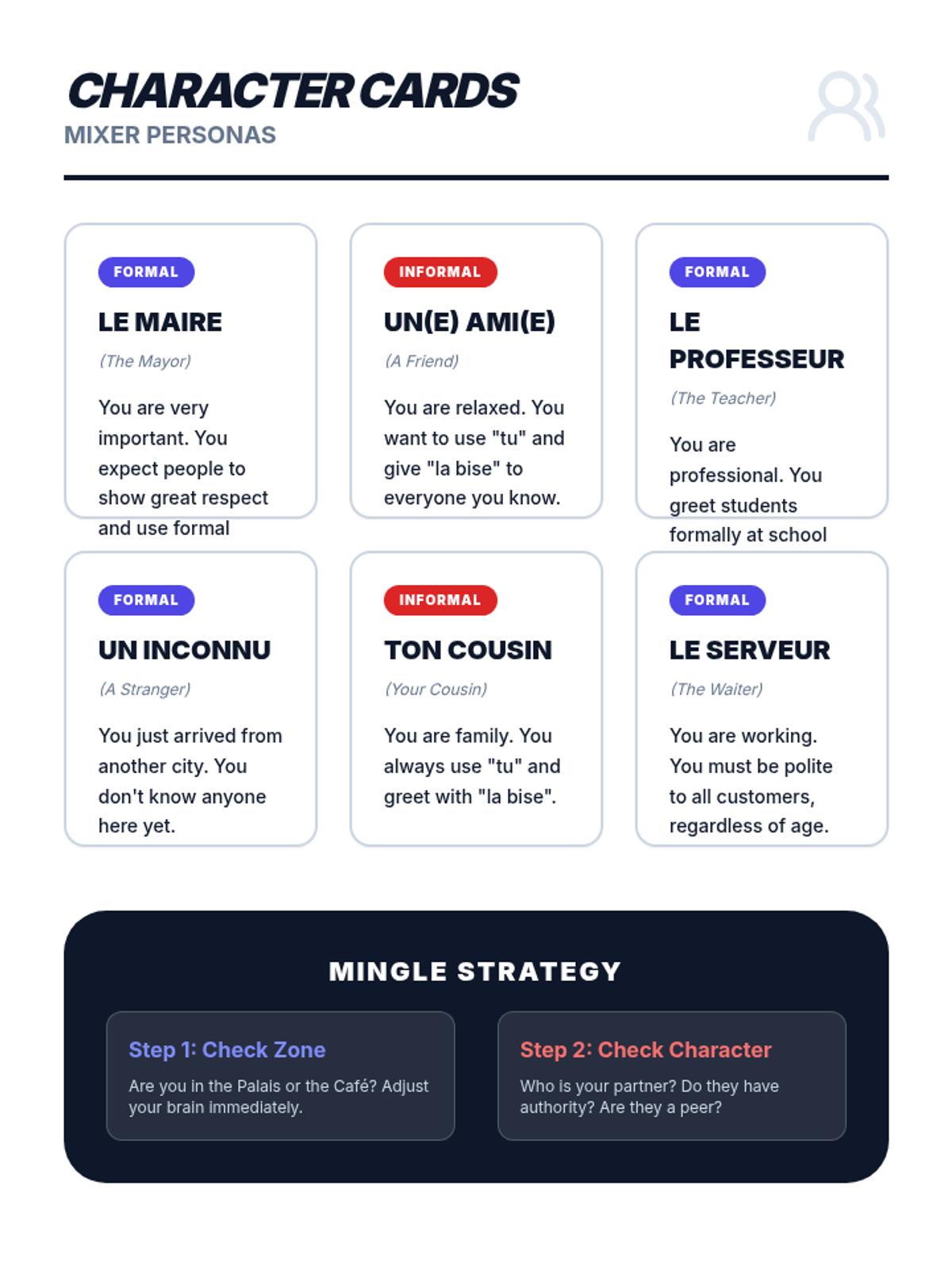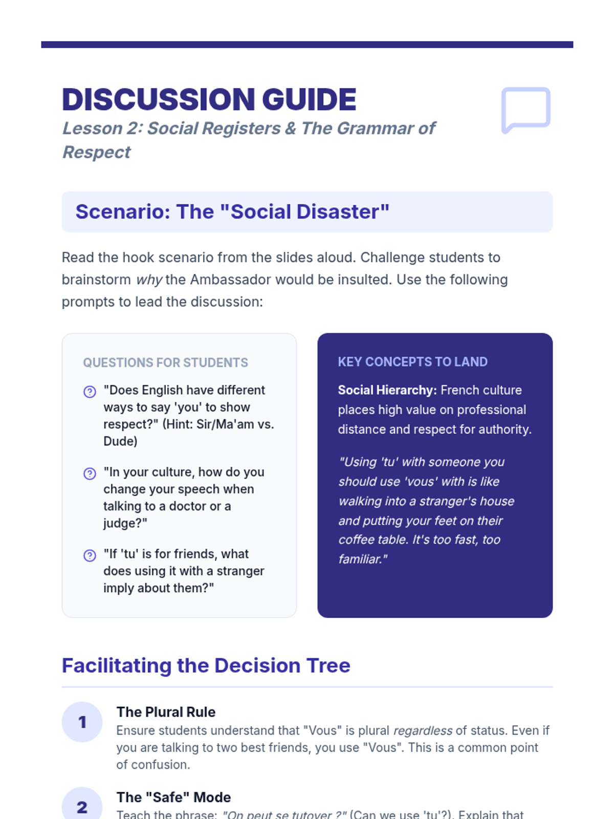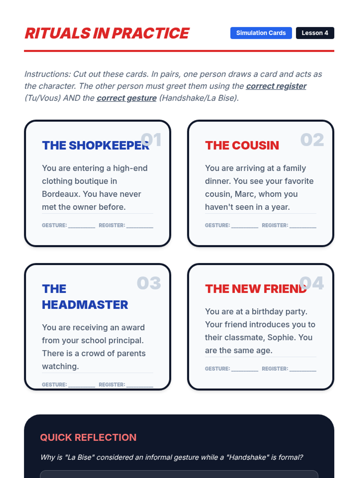 A 5-lesson unit for 8th-grade French students focusing on the nuances of formal and informal greetings, the 'tu' vs. 'vous' distinction, and non-verbal cultural rituals like 'la bise'. Students move from basic vocabulary to fluid social interactions through simulations and register analysis.