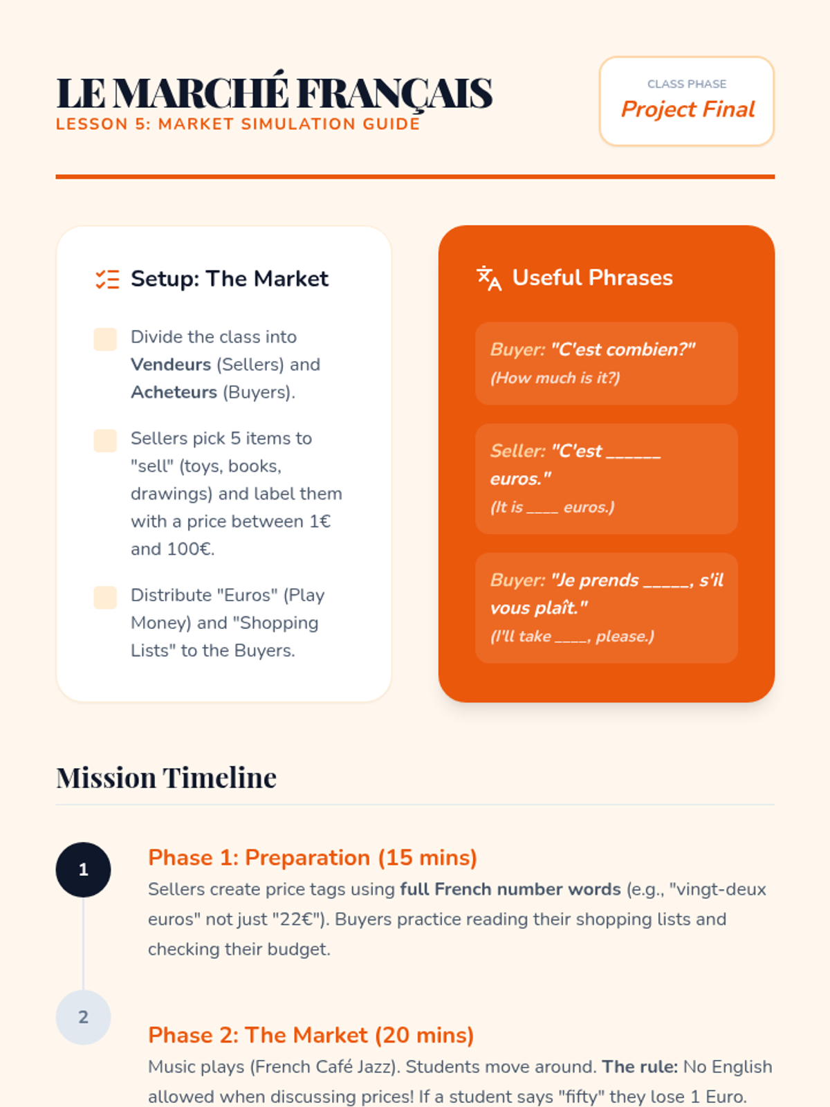 A comprehensive sequence for 3rd-grade students to master French numbers from 0 to 100, focusing on pronunciation, logical patterns, and real-world application through games and a market simulation.