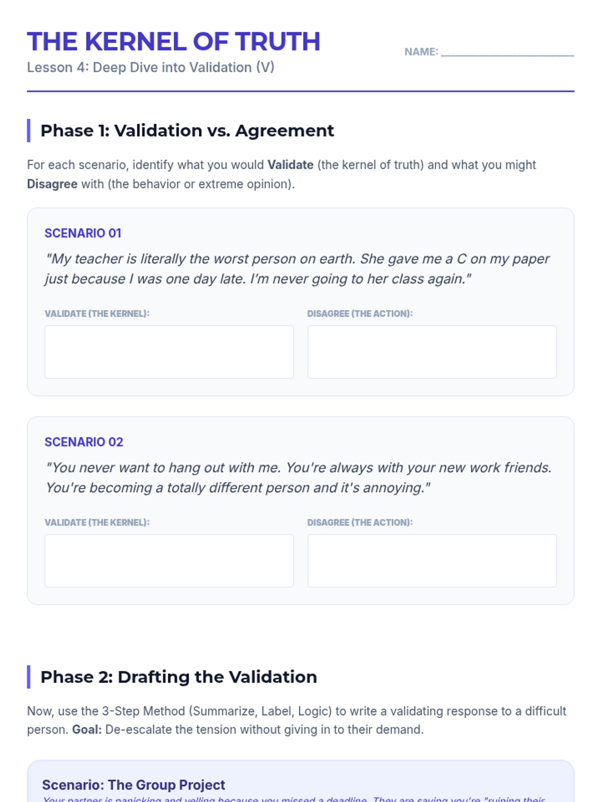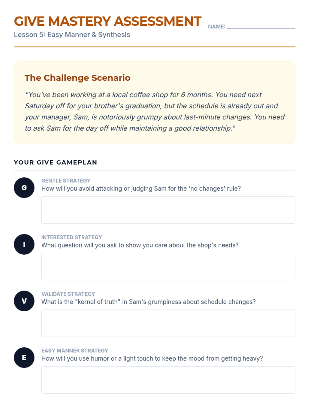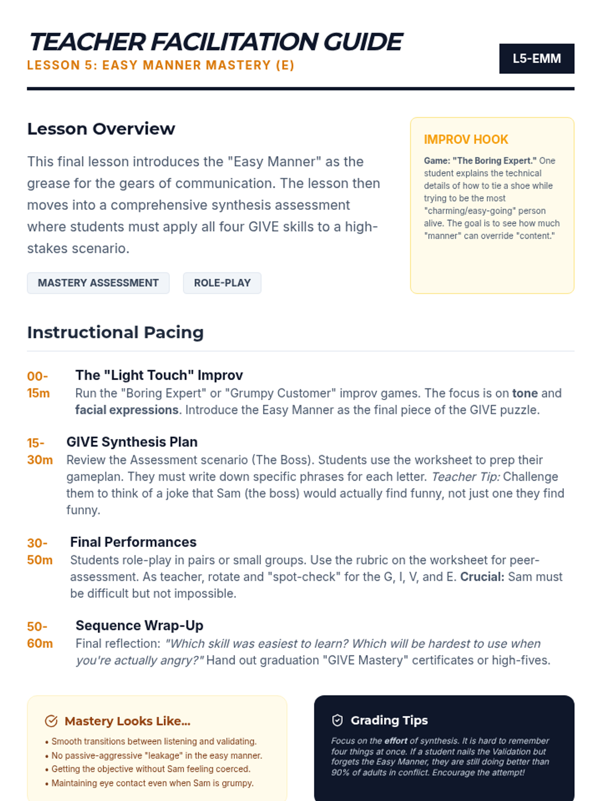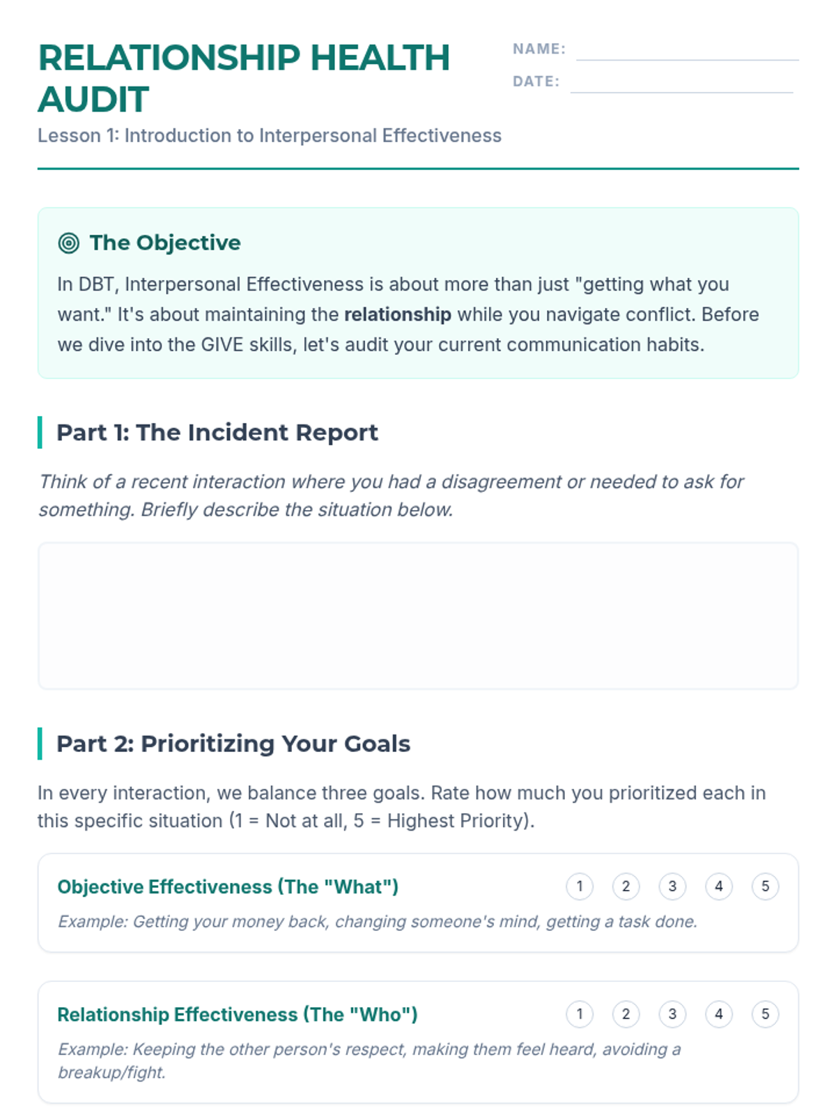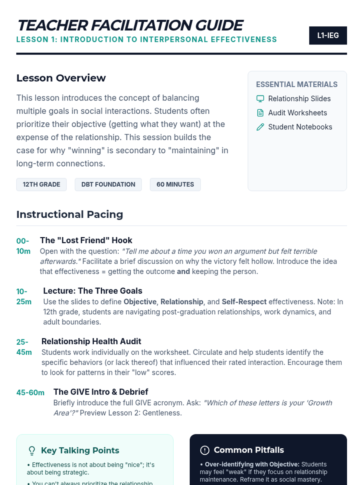 A 5-lesson sequence for 12th graders focused on the DBT GIVE skills (Gentle, Interested, Validate, Easy manner). Students learn to balance interpersonal objectives with relationship maintenance through self-reflection, skill-building workshops, and simulated practice.
