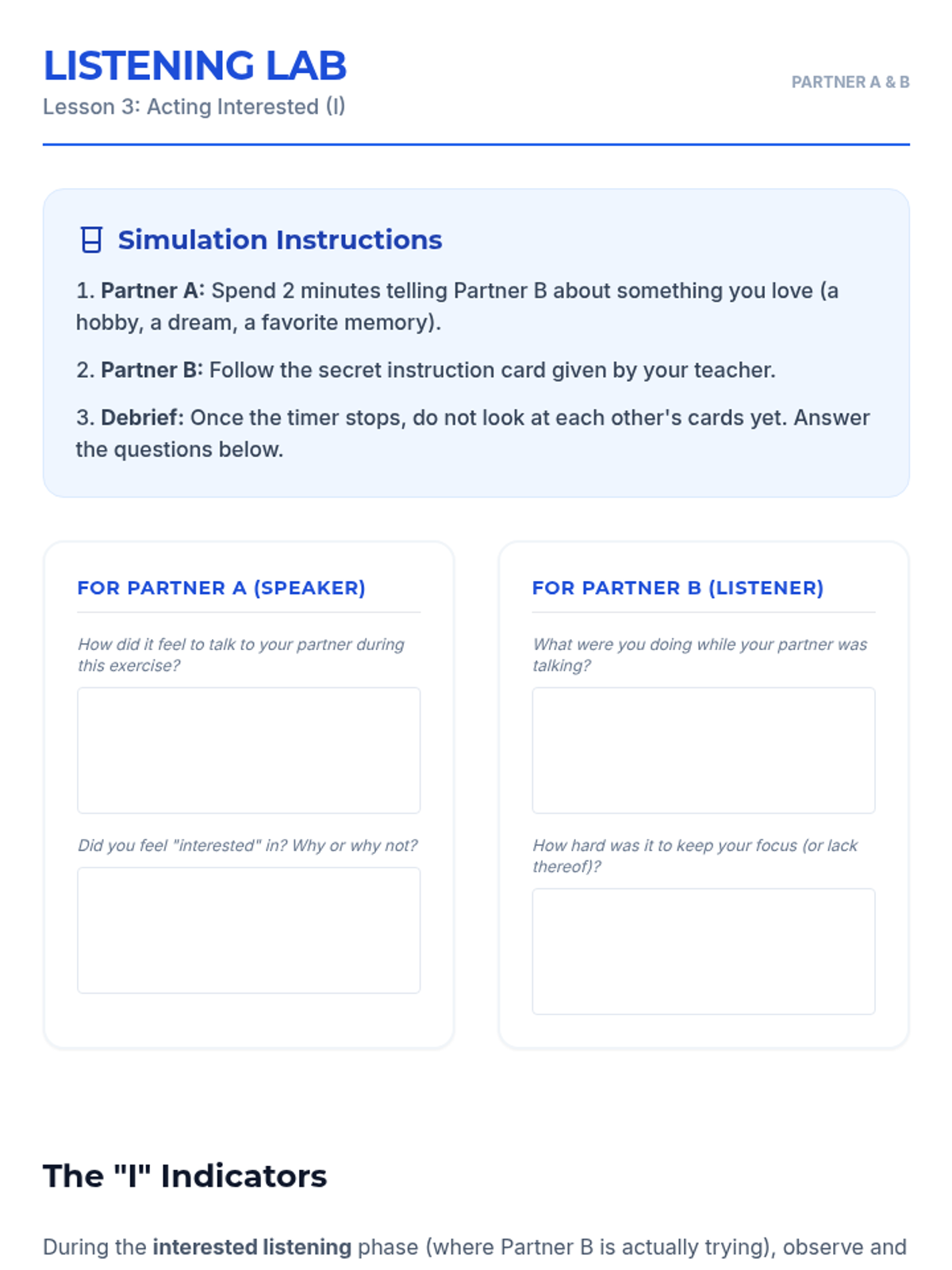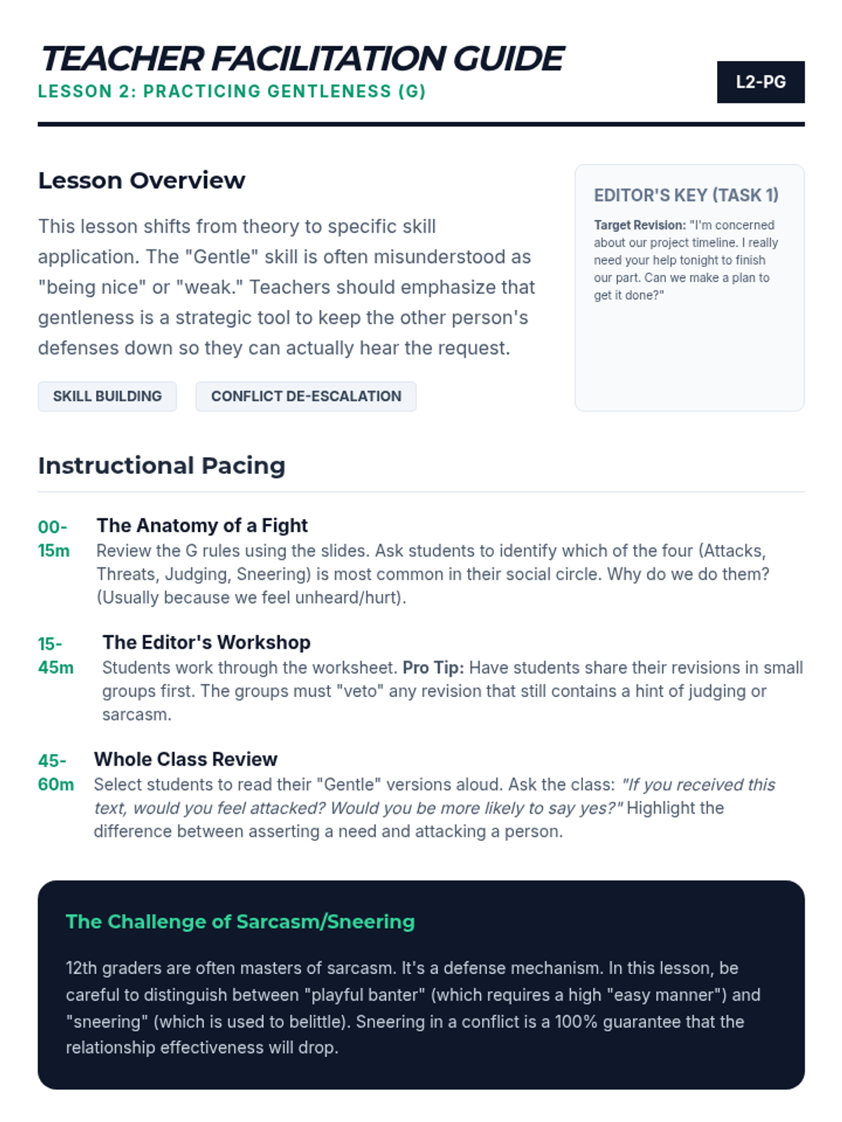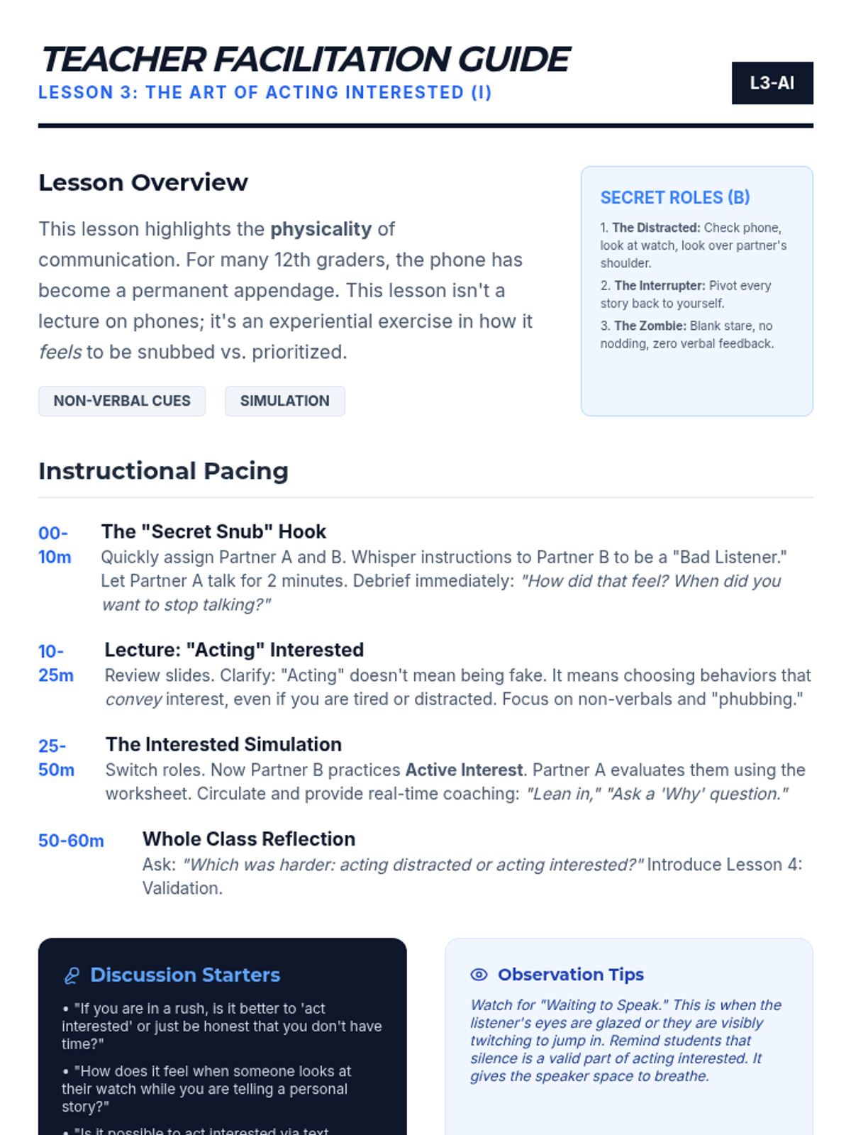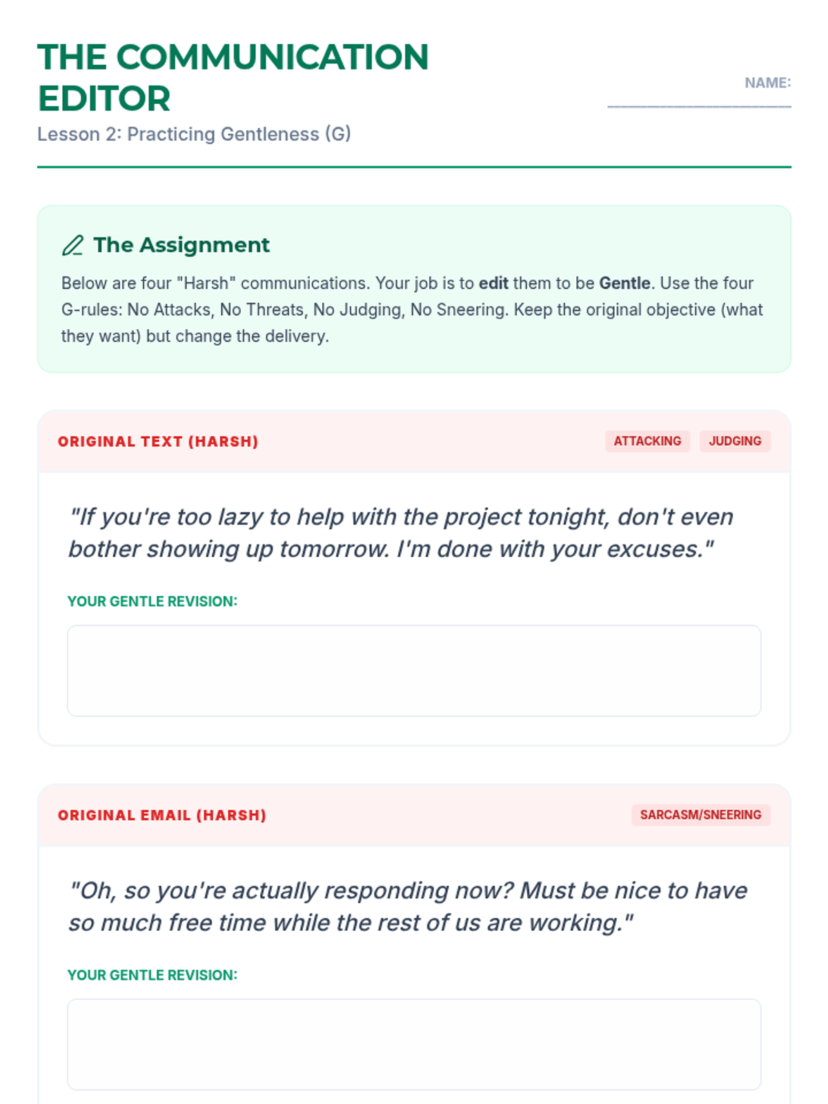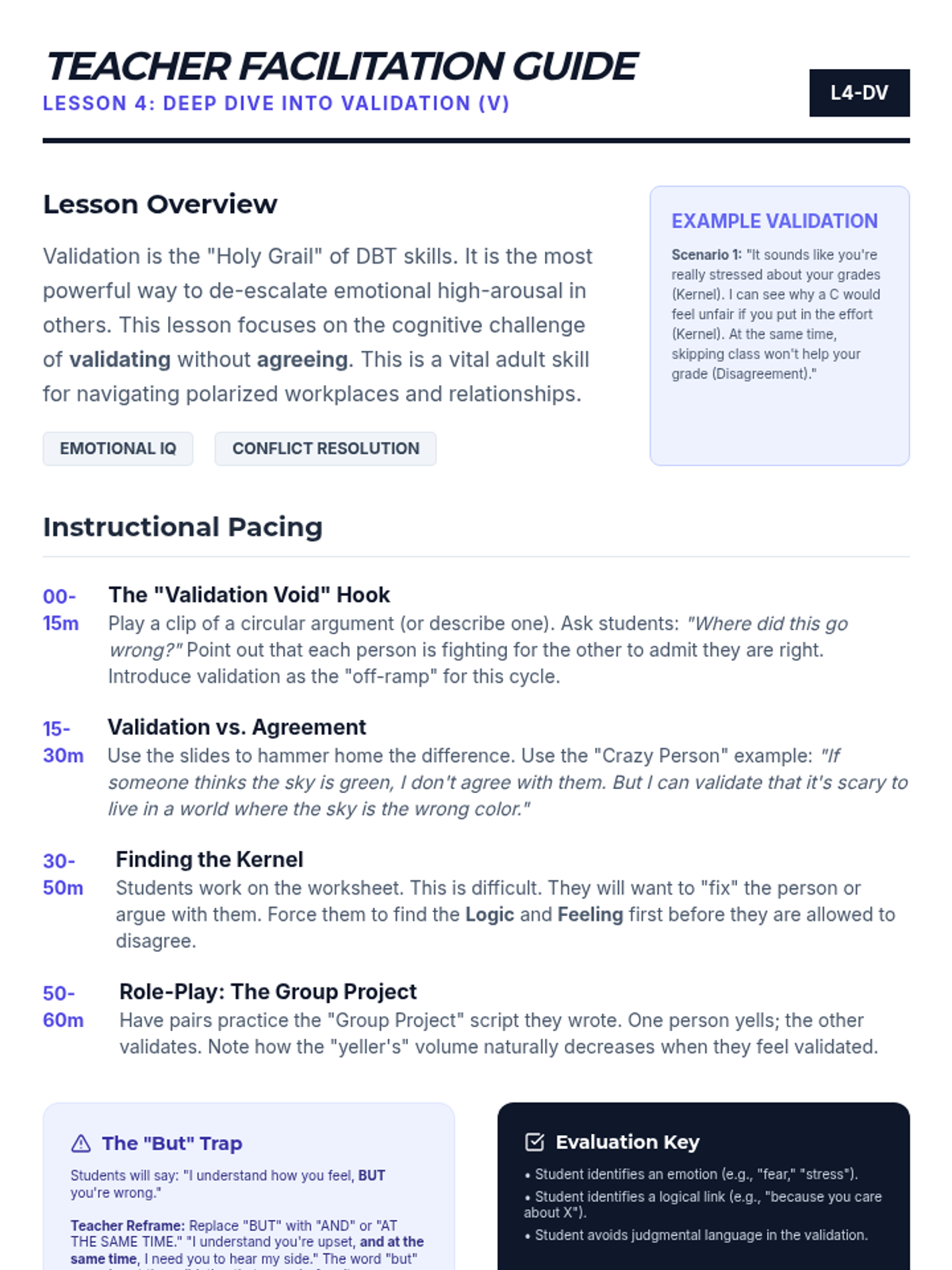 A 5-lesson sequence for 12th graders focused on the DBT GIVE skills (Gentle, Interested, Validate, Easy manner). Students learn to balance interpersonal objectives with relationship maintenance through self-reflection, skill-building workshops, and simulated practice.