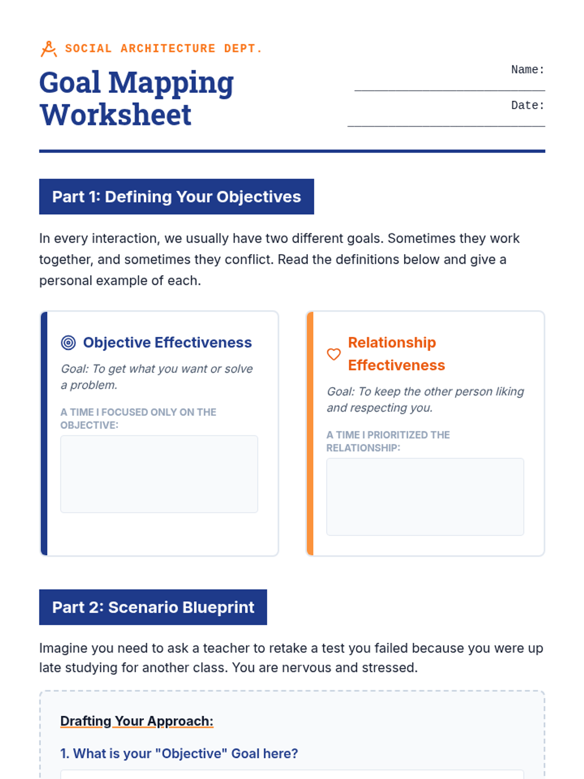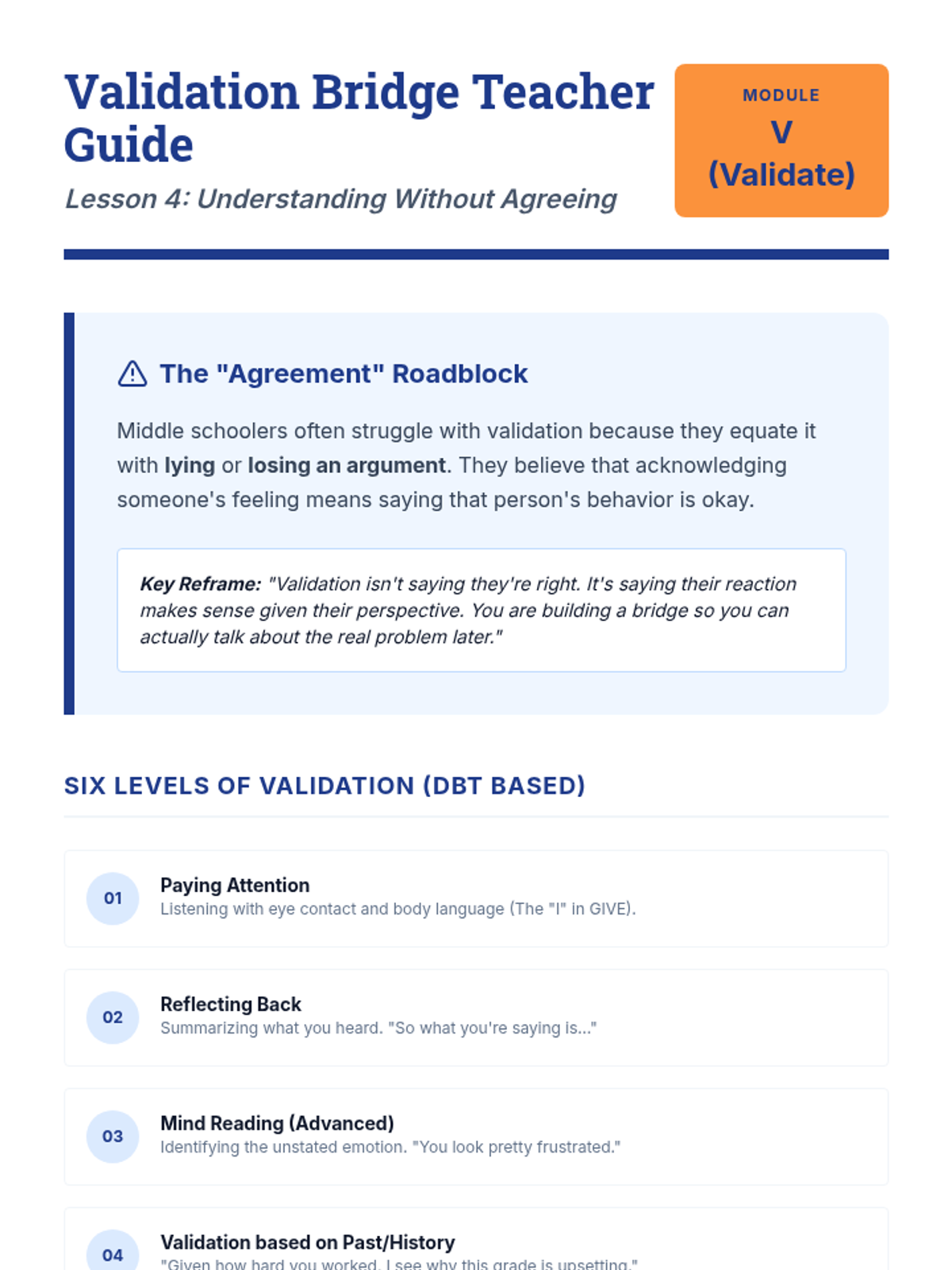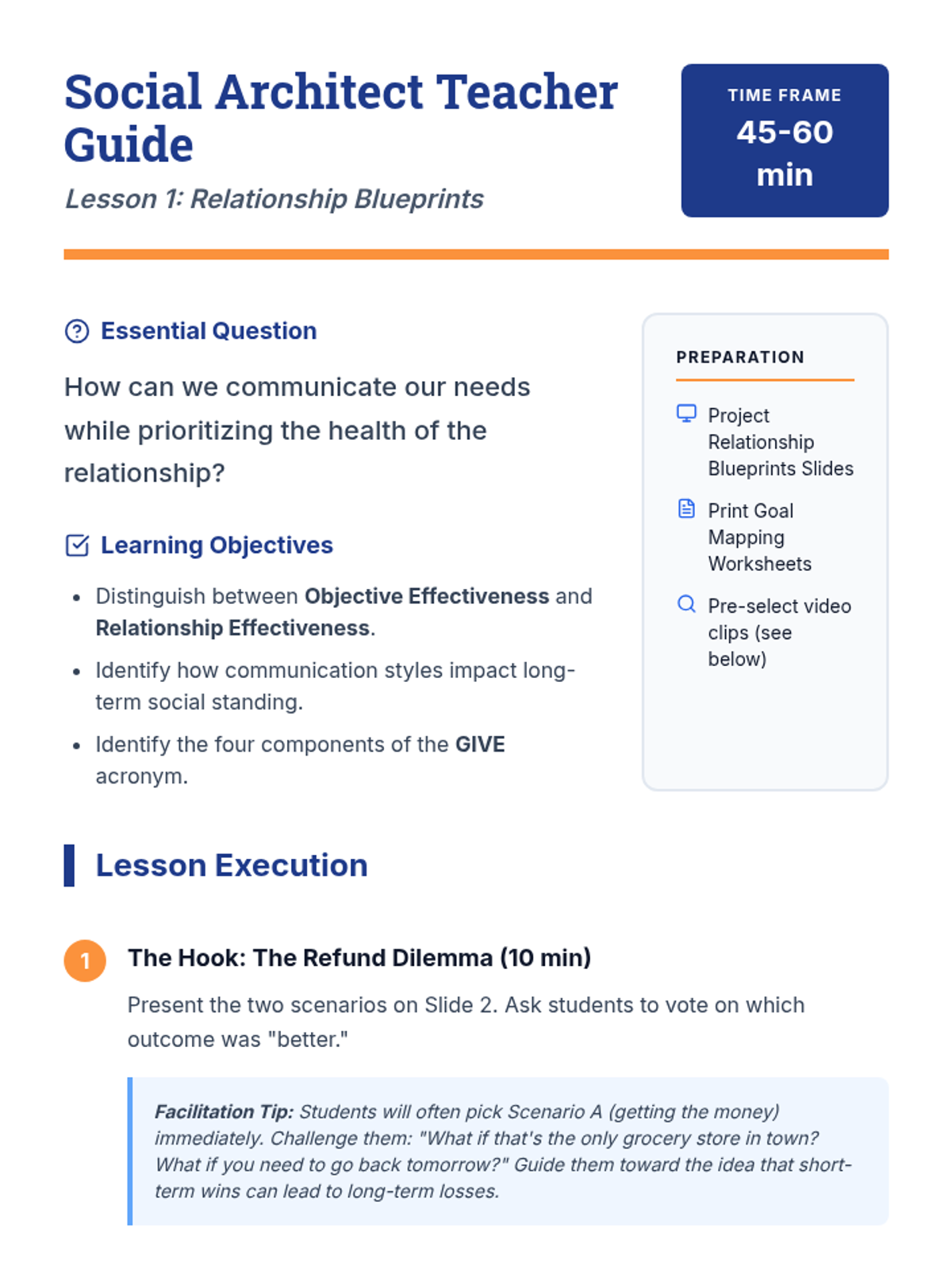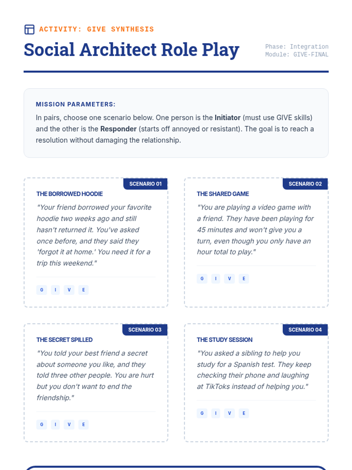 This 8th-grade sequence introduces Interpersonal Effectiveness through the GIVE acronym (Gentle, Interested, Validate, Easy manner). Students learn to balance personal objectives with relationship health through workshops, simulations, and role-plays.