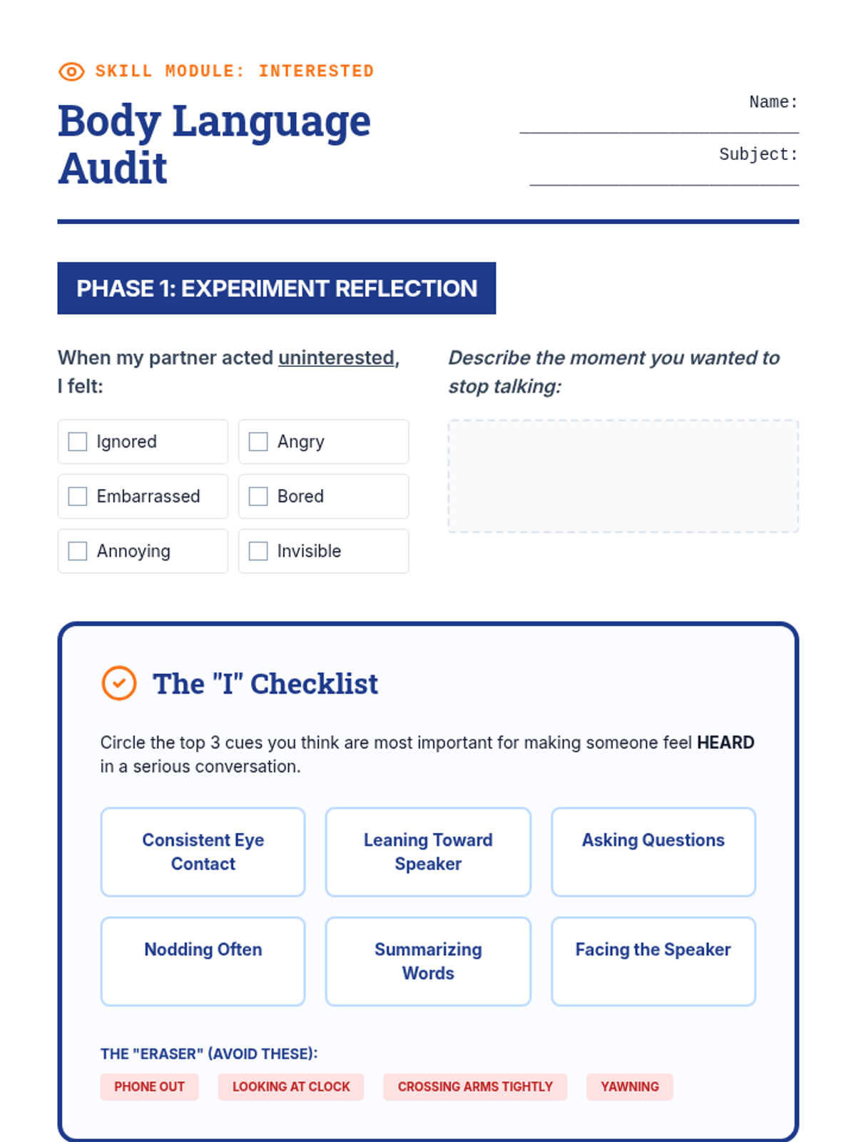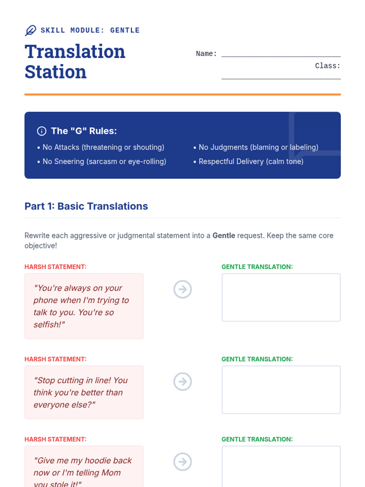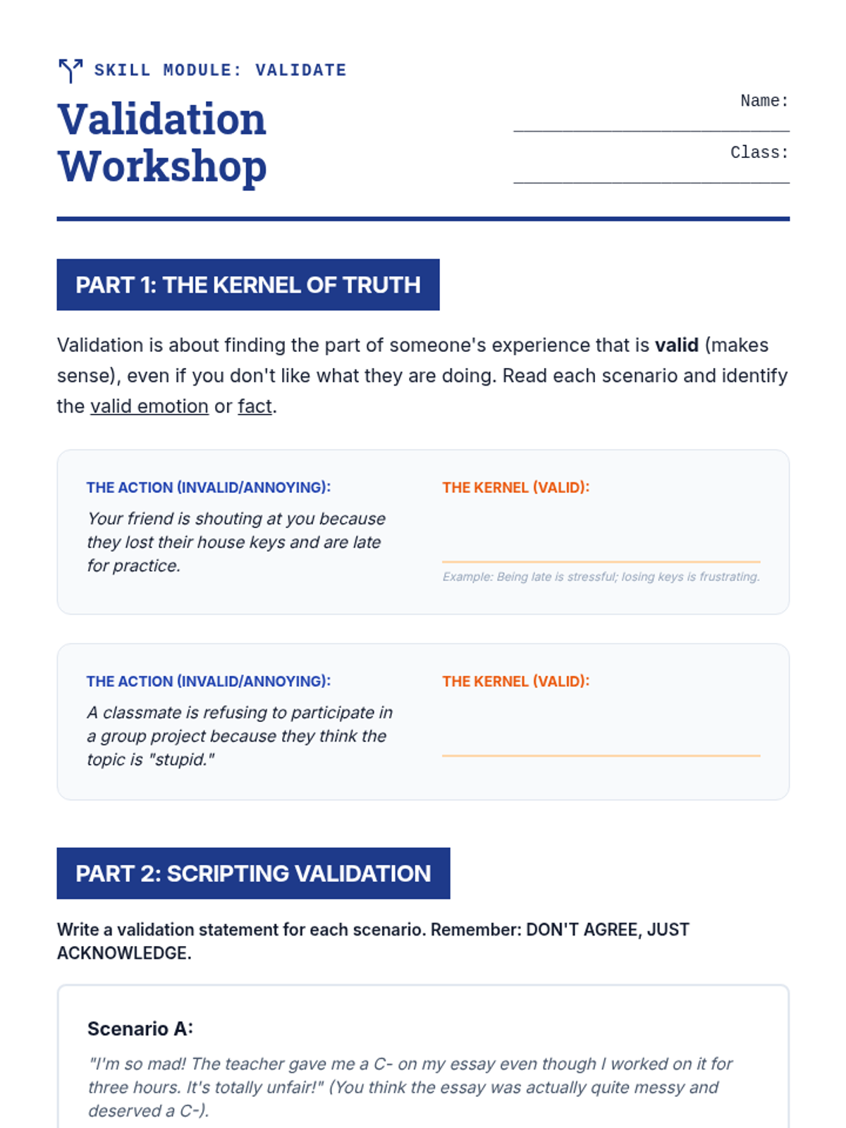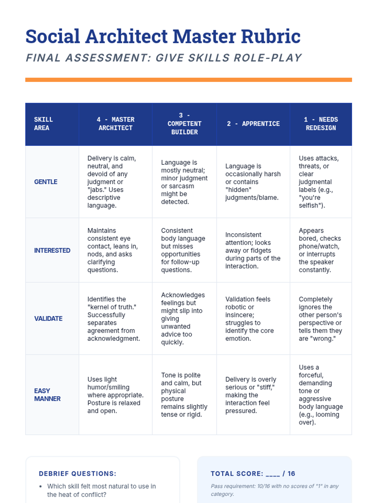 This 8th-grade sequence introduces Interpersonal Effectiveness through the GIVE acronym (Gentle, Interested, Validate, Easy manner). Students learn to balance personal objectives with relationship health through workshops, simulations, and role-plays.