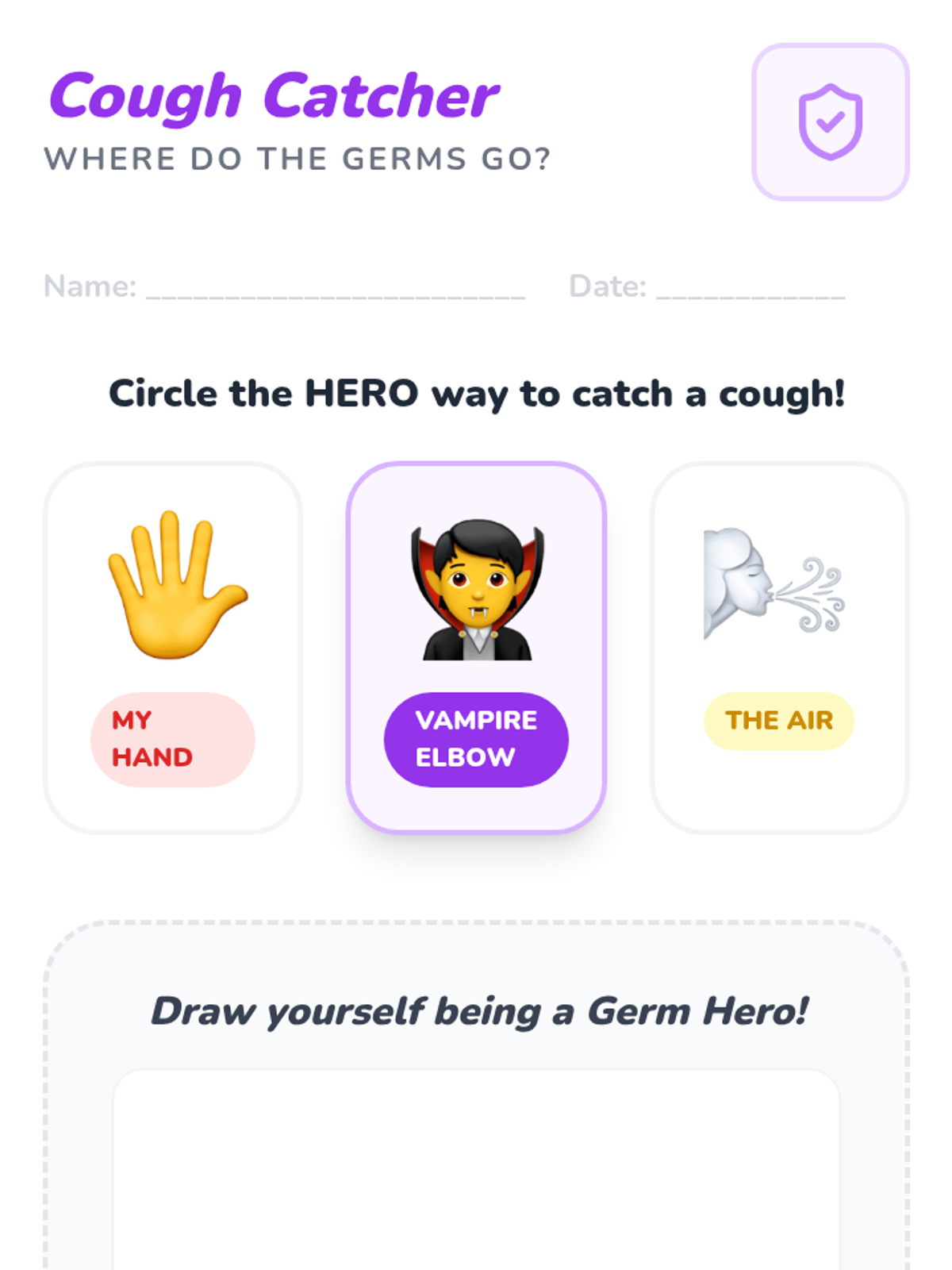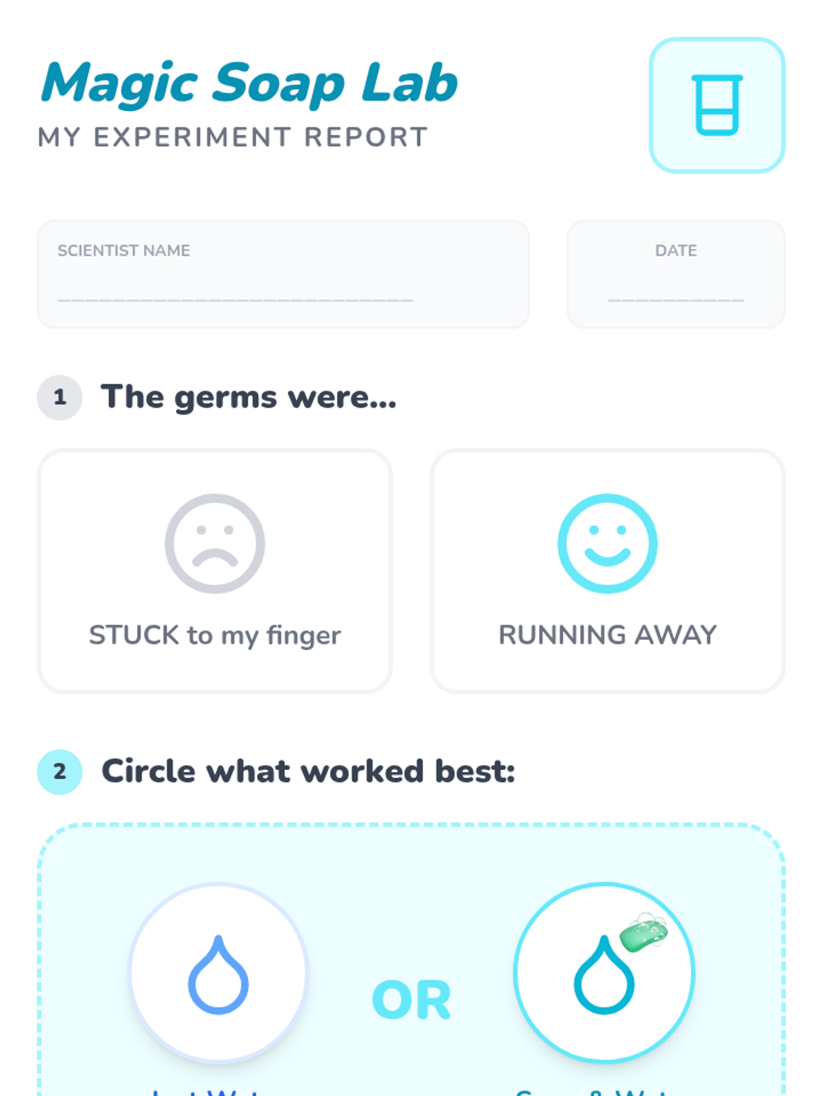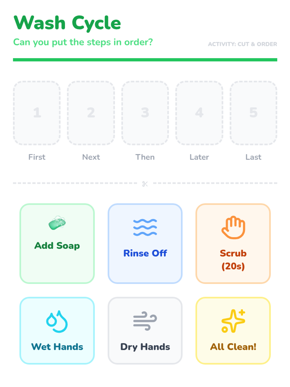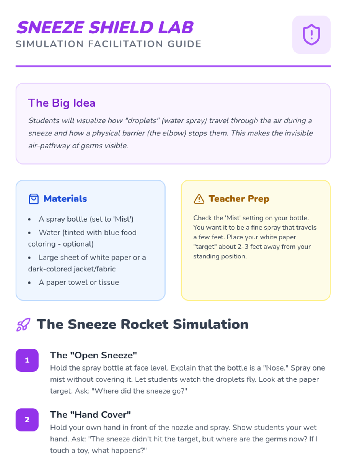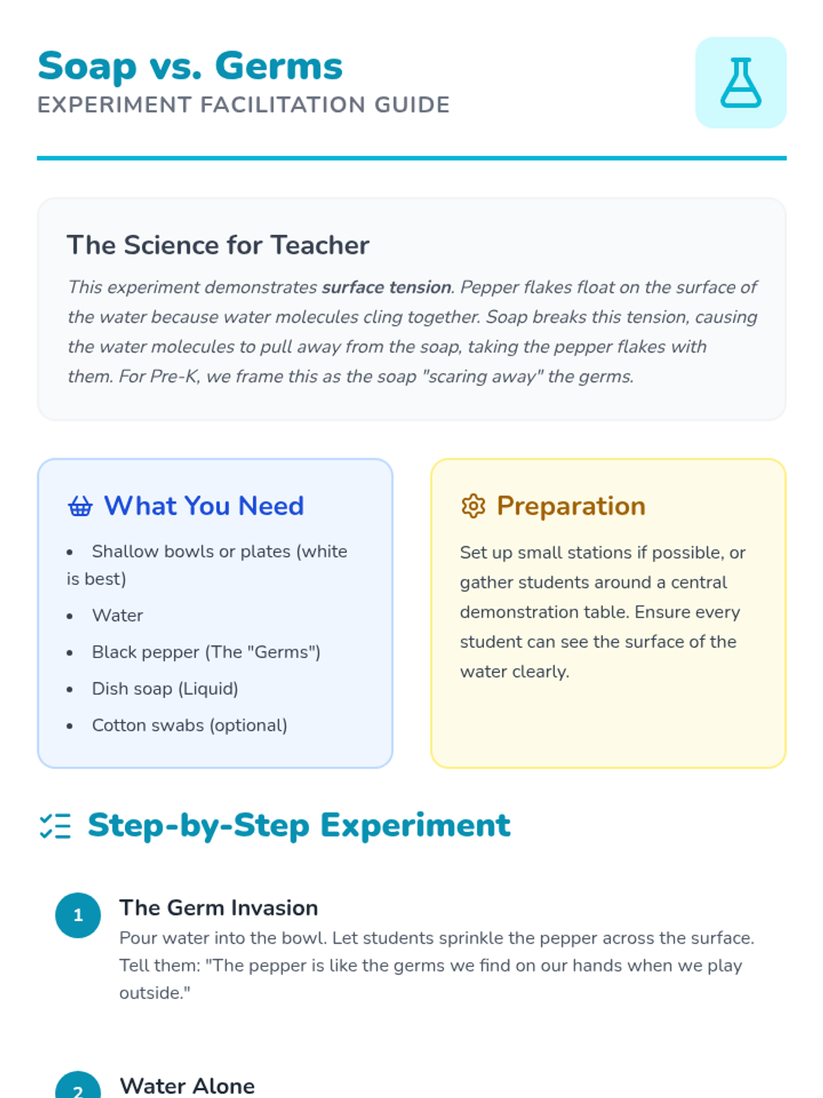 A sensory-rich Pre-K sequence introducing germs and hand hygiene through simulations, experiments, and routine building. Students progress from visualizing germ spread to mastering effective handwashing and respiratory etiquette.