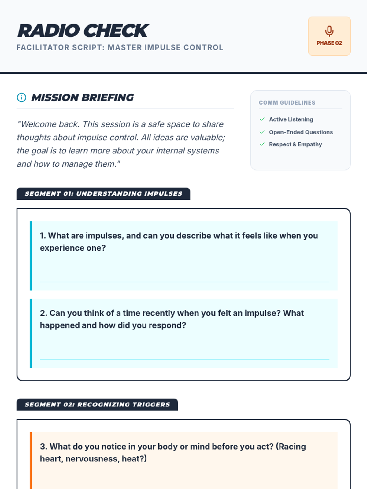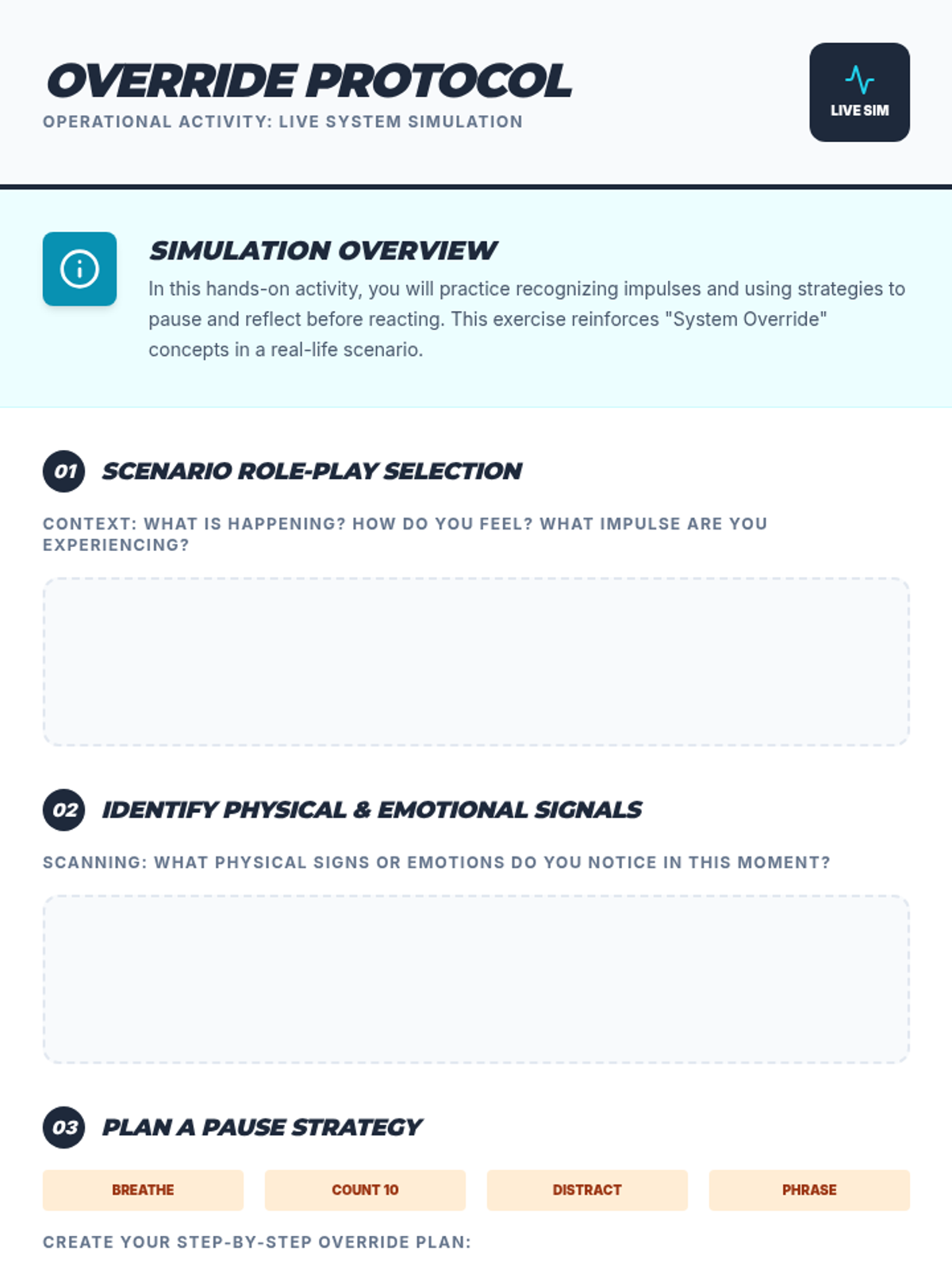 A two-session sequence designed for 7th-grade students to understand the nature of impulses and develop practical self-regulation strategies. The lessons focus on recognizing triggers and applying 'system override' techniques to manage behavior effectively.