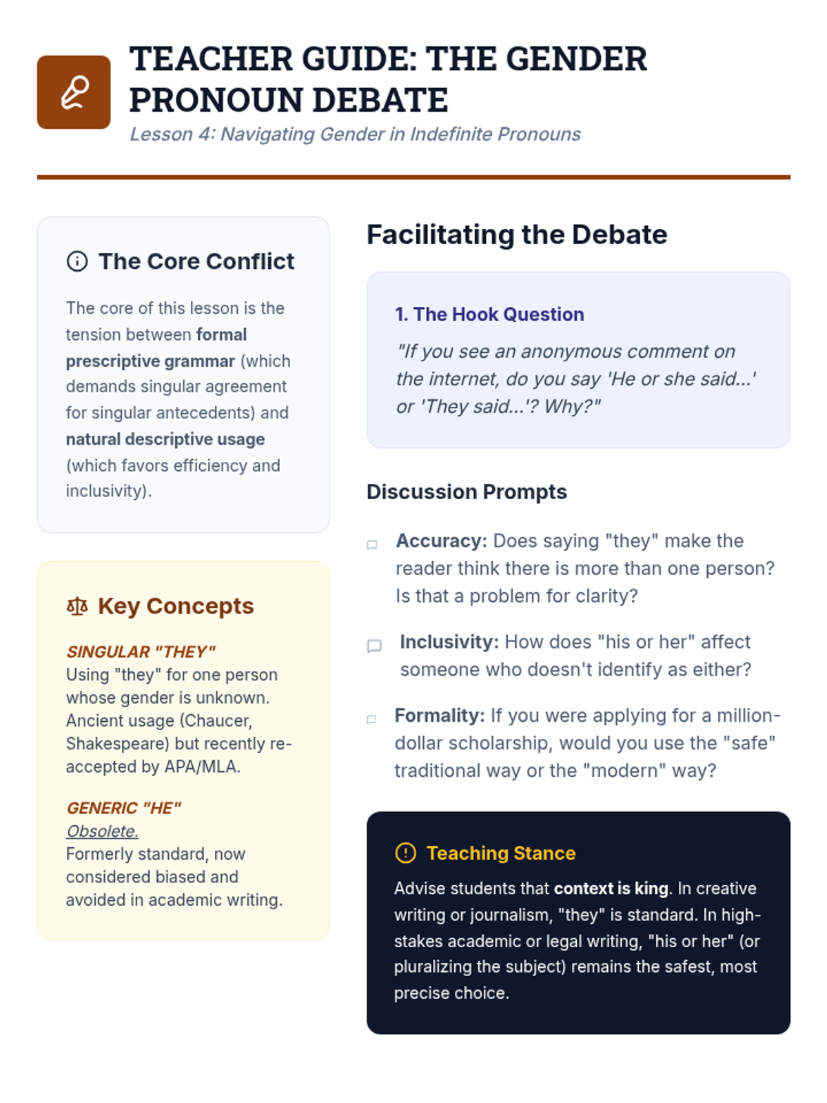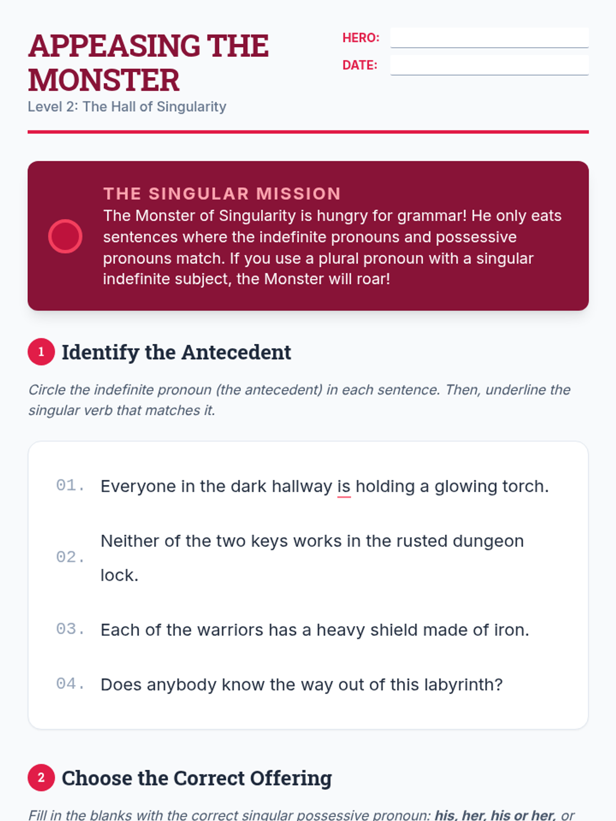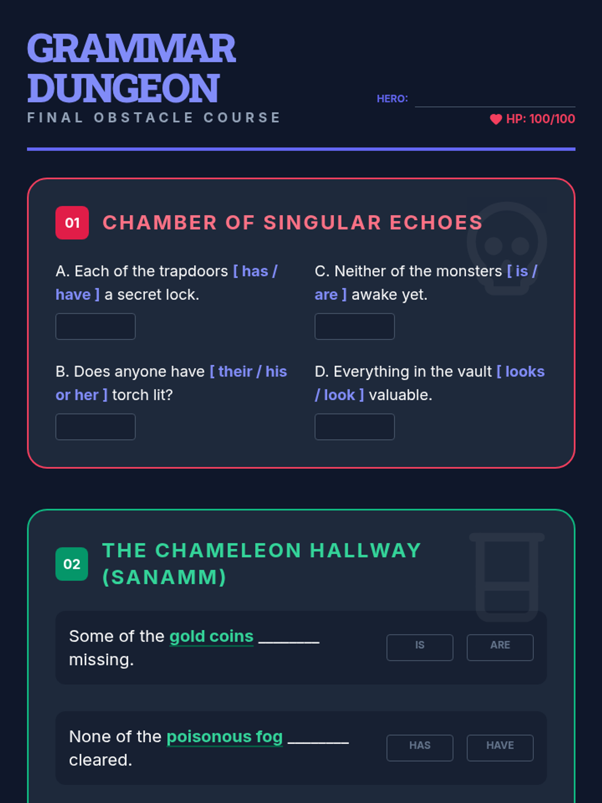 A gamified sequence designed for 6th-grade students to master indefinite pronoun agreement. Through a 'Grammar Dungeon' theme, students categorize pronouns, tackle the 'always singular' rule, analyze context-dependent pronouns, and navigate formal gender conventions.
