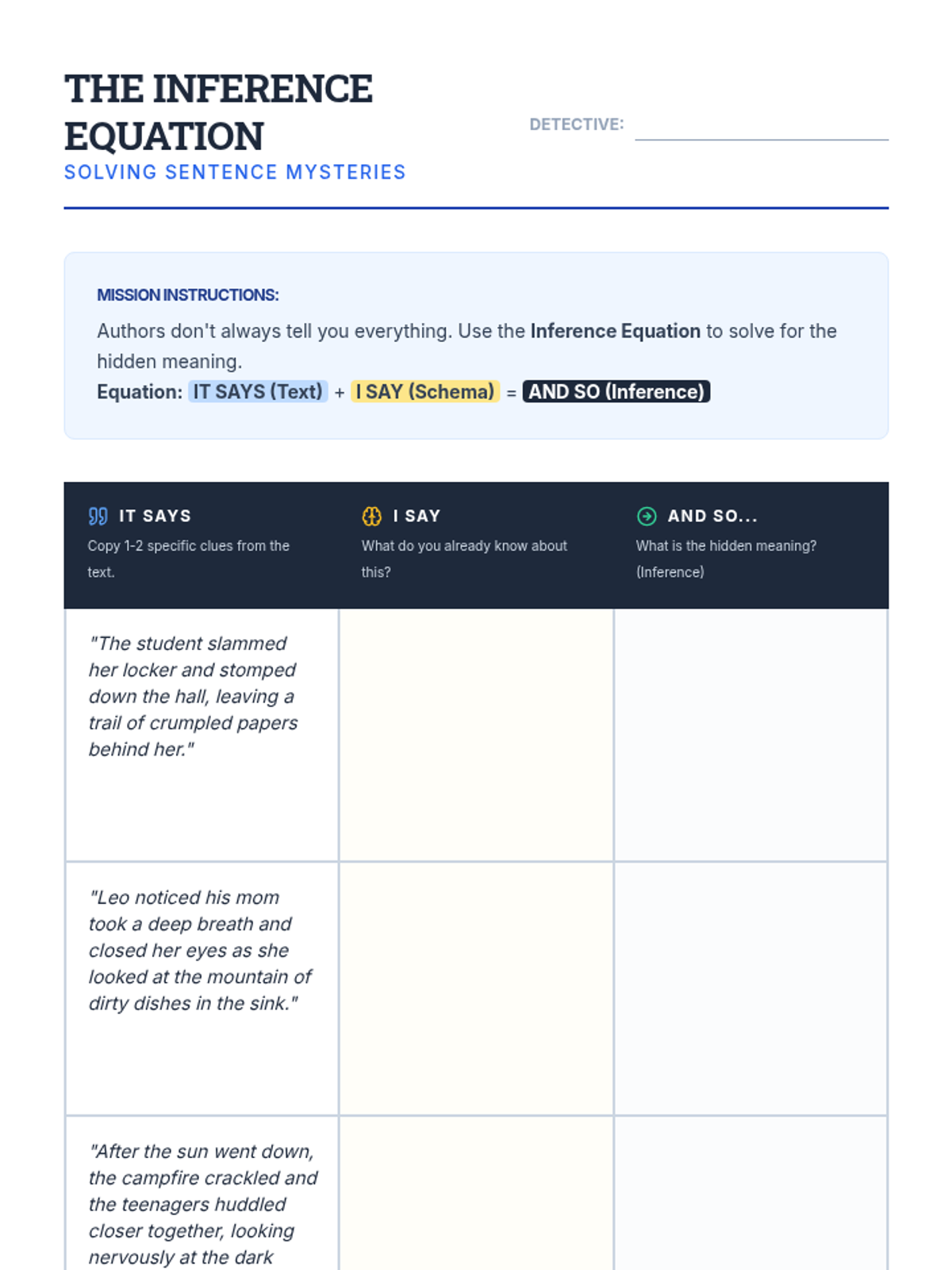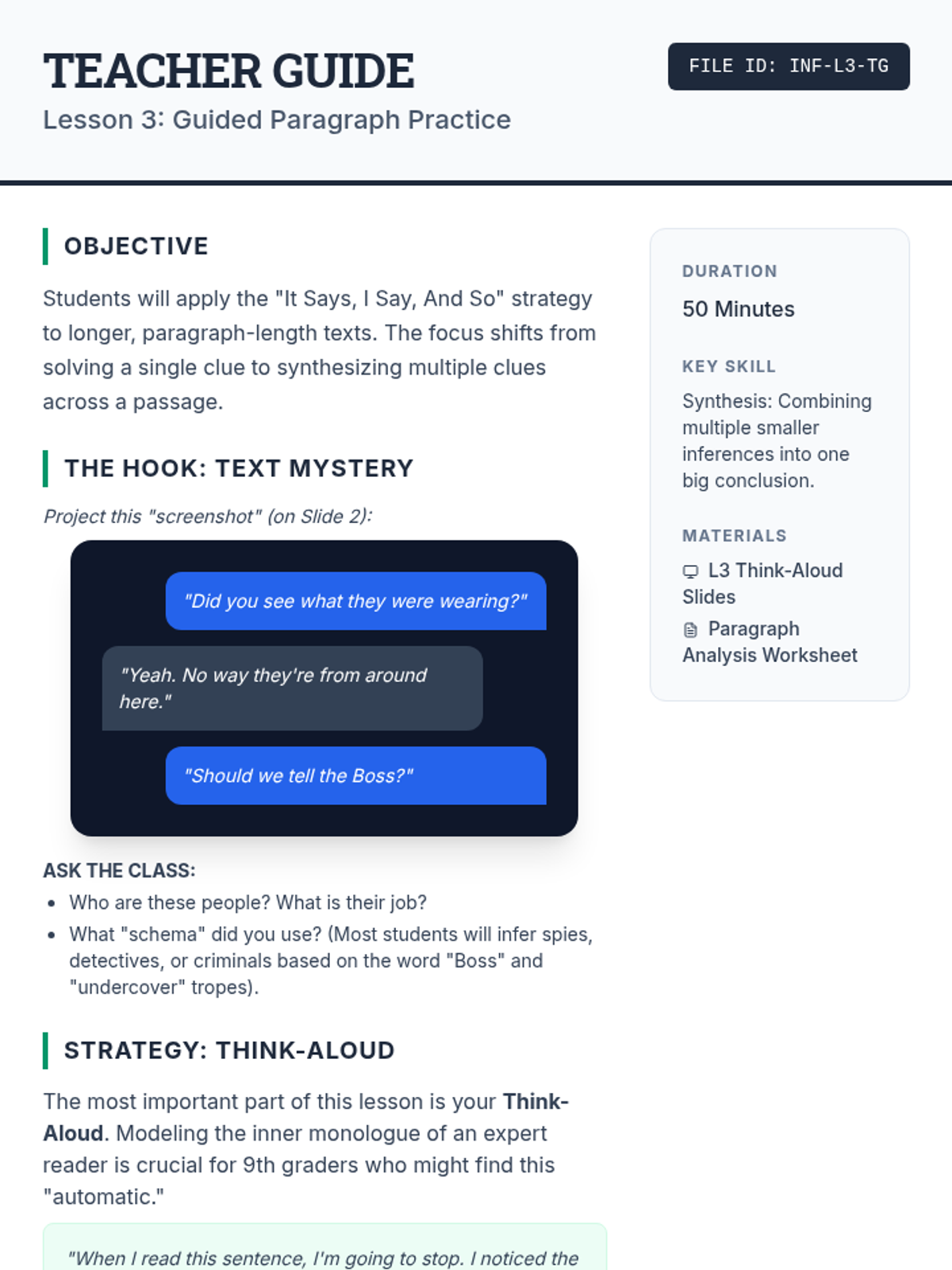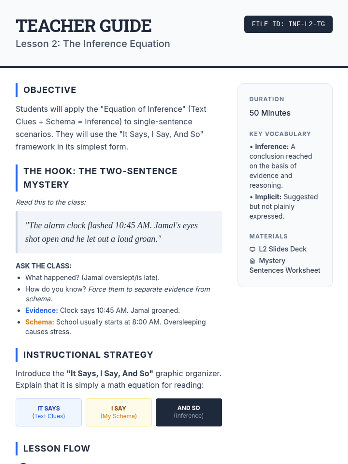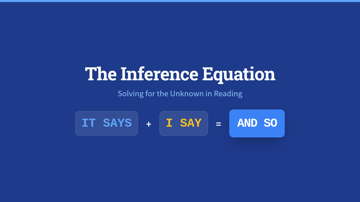 A 5-lesson sequence for 9th-grade students focusing on the mechanical construction of inferences using the 'It Says, I Say, And So' framework. Students learn to combine textual evidence with background knowledge (schema) to create new meaning, moving from sentence-level work to paragraph-level analysis and independent application.