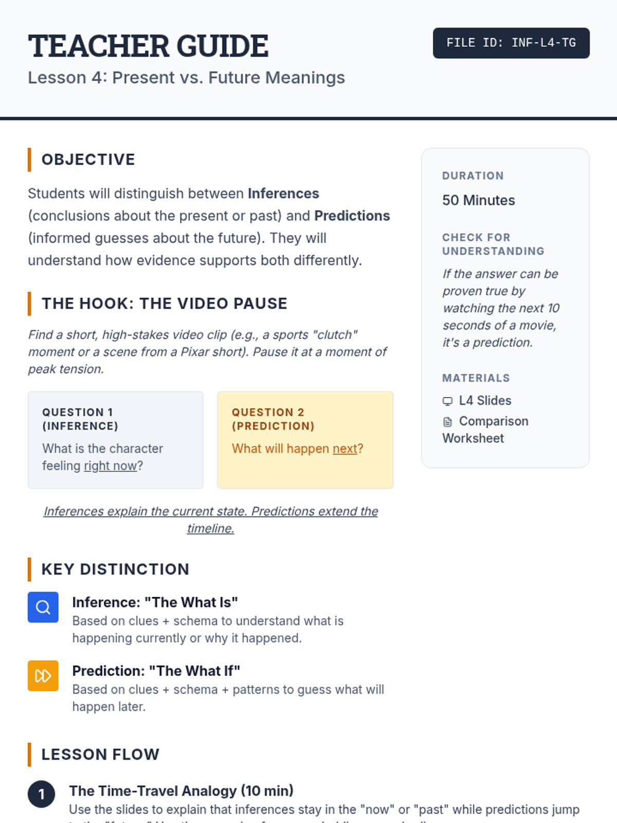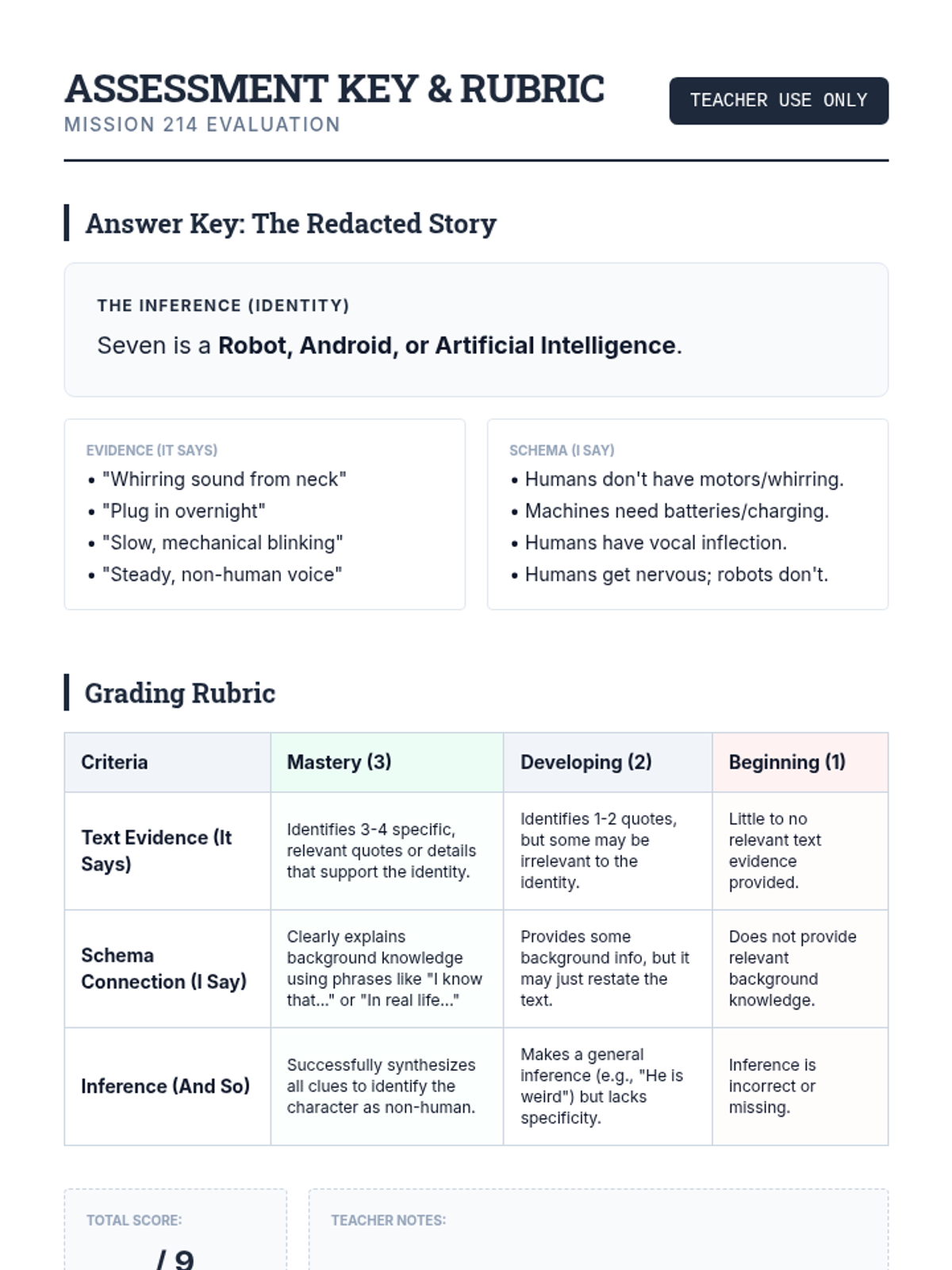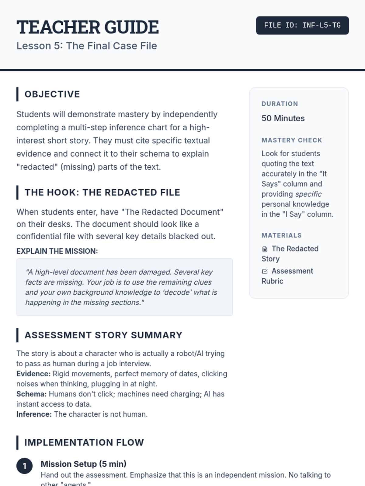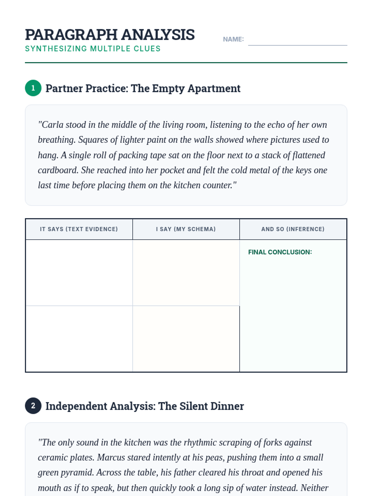 A 5-lesson sequence for 9th-grade students focusing on the mechanical construction of inferences using the 'It Says, I Say, And So' framework. Students learn to combine textual evidence with background knowledge (schema) to create new meaning, moving from sentence-level work to paragraph-level analysis and independent application.